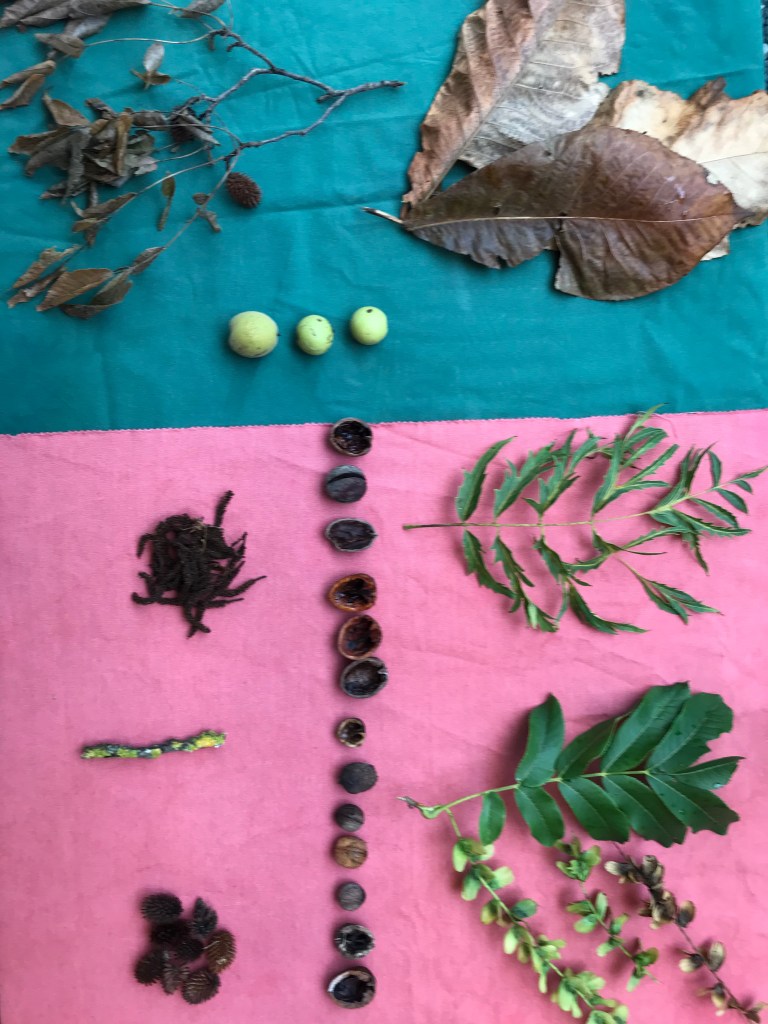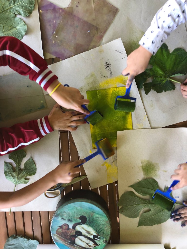 Une journée d’atelier avec les classes de CM1-CM2 des écoles des alentours. Encre Brou de noix et ocre sur papier de mûrier.