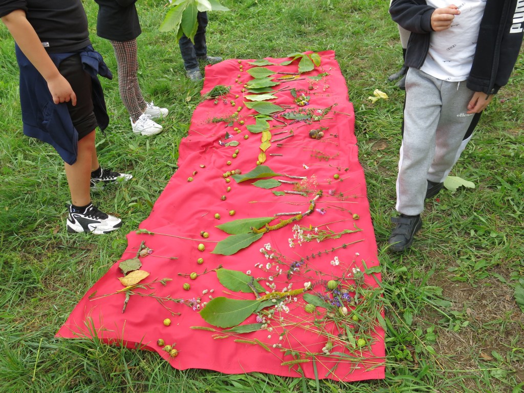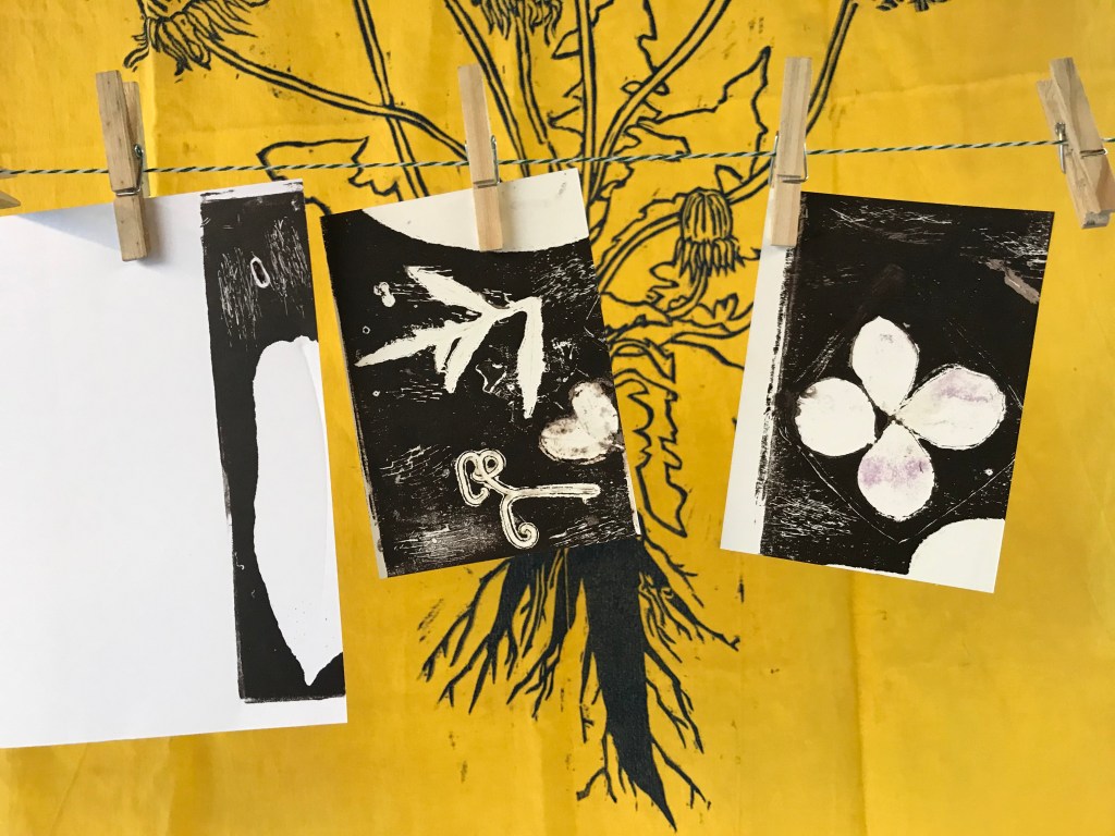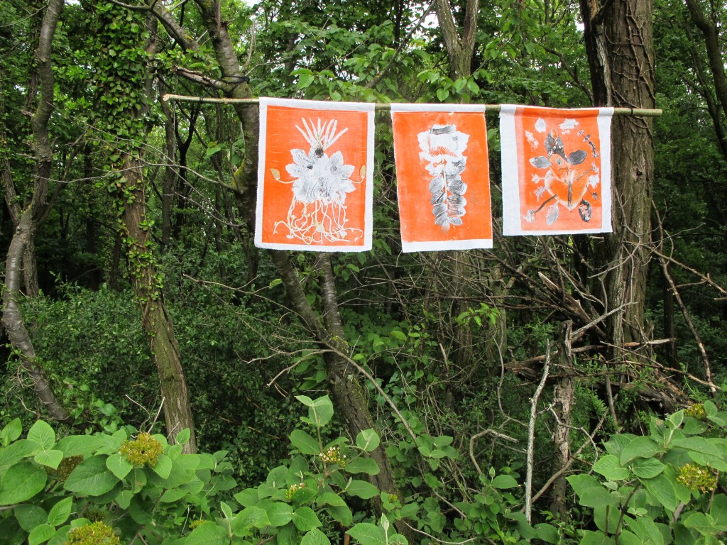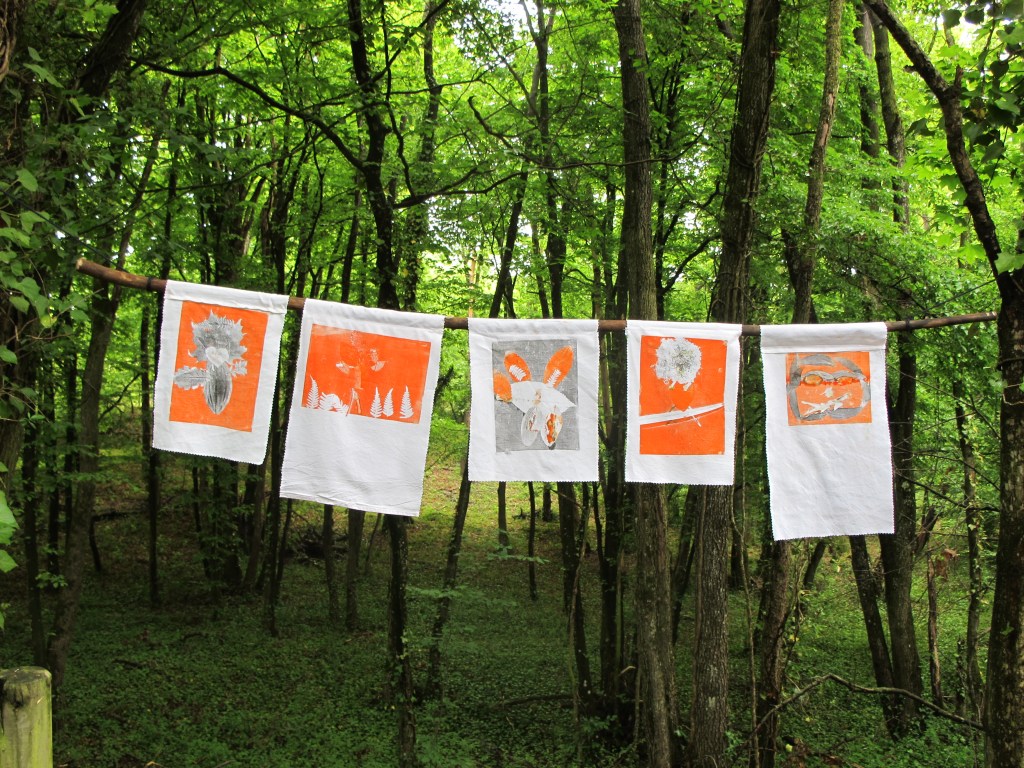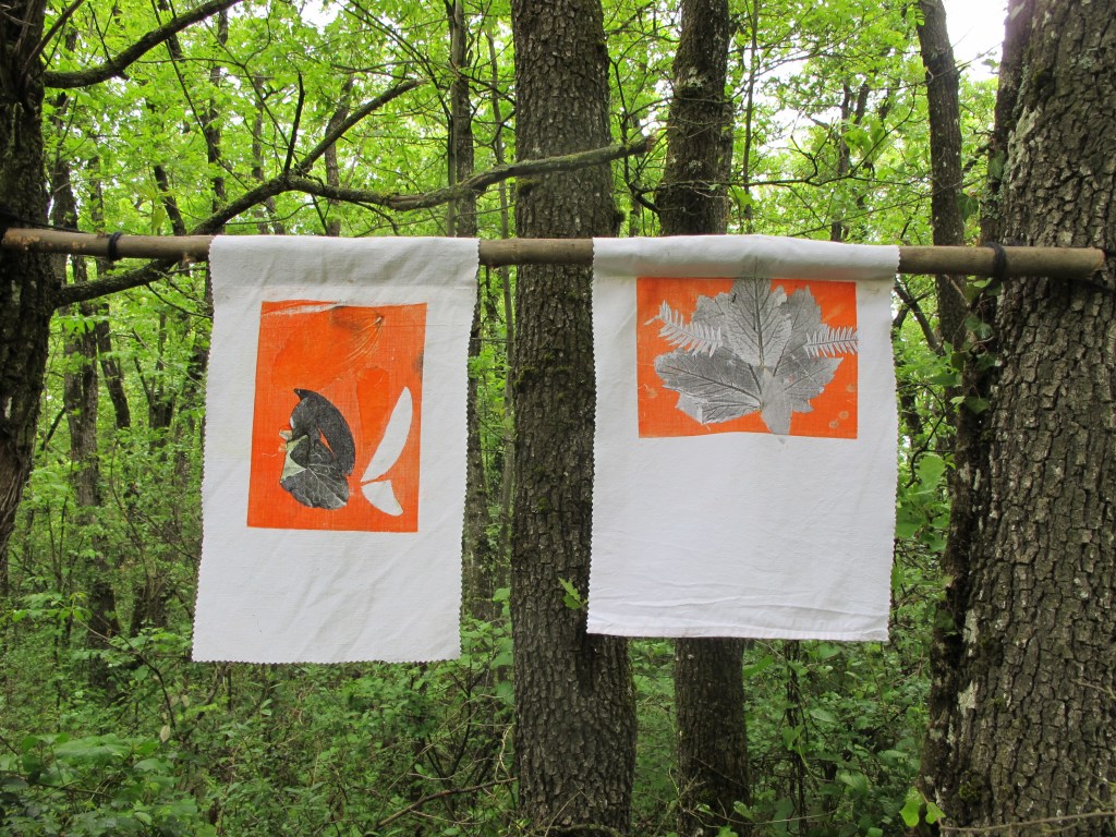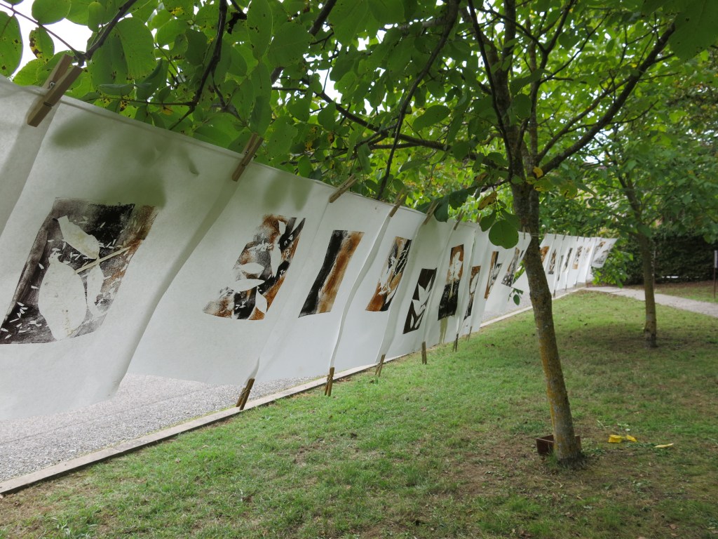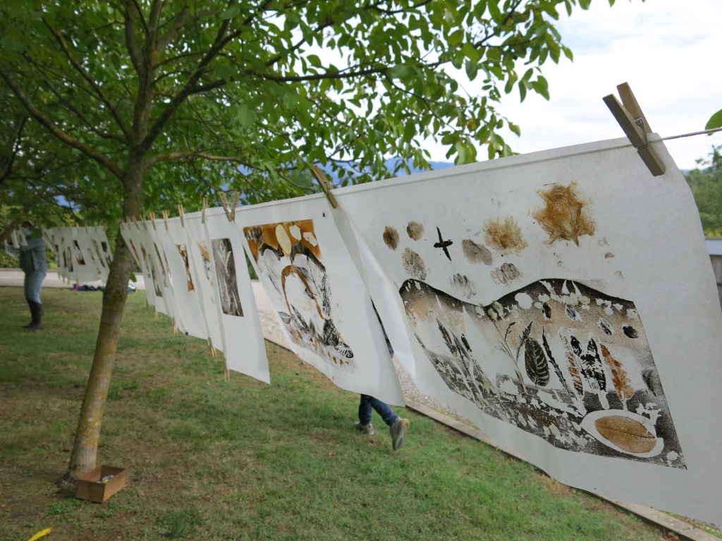 Balade récoltes, ateliers, composition et impression en monotype sur textile! L’ensemble des réalisations fut visible un mois durant sur le long du sentier.