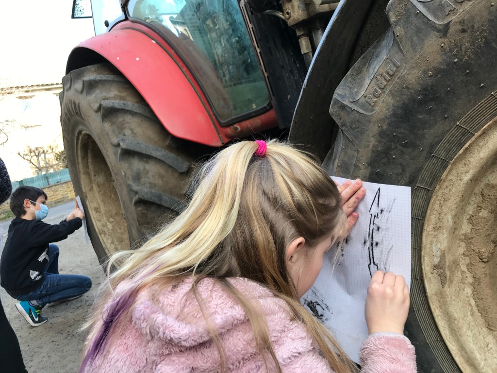 La Burle souffle fort sur le plateau de l’Aubrac. Nous avons remonté nos écharpes et avons passé quelques heures au creux de la vieille grange à l’orée du village. Munis de rouleaux encreurs, de pointes de graphite et de pinceaux brosses nous avons appliqué un papier japonais sur les murs. Nos outils nous ont permis de révéler de nombreuses gravures dont nous ignorions les présences. Il semblerait que les pierres de l’église soient aussi ornées de quelques signes mystérieux et madame le Maire nous a donné rendez-vous pour que nous puissions en récupérer les empreintes. Sous le préau de l’école l’autre groupe a entamé l’assemblage du plancher. C’est une grande estrade qui bientôt sera recouverte d’une multitudes de signes en creux. À notre retour nous accrocherons sur les murs de la classe l’ensemble de nos trouvailles.
