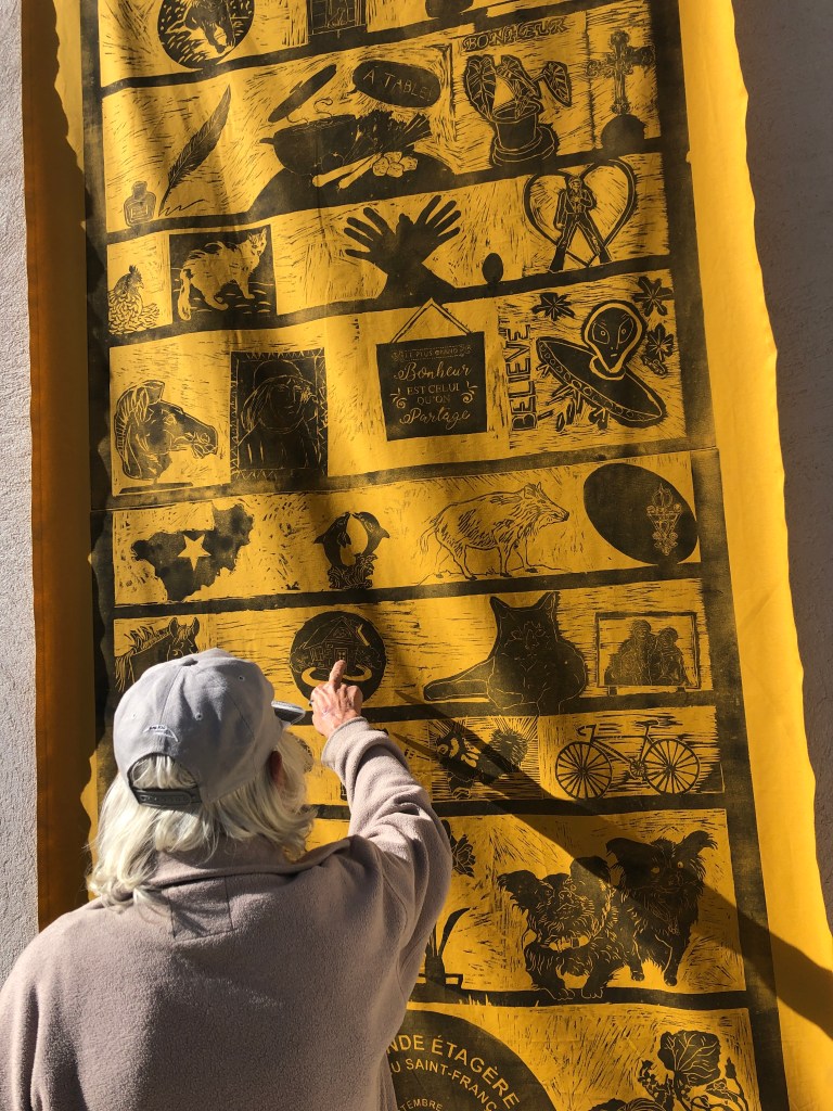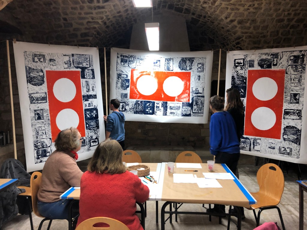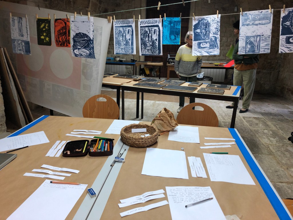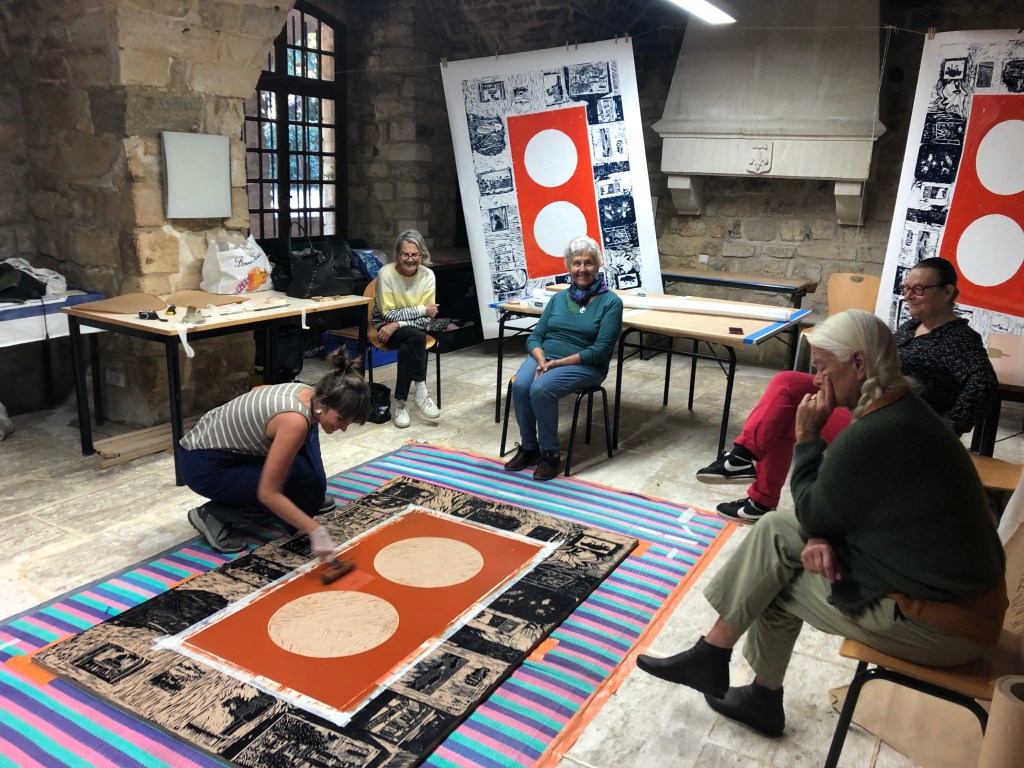 Du 21 octobre au 4 novembre 2022, l’Atelier a fait escale au Couvent des Cordeliers à Forcalquier : les outils déployés sous les voûtes de pierres, une grande matrice de bois gravée au fur et à mesure des rencontres avec les habitant·es et adhérent·es du centre social de la Cordelière.