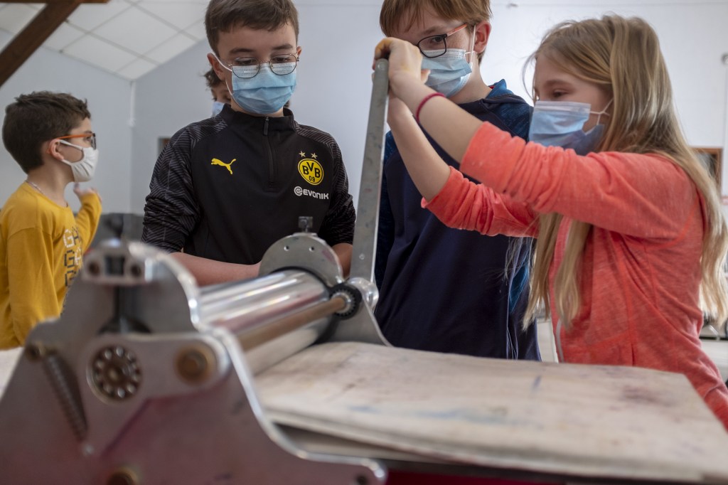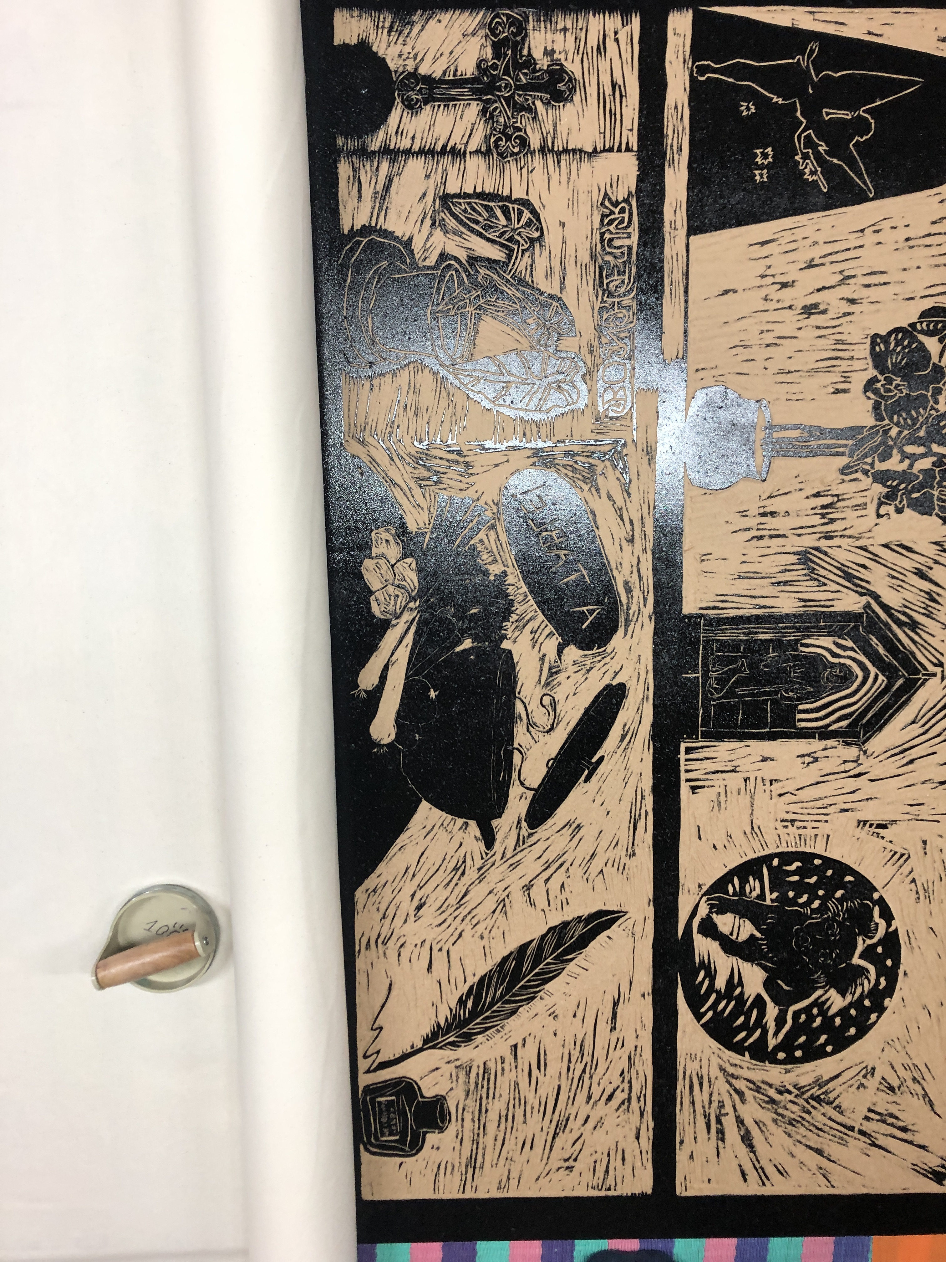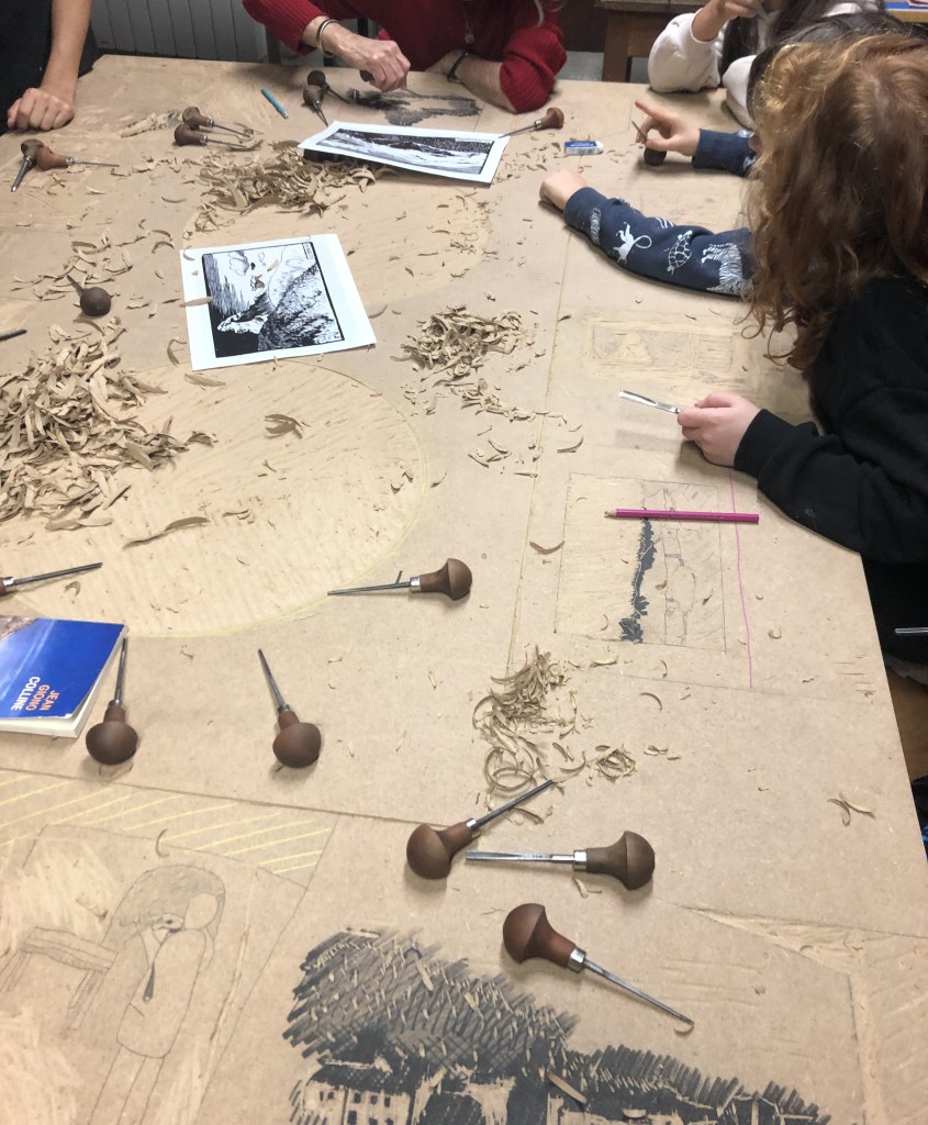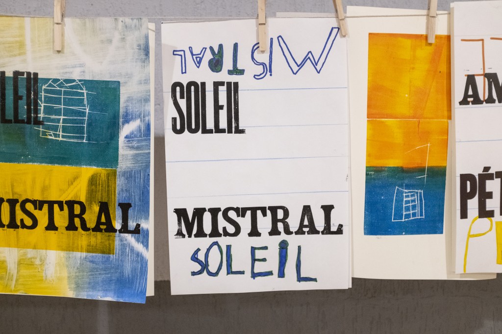 Du 21 octobre au 4 novembre 2022, l’Atelier a fait escale au Couvent des Cordeliers à Forcalquier : les outils déployés sous les voûtes de pierres, une grande matrice de bois gravée au fur et à mesure des rencontres avec les habitant·es et adhérent·es du centre social de la Cordelière.