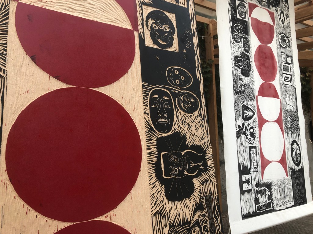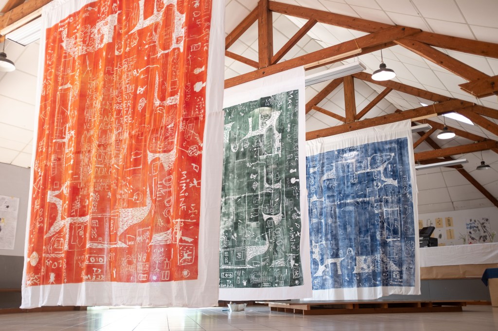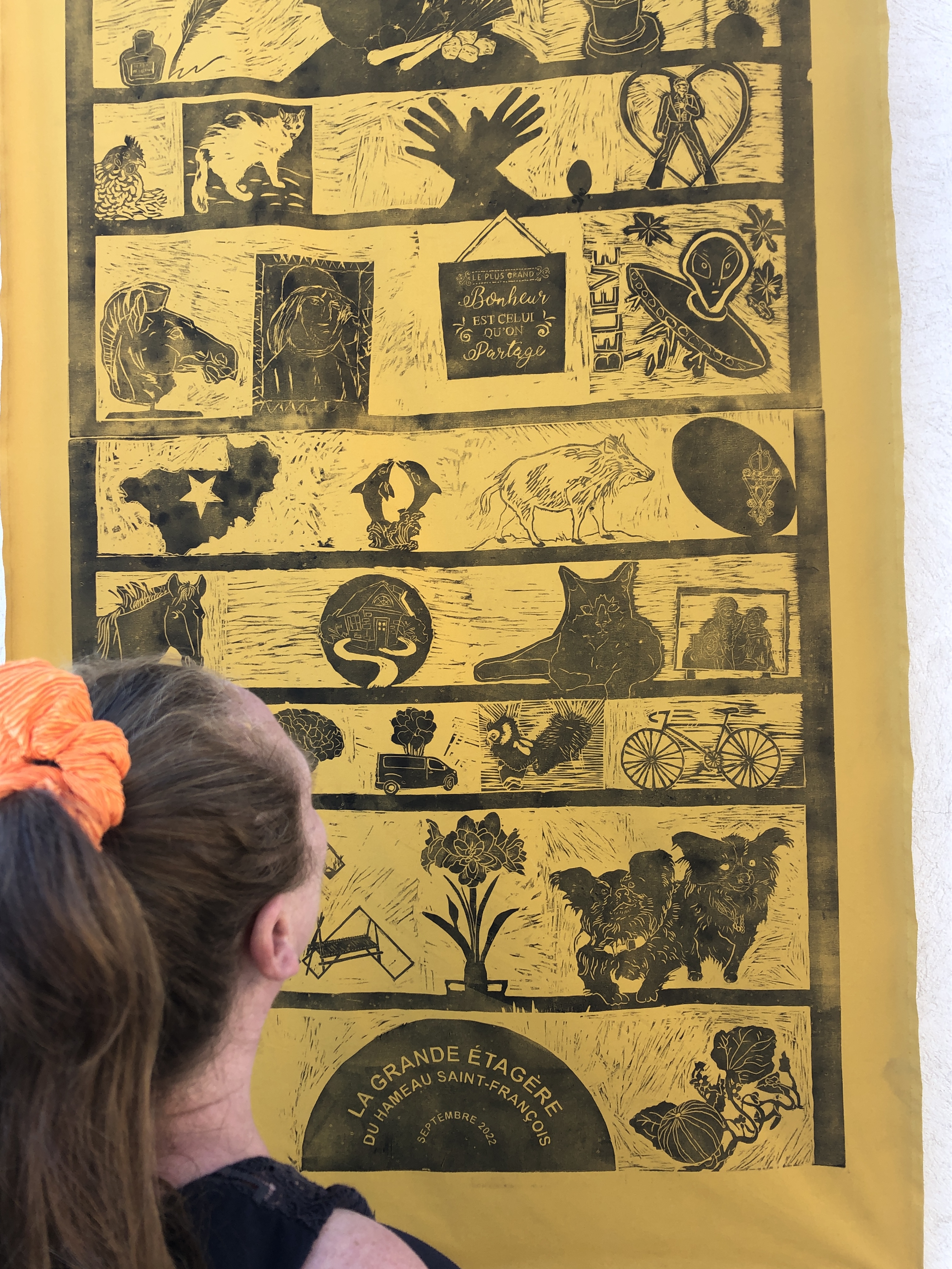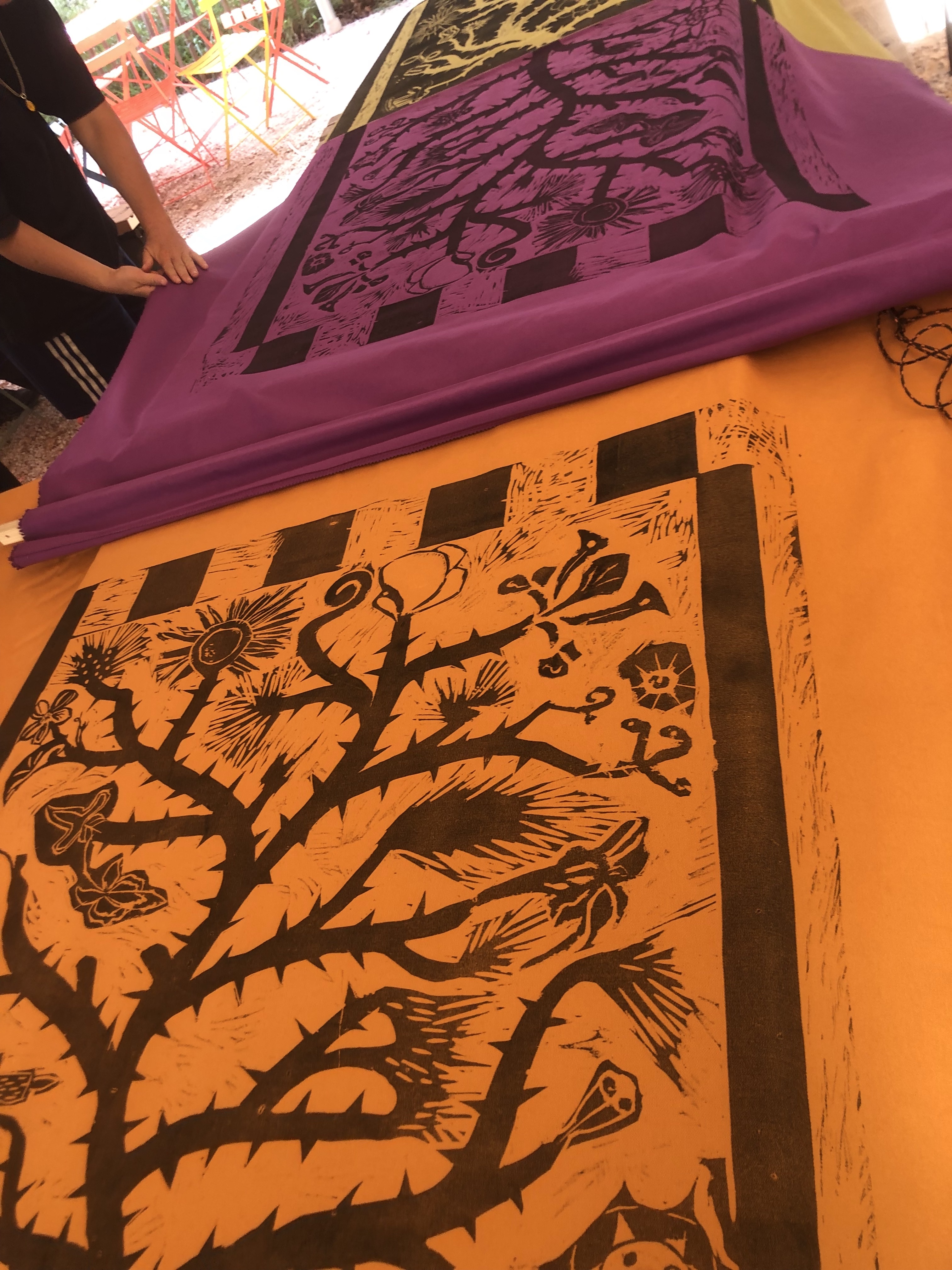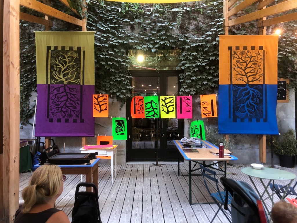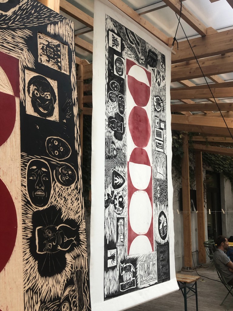 La grande matrice collective, une fois gravée fut ensuite encrée et imprimée sur deux grands kakémonos en tissus pour se joindre à l’ambiance festive et à la scénographie du lieu.