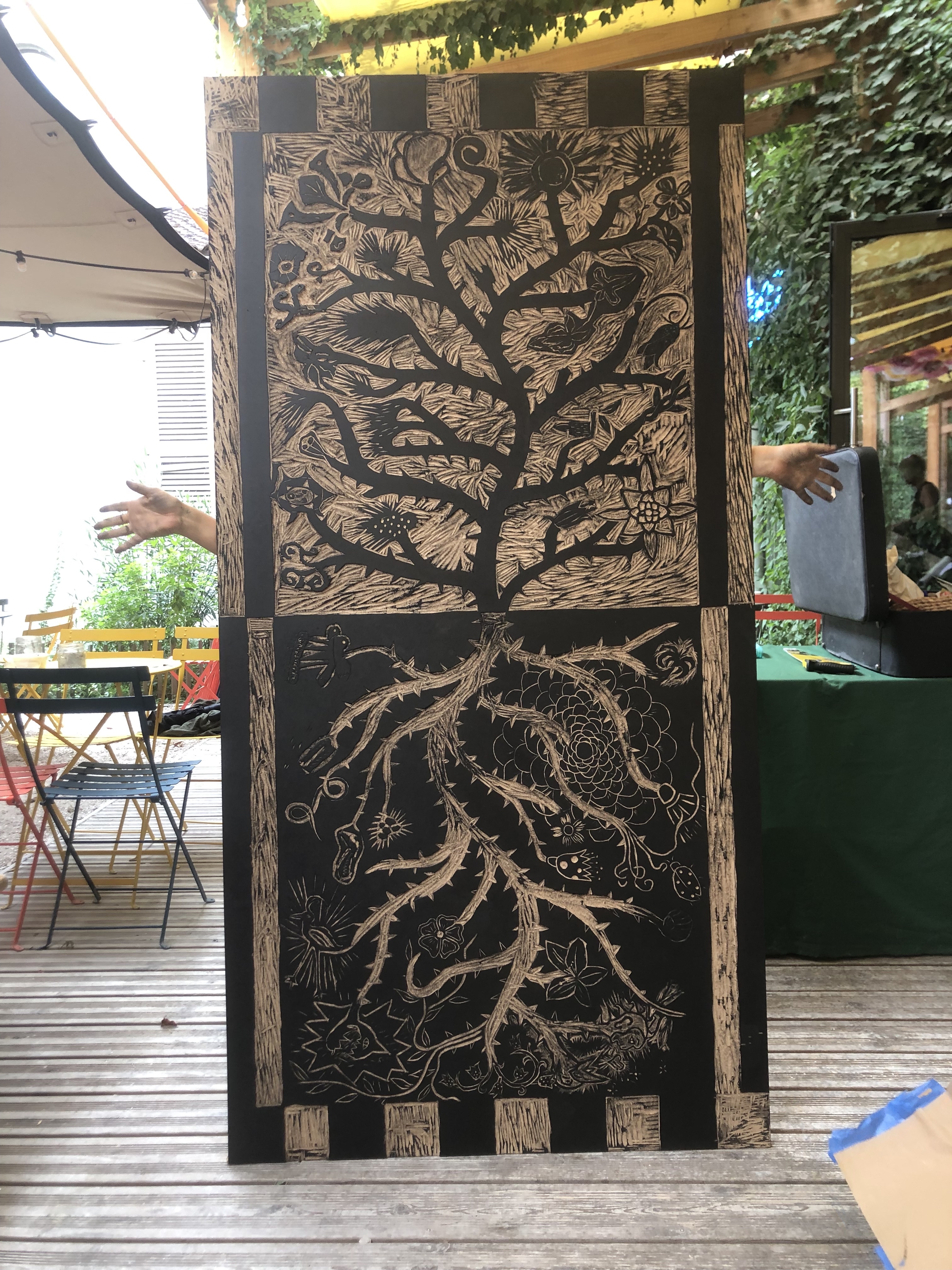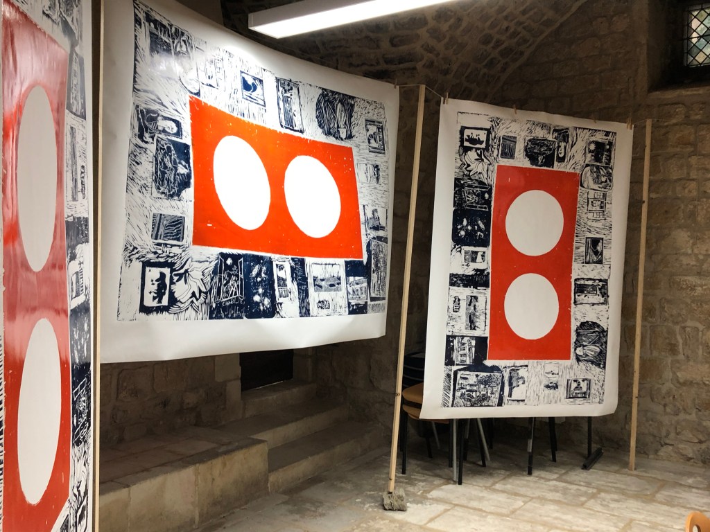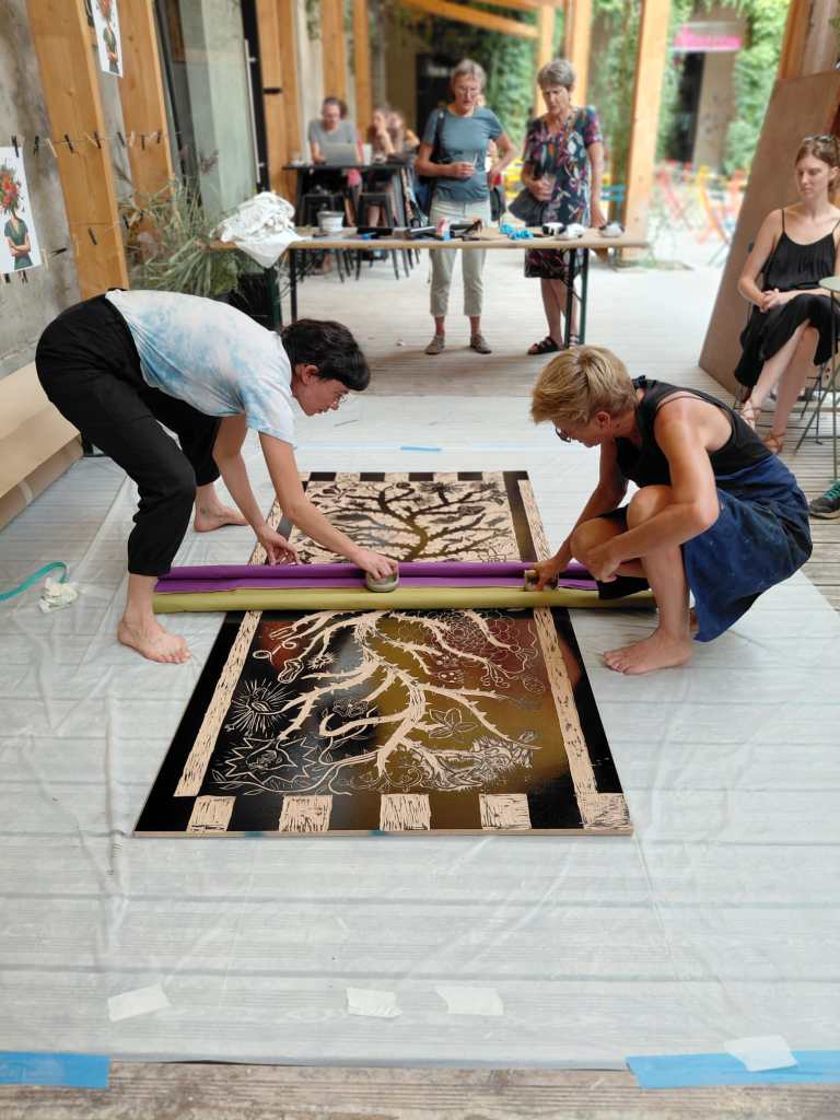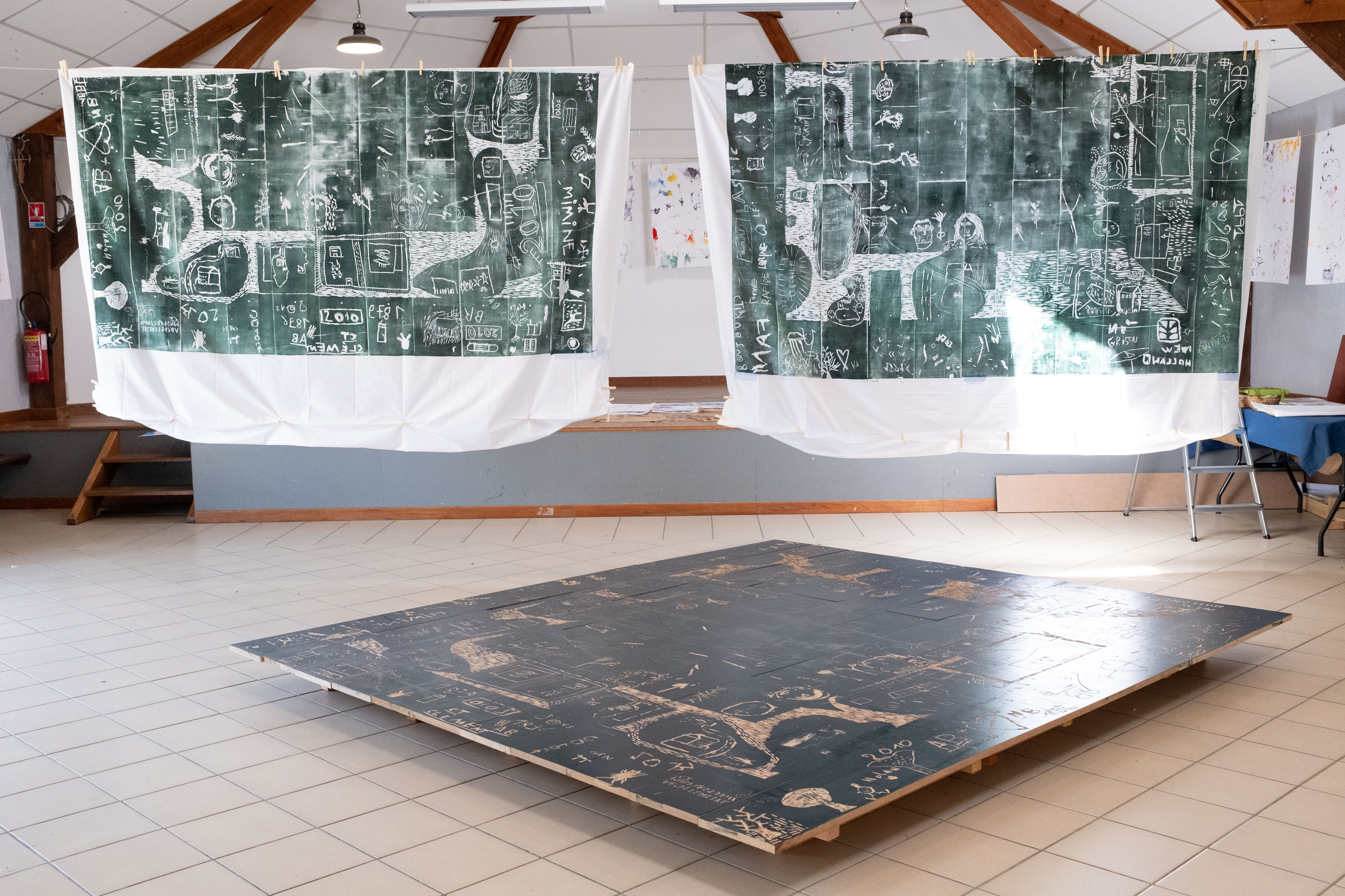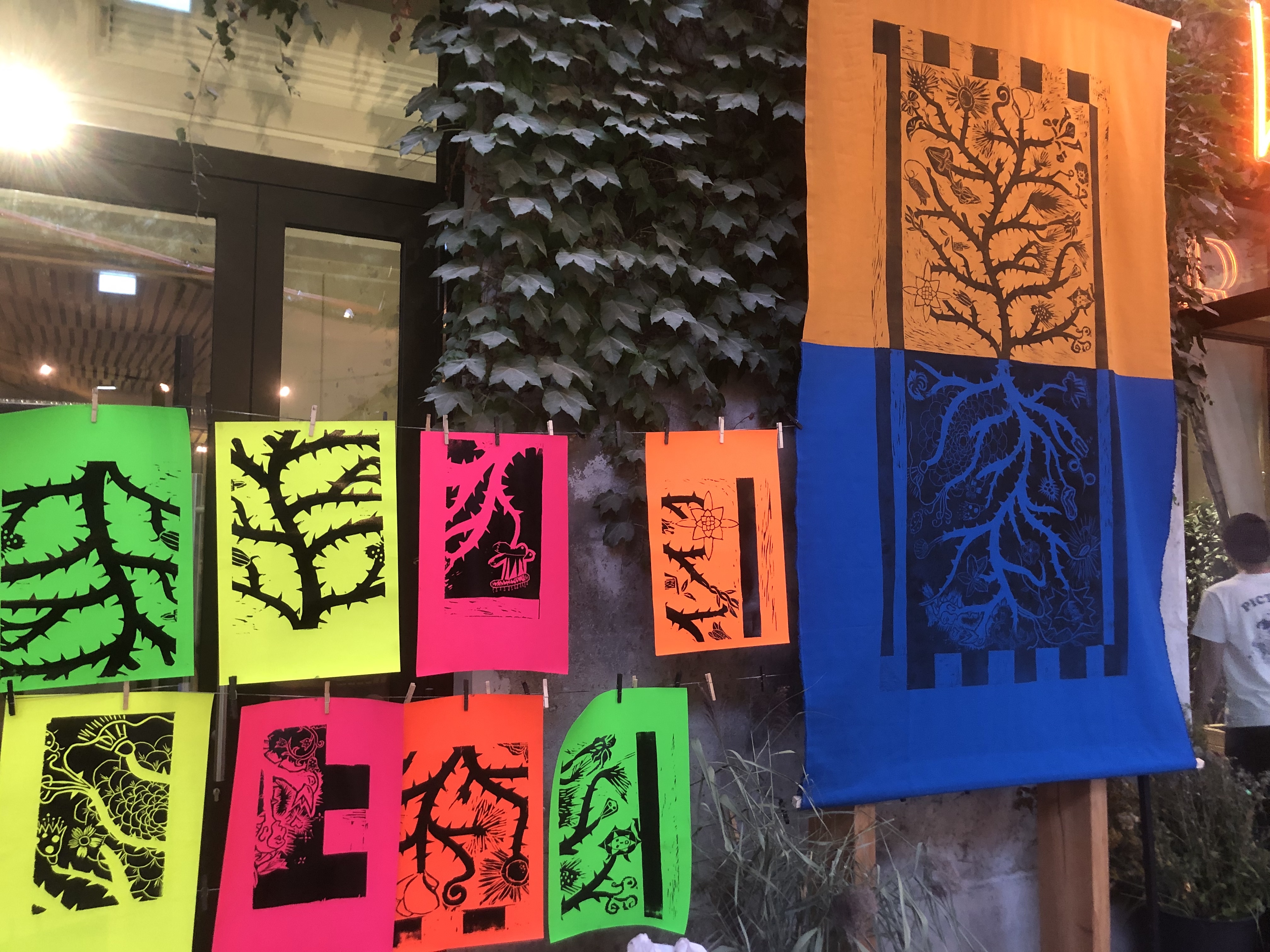 La grande matrice collective, une fois gravée fut ensuite encrée et imprimée sur deux grands kakémonos en tissus pour se joindre à l’ambiance festive et à la scénographie du lieu.