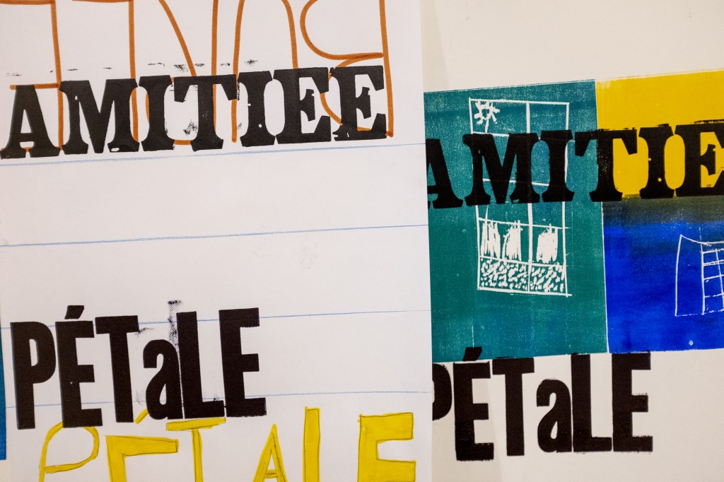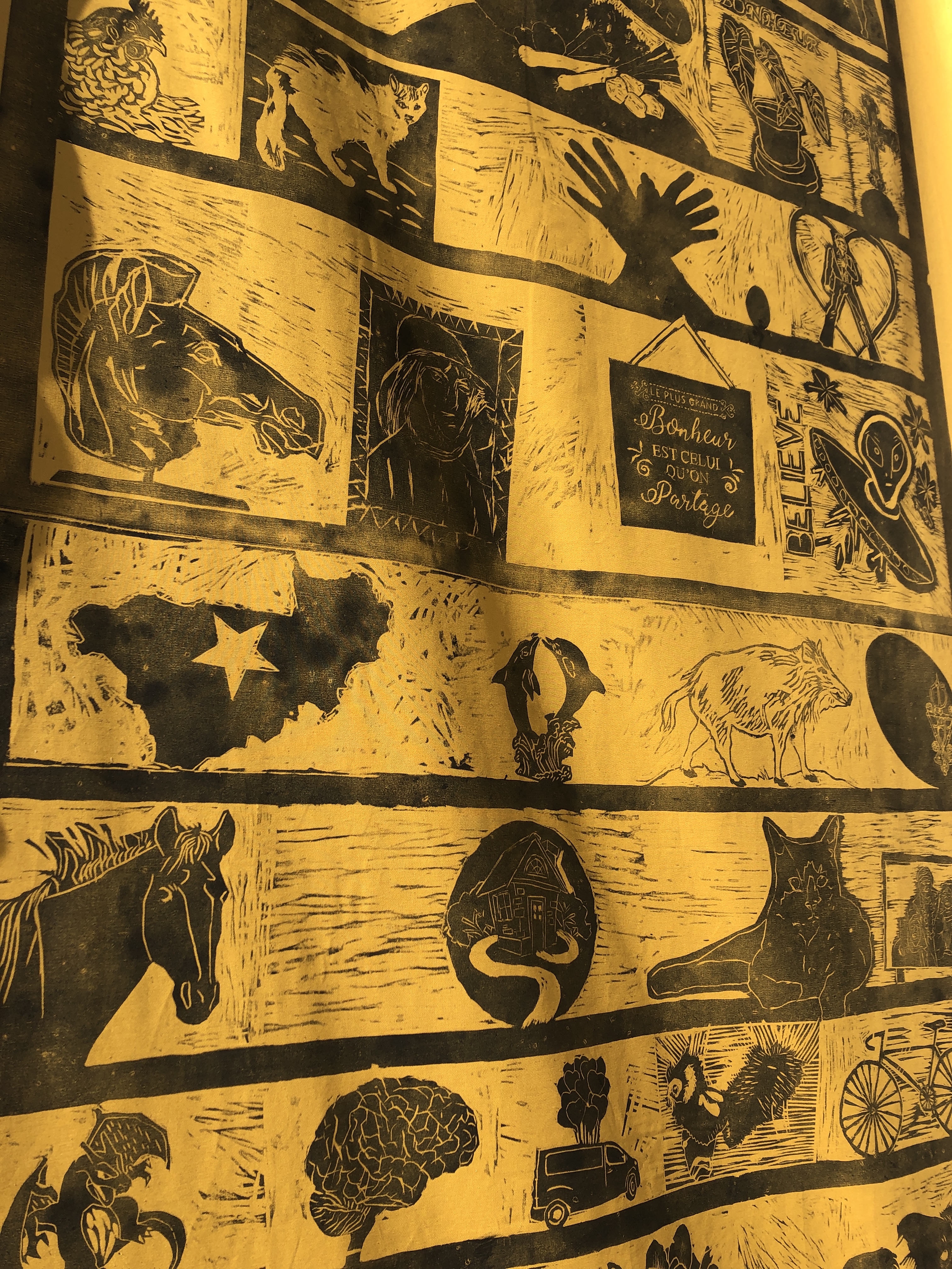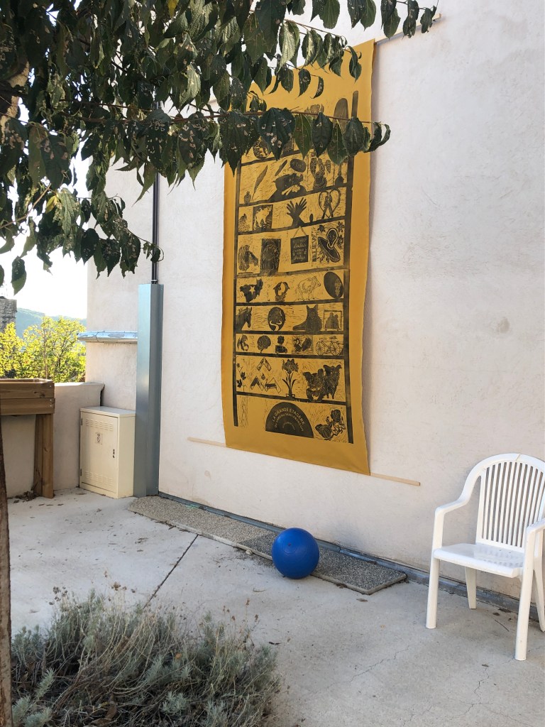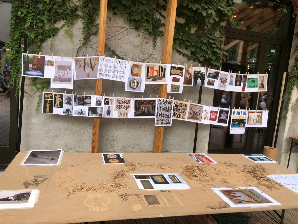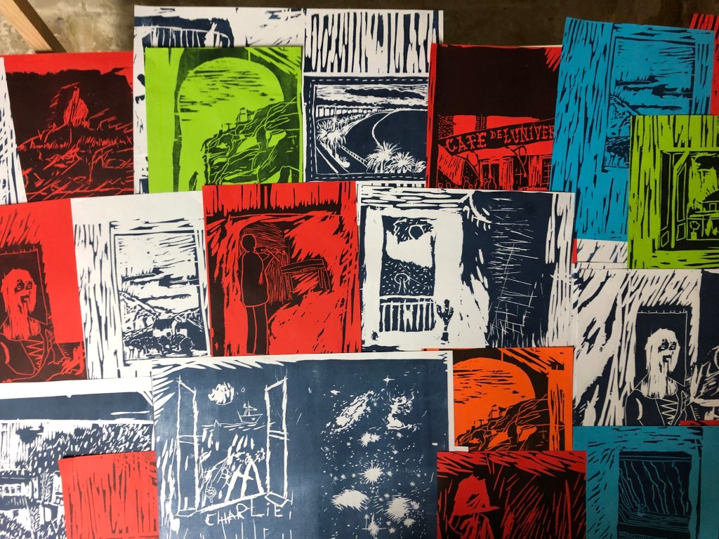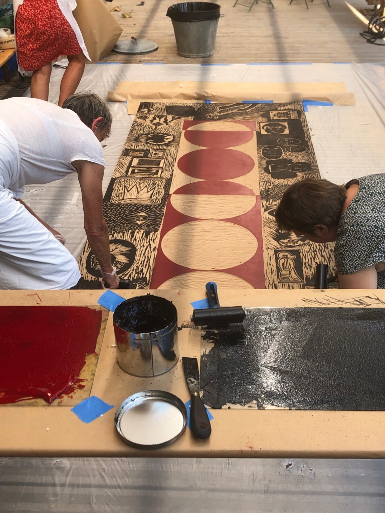 La grande matrice collective, une fois gravée fut ensuite encrée et imprimée sur deux grands kakémonos en tissus pour se joindre à l’ambiance festive et à la scénographie du lieu.