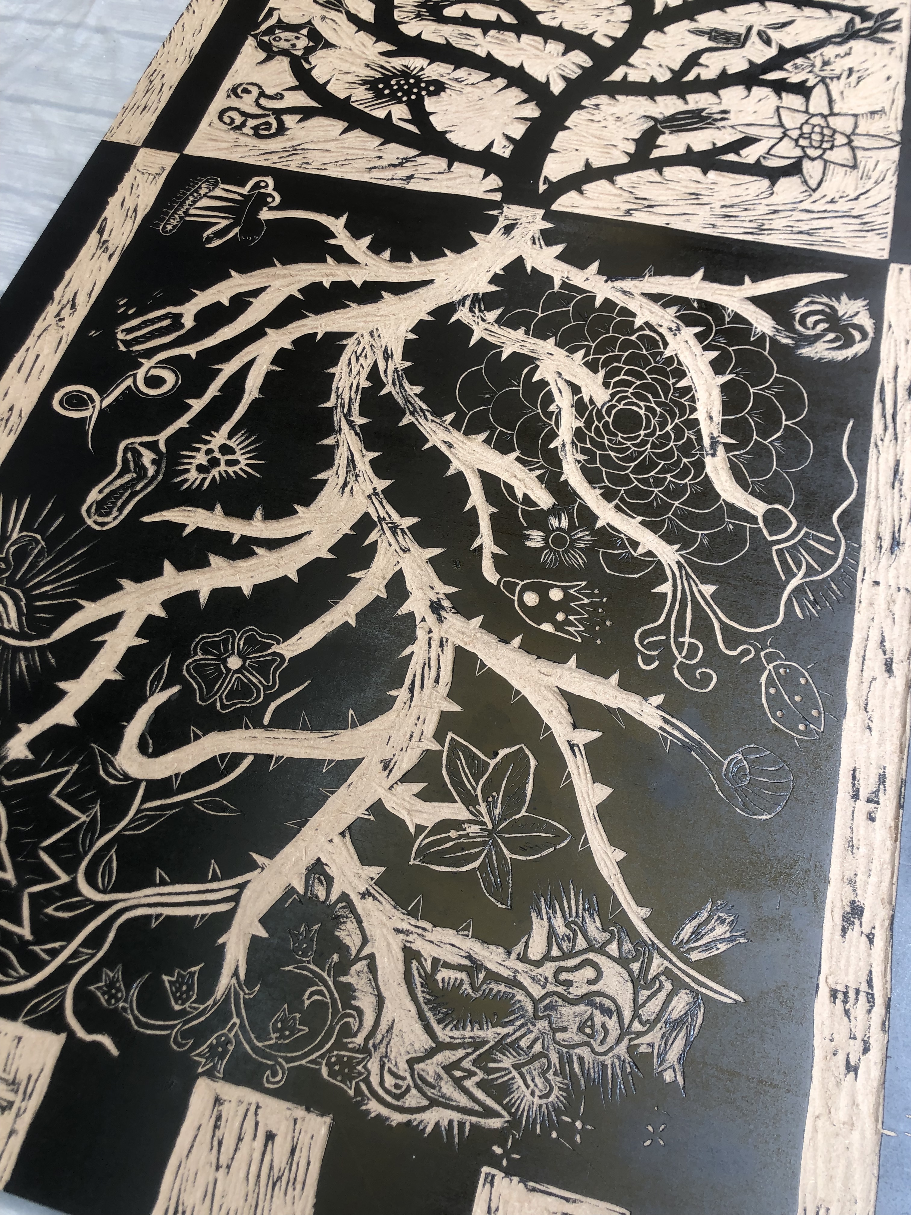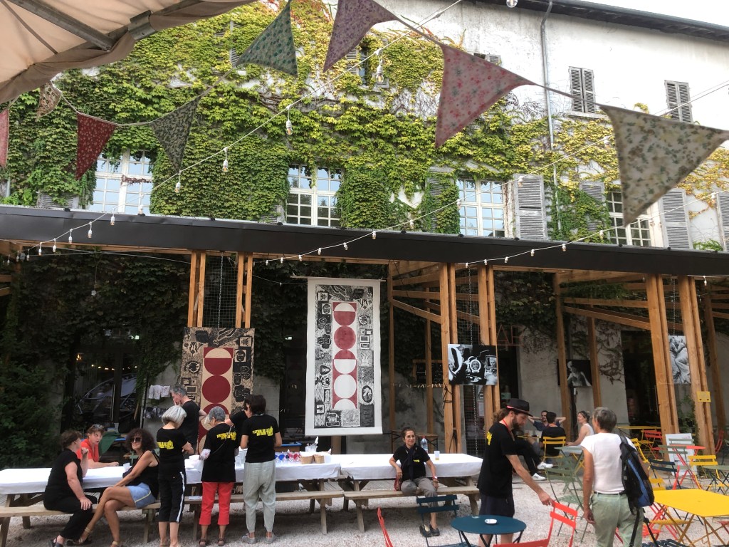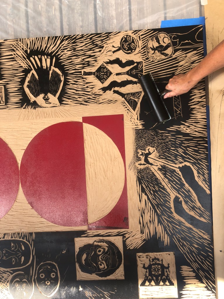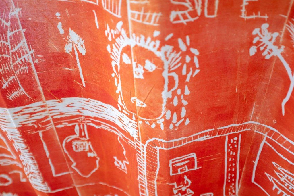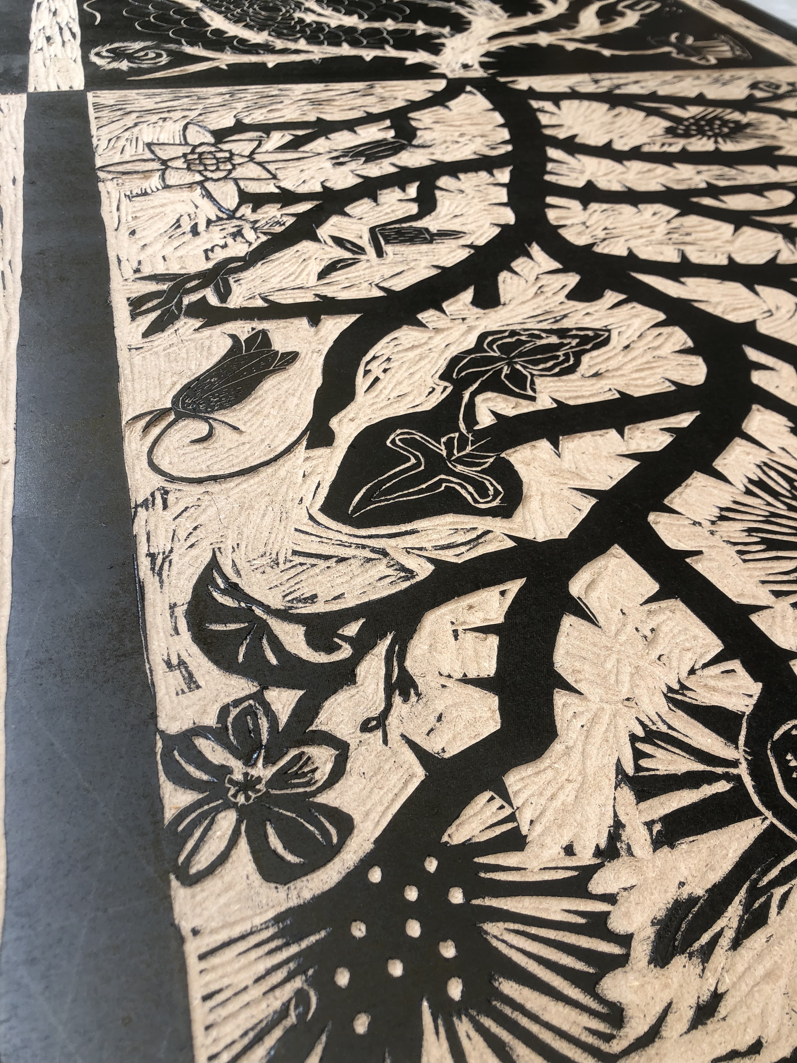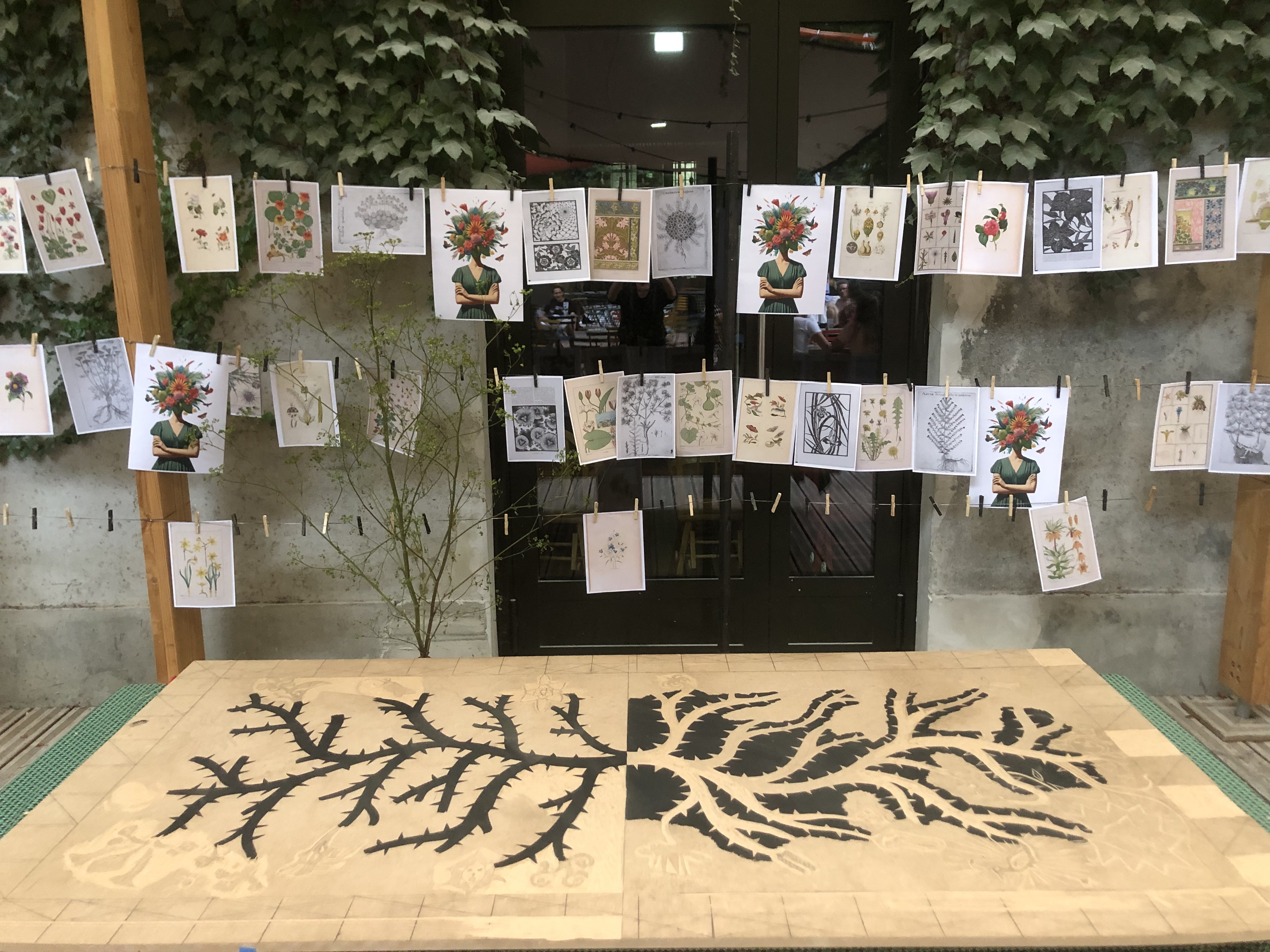 La grande matrice collective, une fois gravée fut ensuite encrée et imprimée sur deux grands kakémonos en tissus pour se joindre à l’ambiance festive et à la scénographie du lieu.
