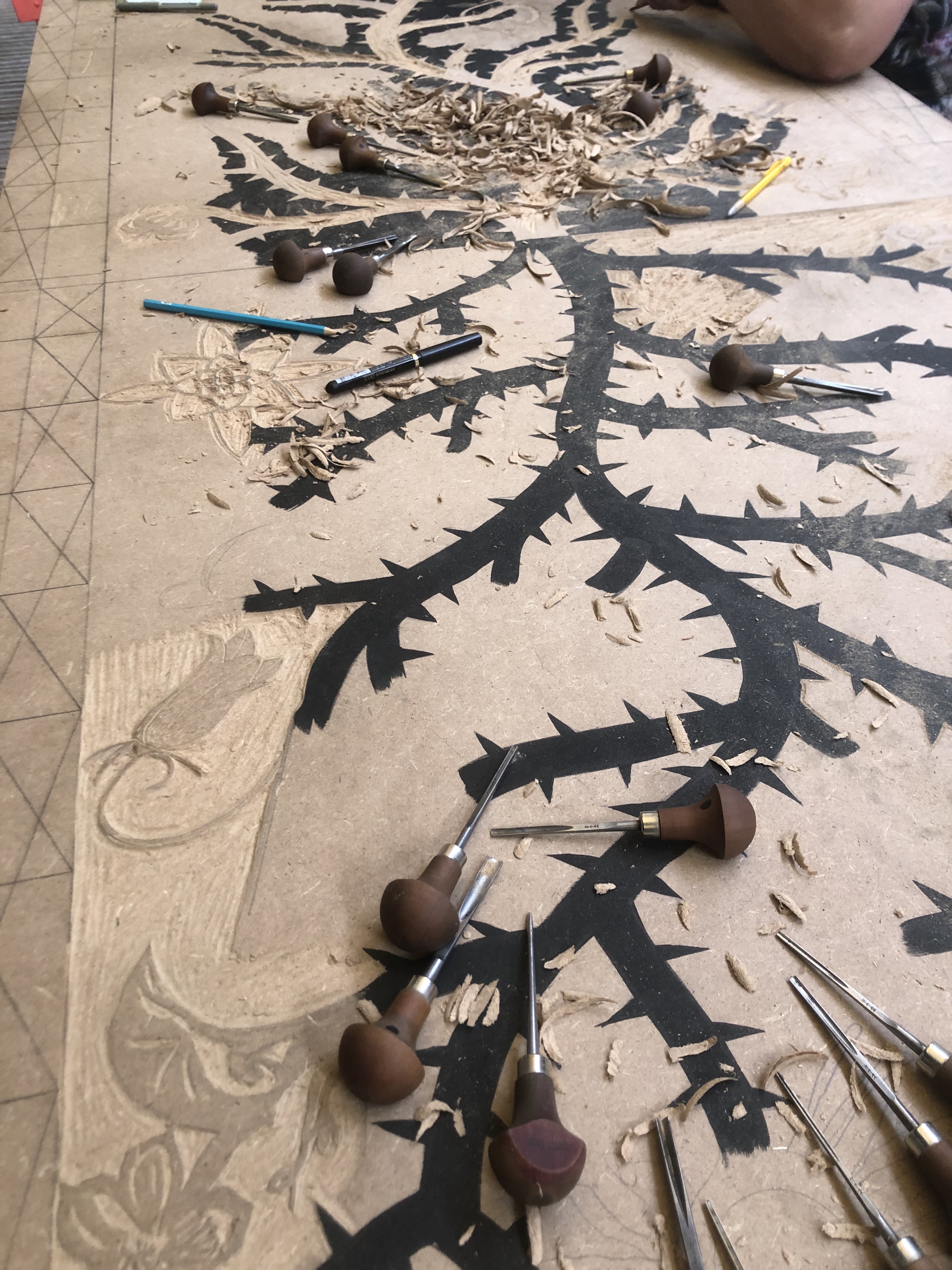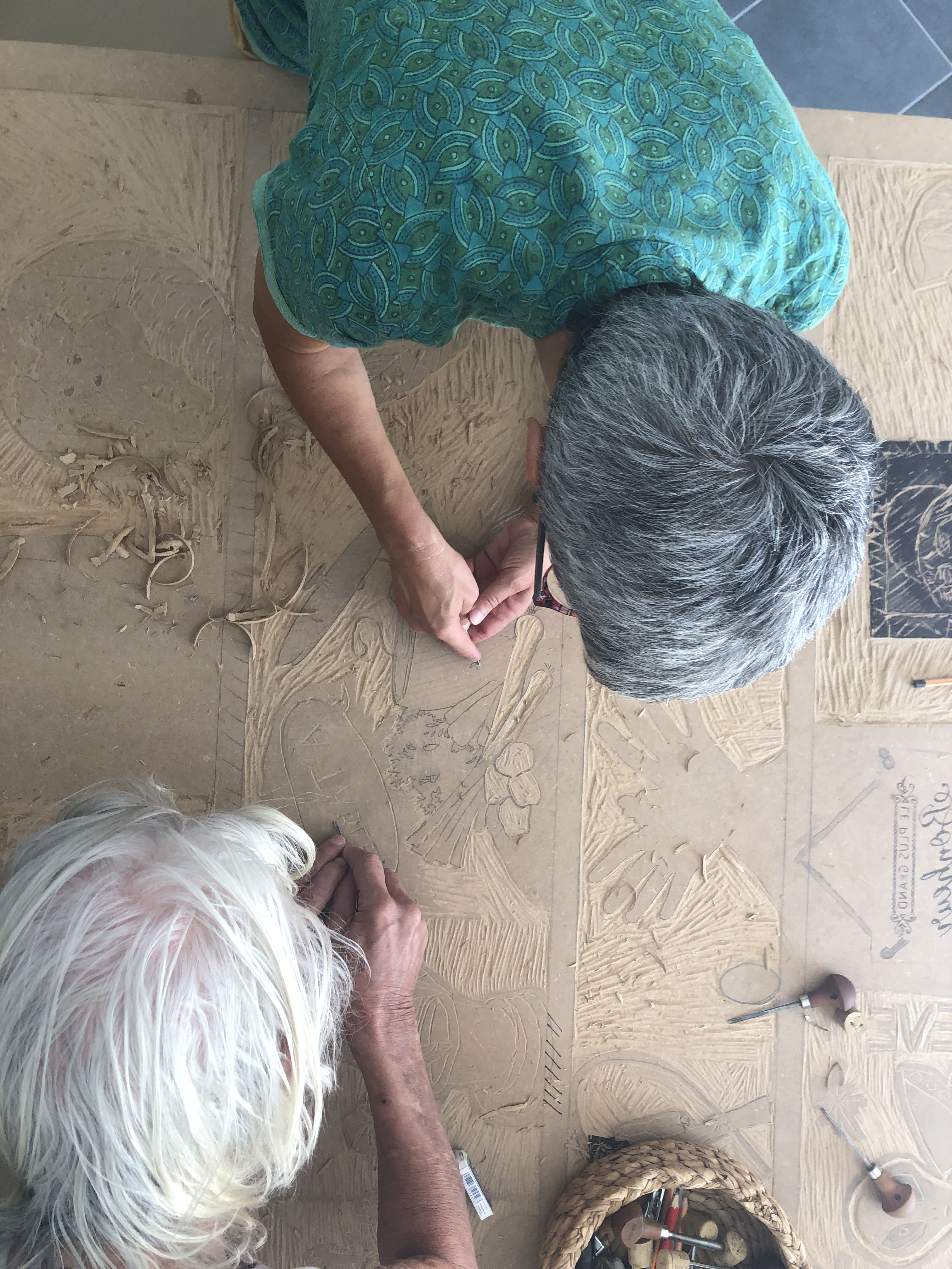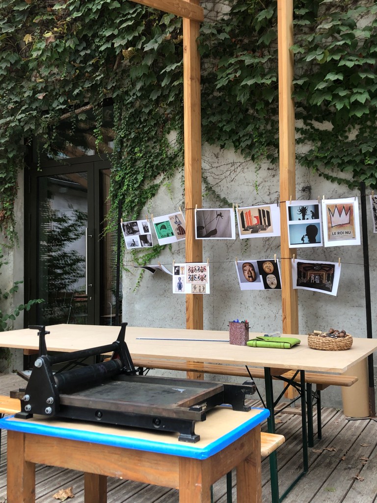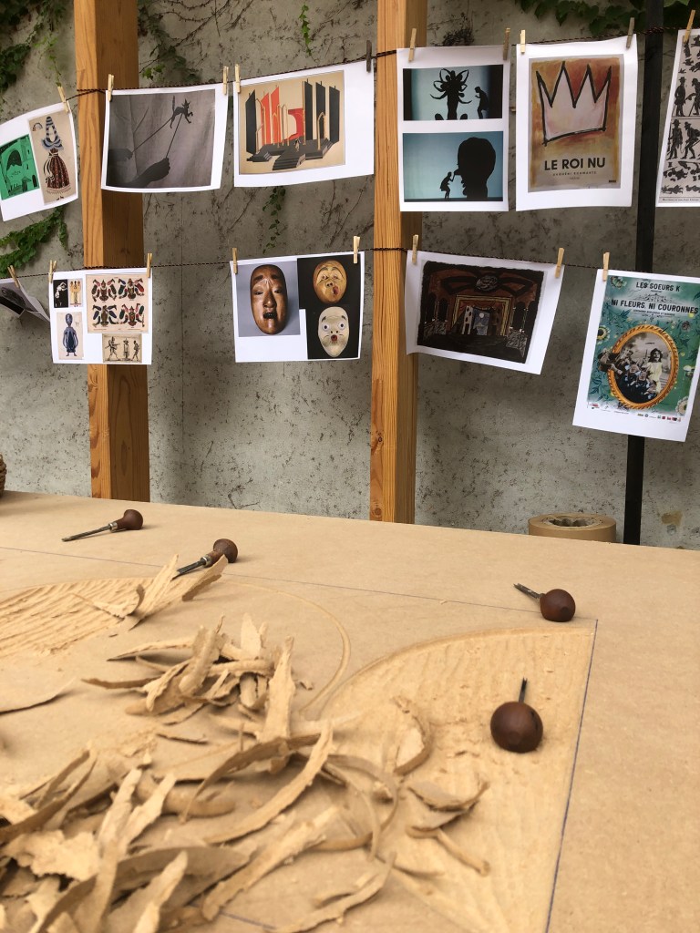 Escale dans la cour du vieux temple : iconothèque déployée, les gouges en majesté et la grande matrice de bois mesurant 2m50 par 1m20 qui sera gravée au fil de l’atelier sur la semaine du festival.