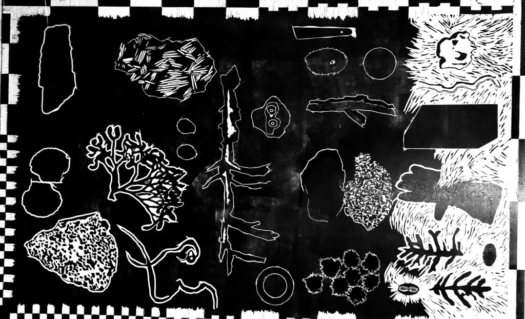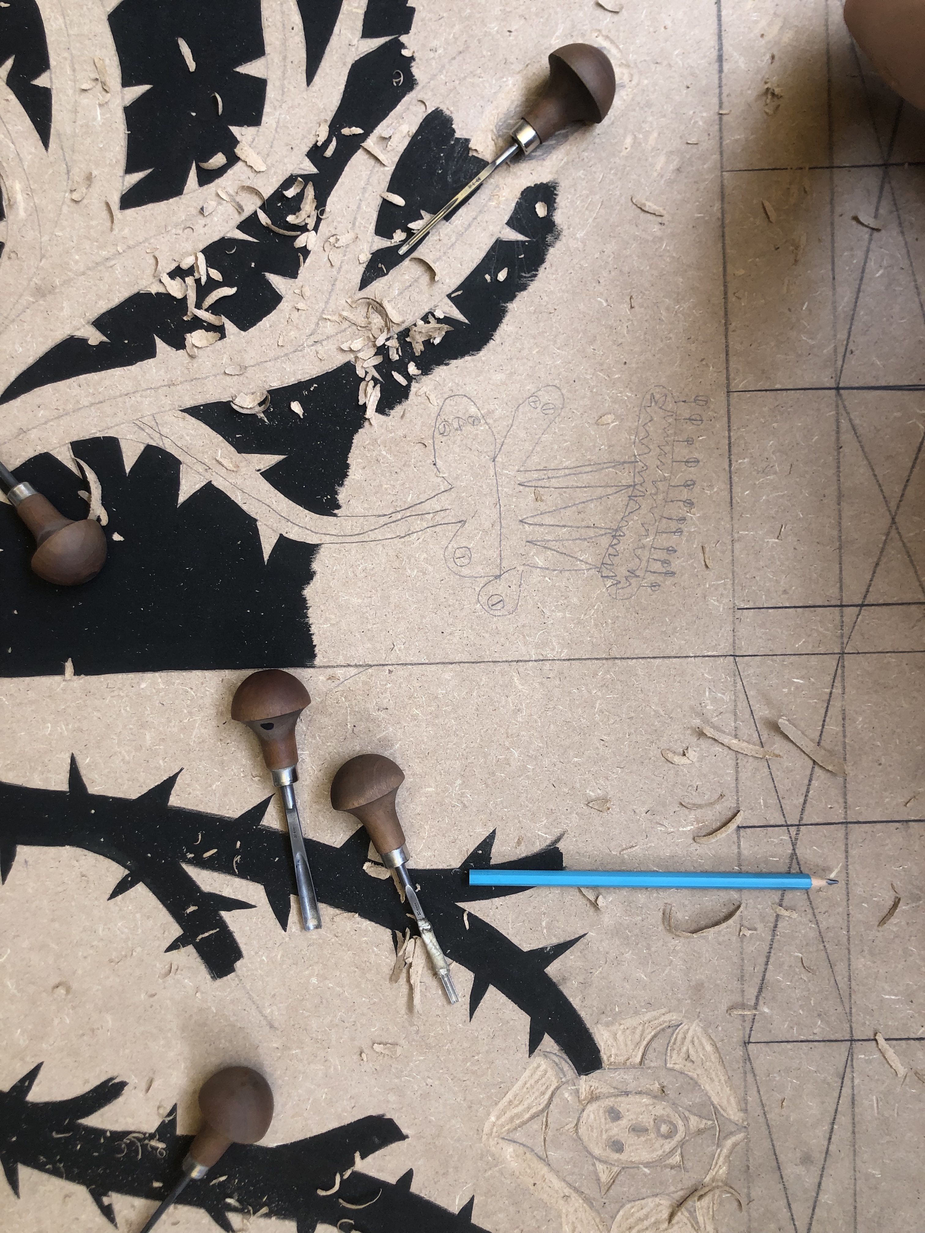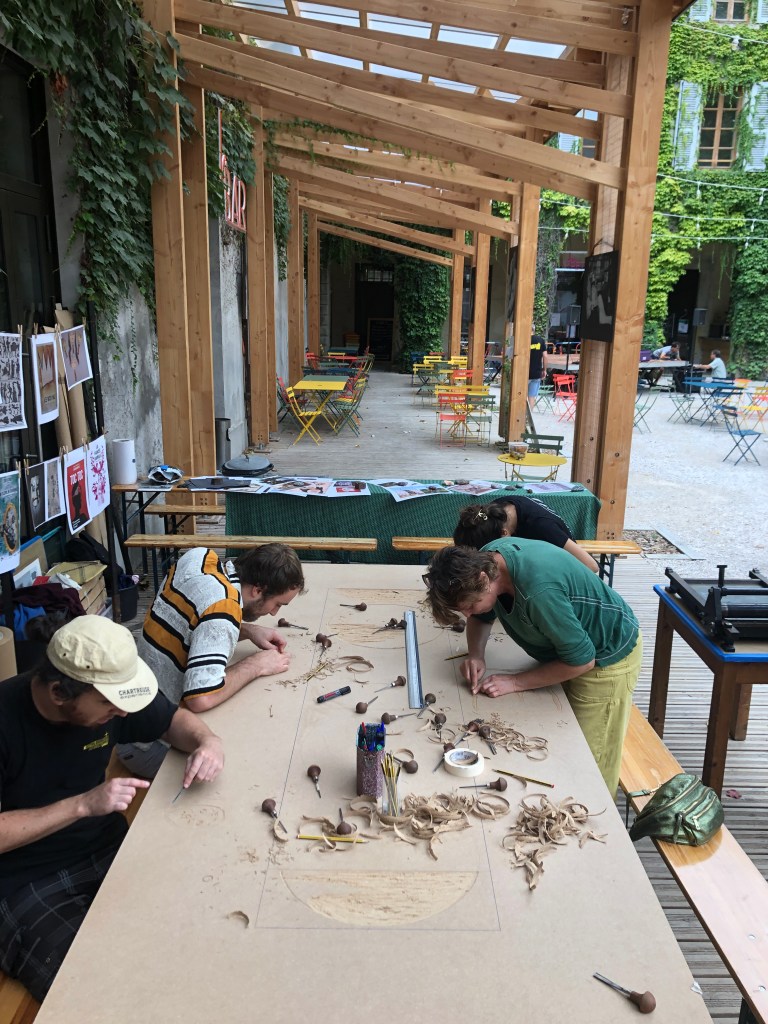 En septembre 2022, l’Atelier Mille Lieues a fait escale un mois durant à Draguignan, au sein du hameau solidaire Saint François. Un espace d’atelier gravure et d’imprimerie fut installé dans la salle collective sur la place centrale du hameau. Les rencontres furent chouettes et les copeaux nombreux : au fil du temps les habitant·es étaient invité·es à venir déposer et graver un objet ou une image importantes pour elleux sur la grande matrice de bois.