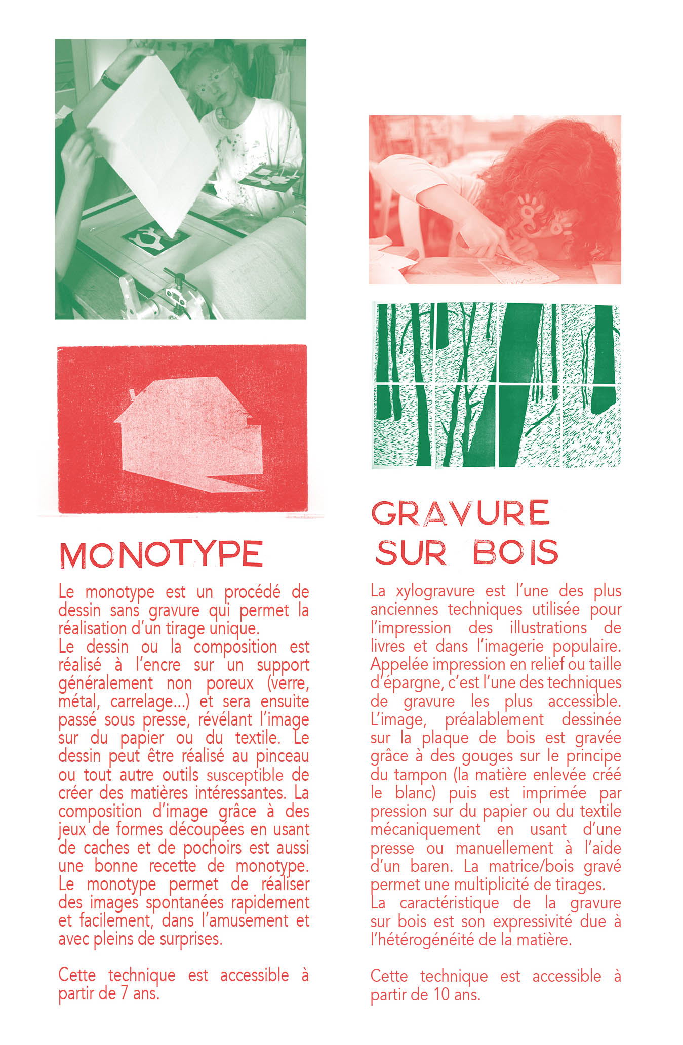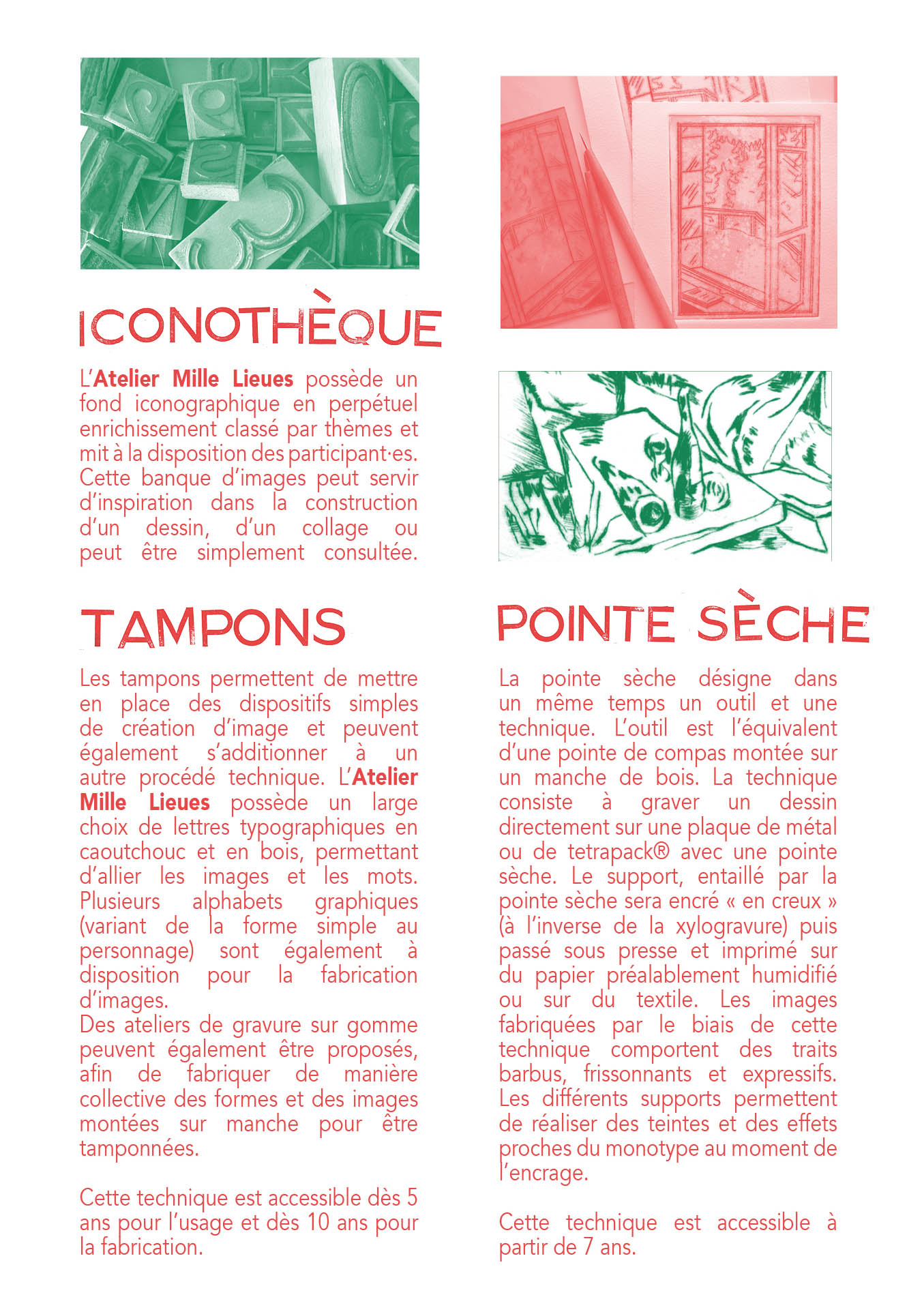 La création graphique, les techniques de gravure et d’édition s’envisagent pour l’Atelier Mille Lieues comme un moyen de prendre le temps de partager des savoirs faire et de sensibiliser, par la pratique, un large public dans le champ de la création contemporaine.