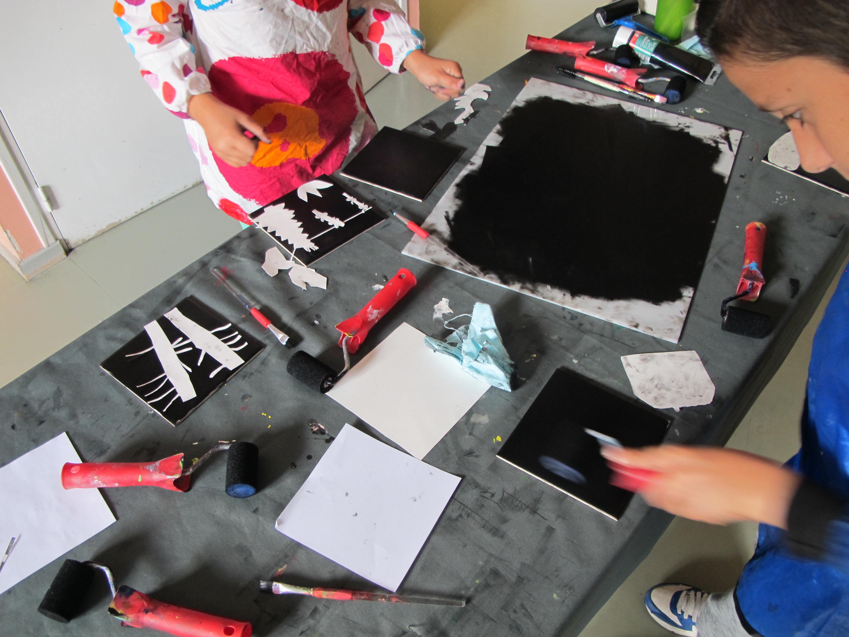 l’Atelier Mille Lieues a coupé le moteur et ouvert ses valises pendant une semaine au Musée de L’Abbaye, pour mettre en partage ses outils et ses astuces autour des techniques du monotype, de la pointe sèche et de la gravure sur bois ! Un atelier d’une après-midi avec des adultes, une session fabrication de panorama paysage de trois jours avec un groupe d’enfants et une demi-journée de monotype automnales en famille.