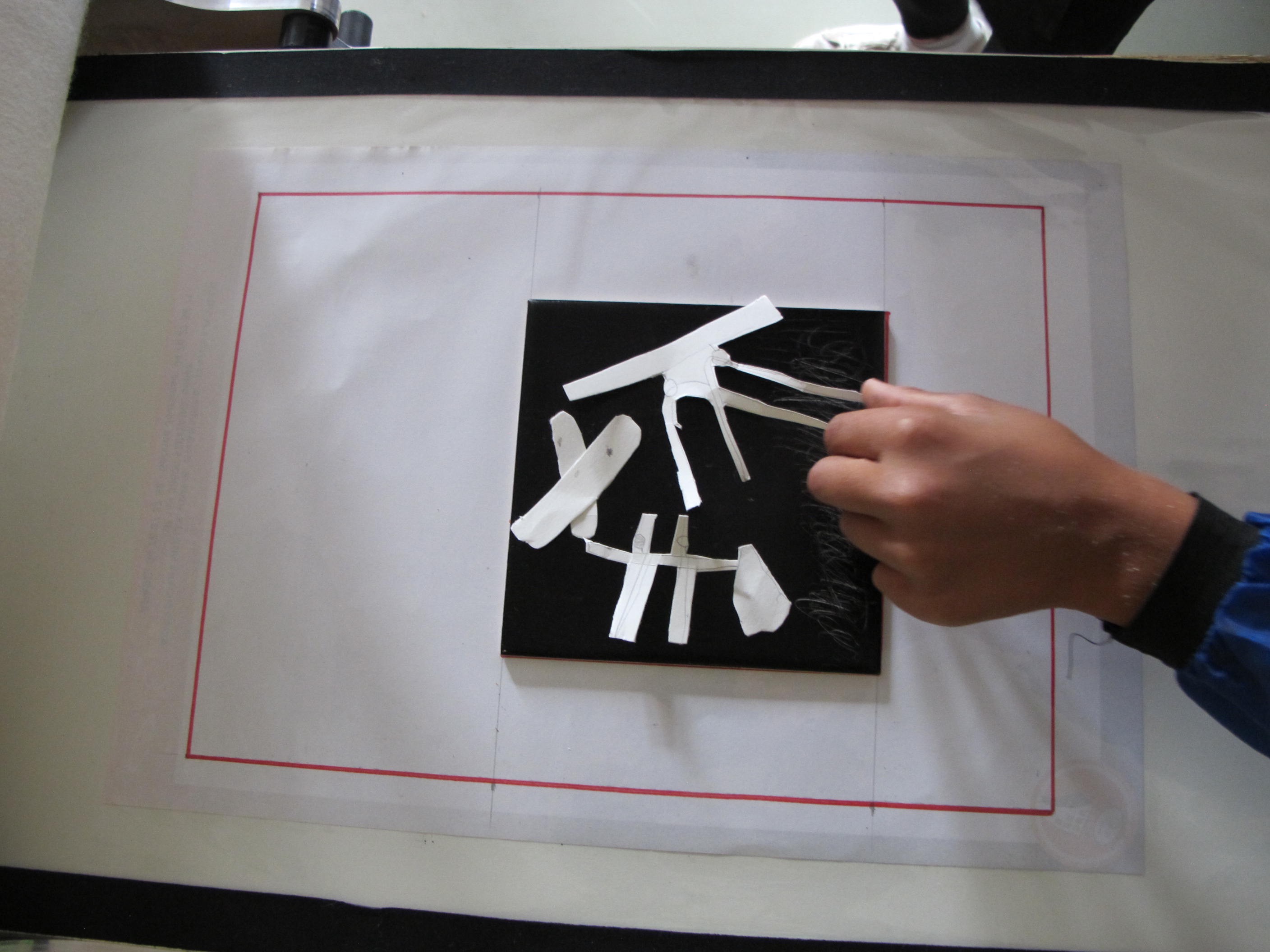 Nous avons proposé un dispositif simple, une matrice de bois fut fixée sur les tables de la salle d’activité de la prison, elle fut gravée et imprimée au fur et à mesure des séances par les participants, à partir de propositions de jeu d’écritures et de dessins.