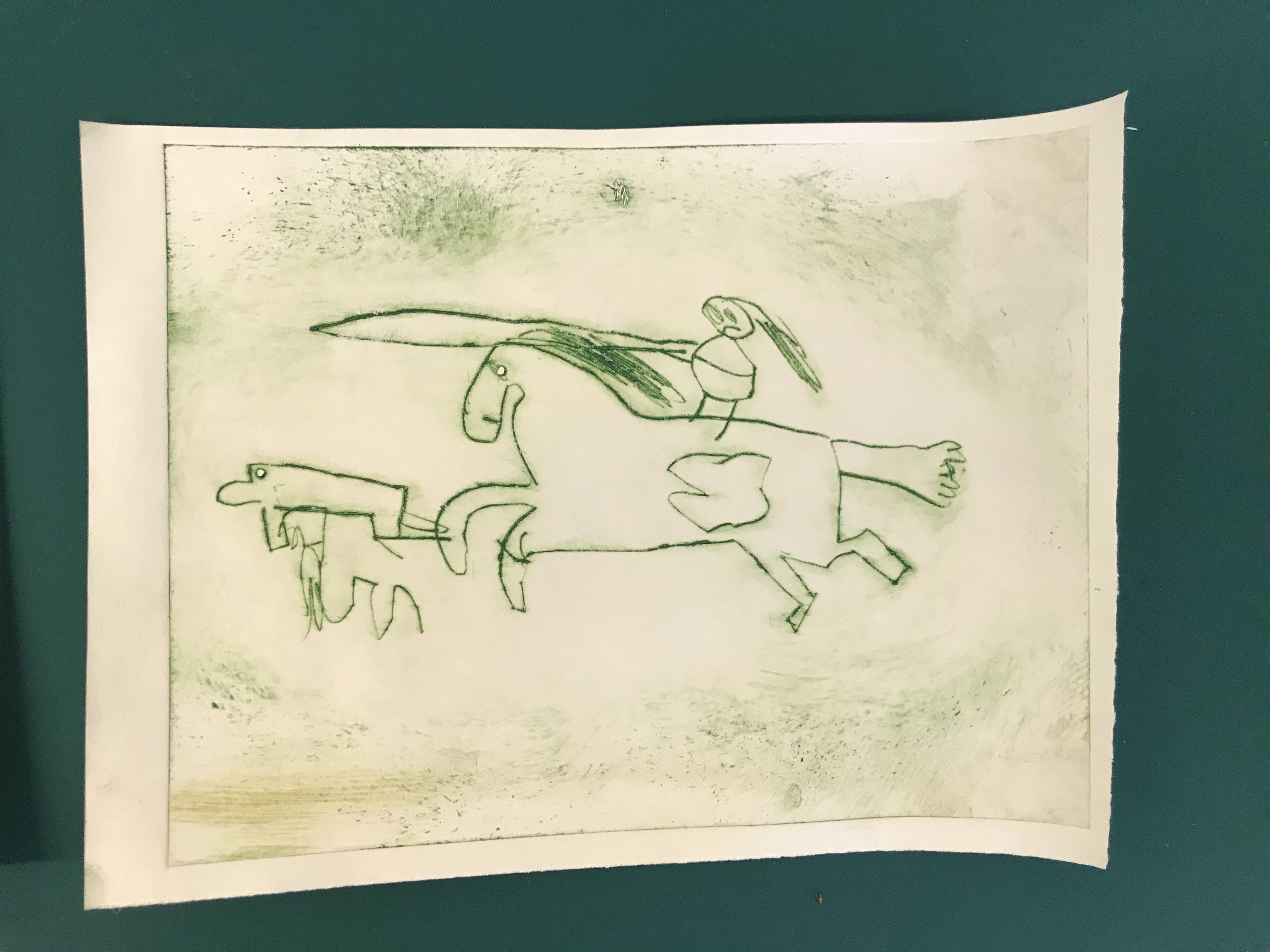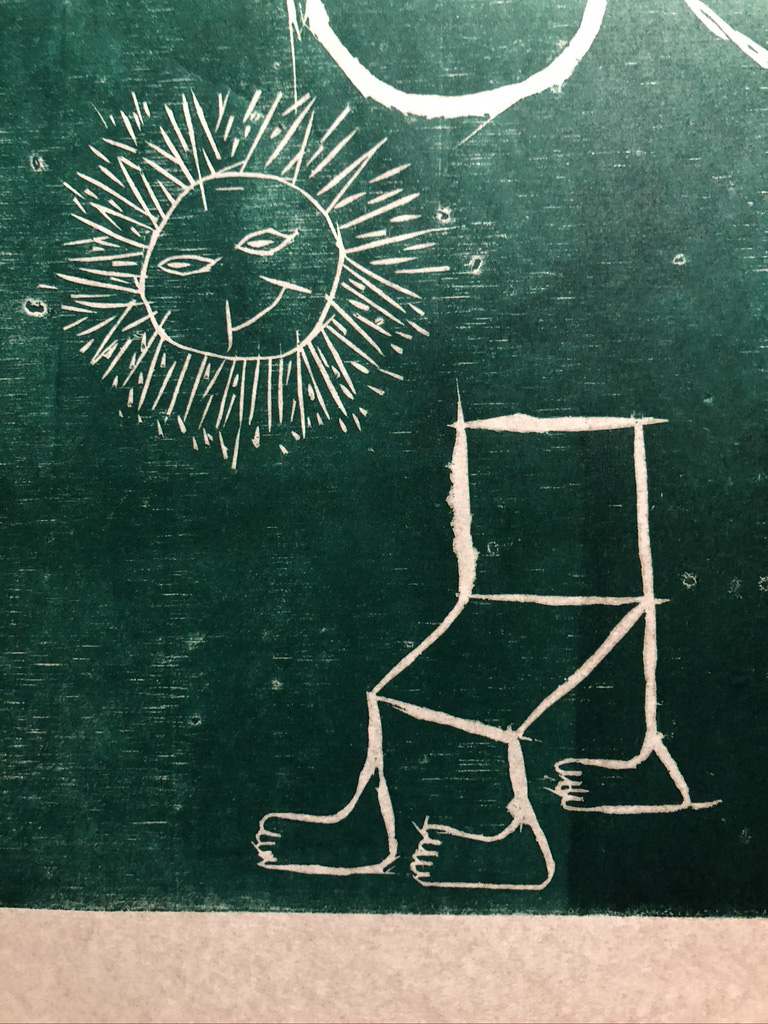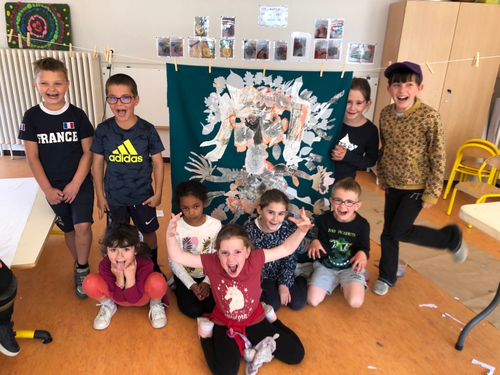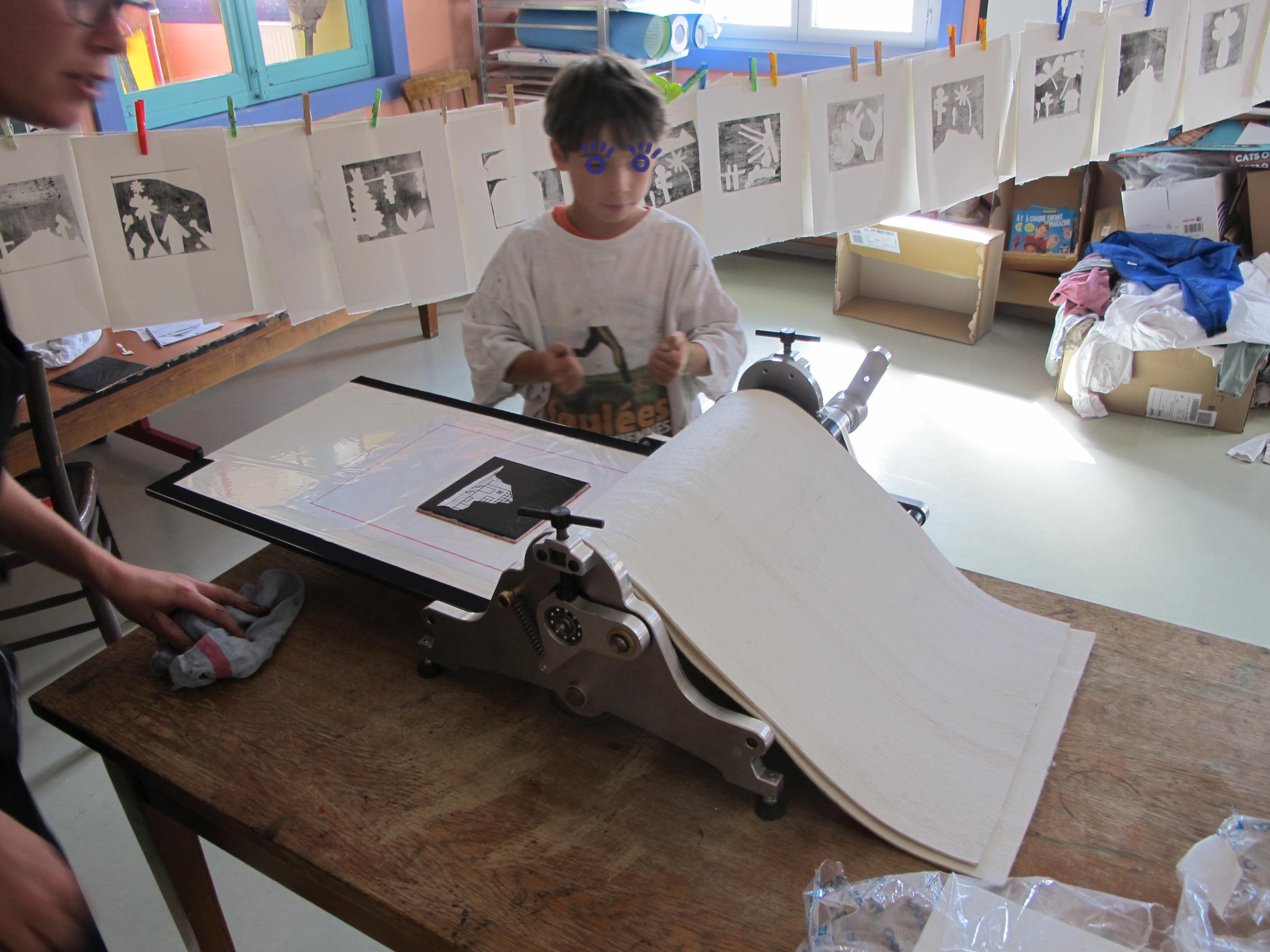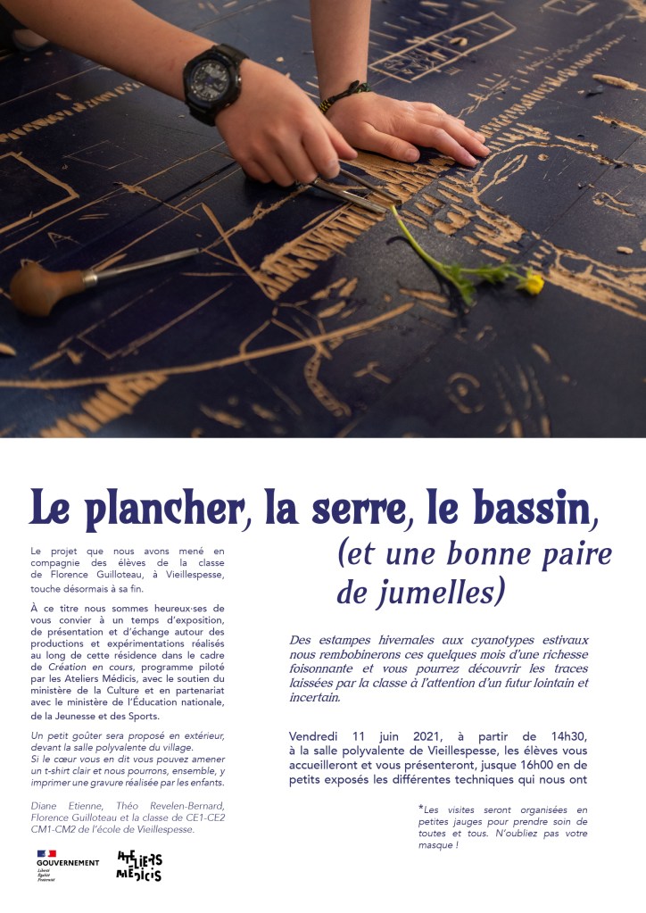 Nous avons, entre tout un tas d’autres gestes partagés avec les enfants, gravé un plancher en bois de 3m par 3m, imprimé en état au fil des mois et présenté lors de l’exposition – visite guidée – goûter le 11 juin dernier.