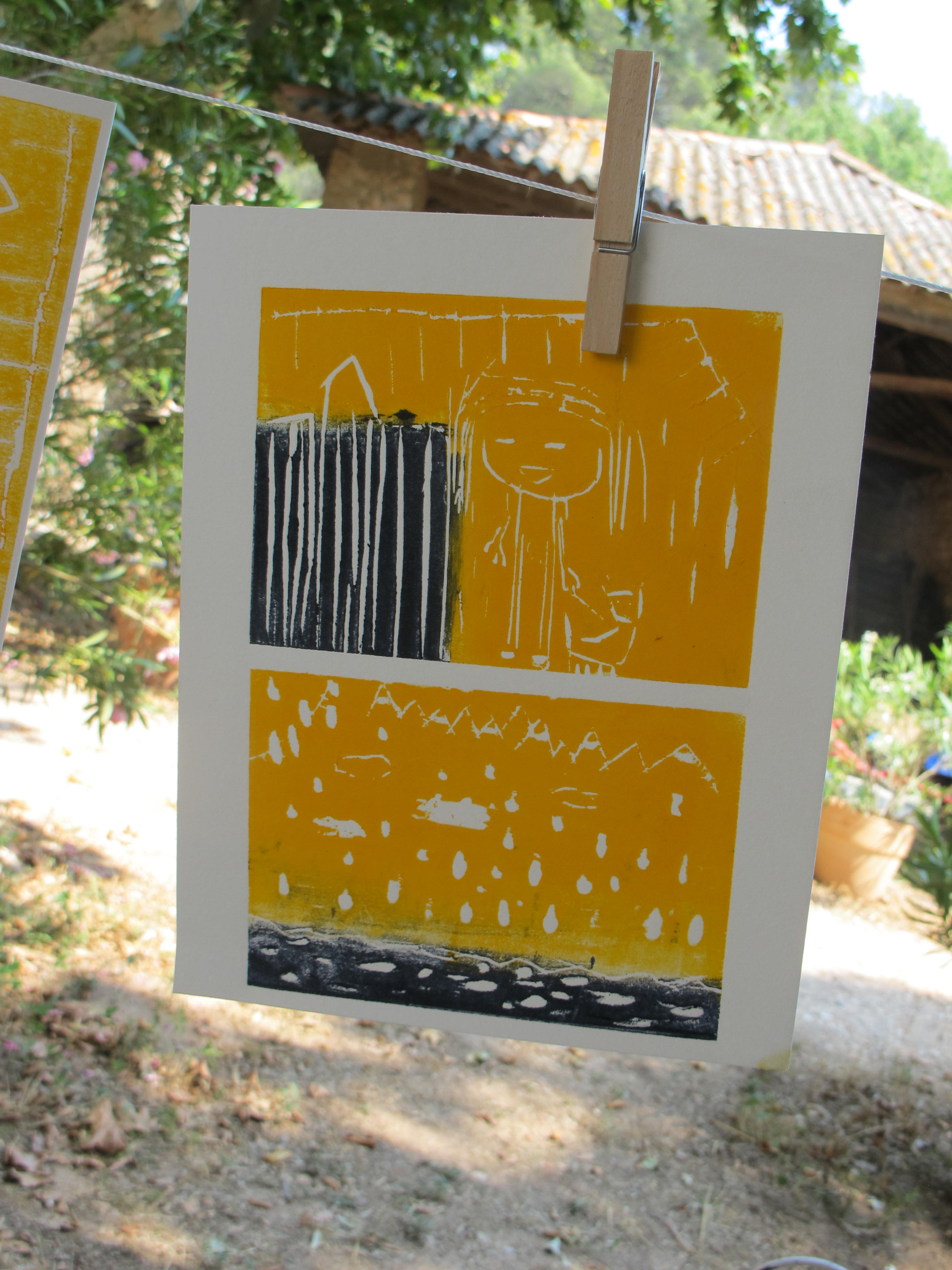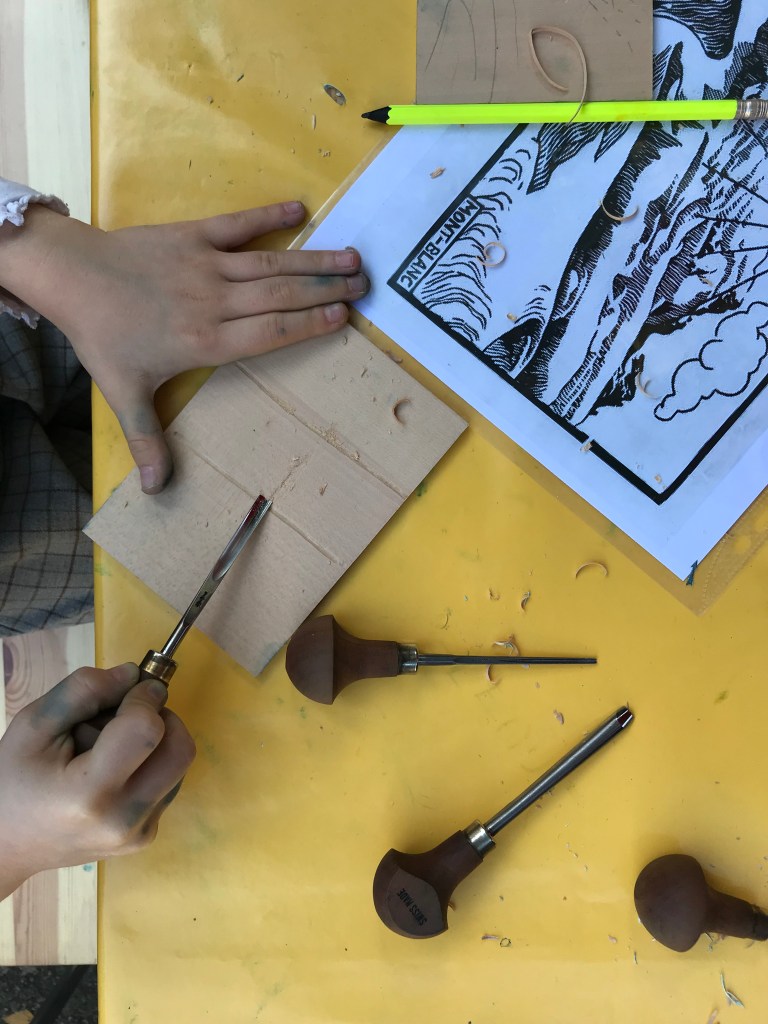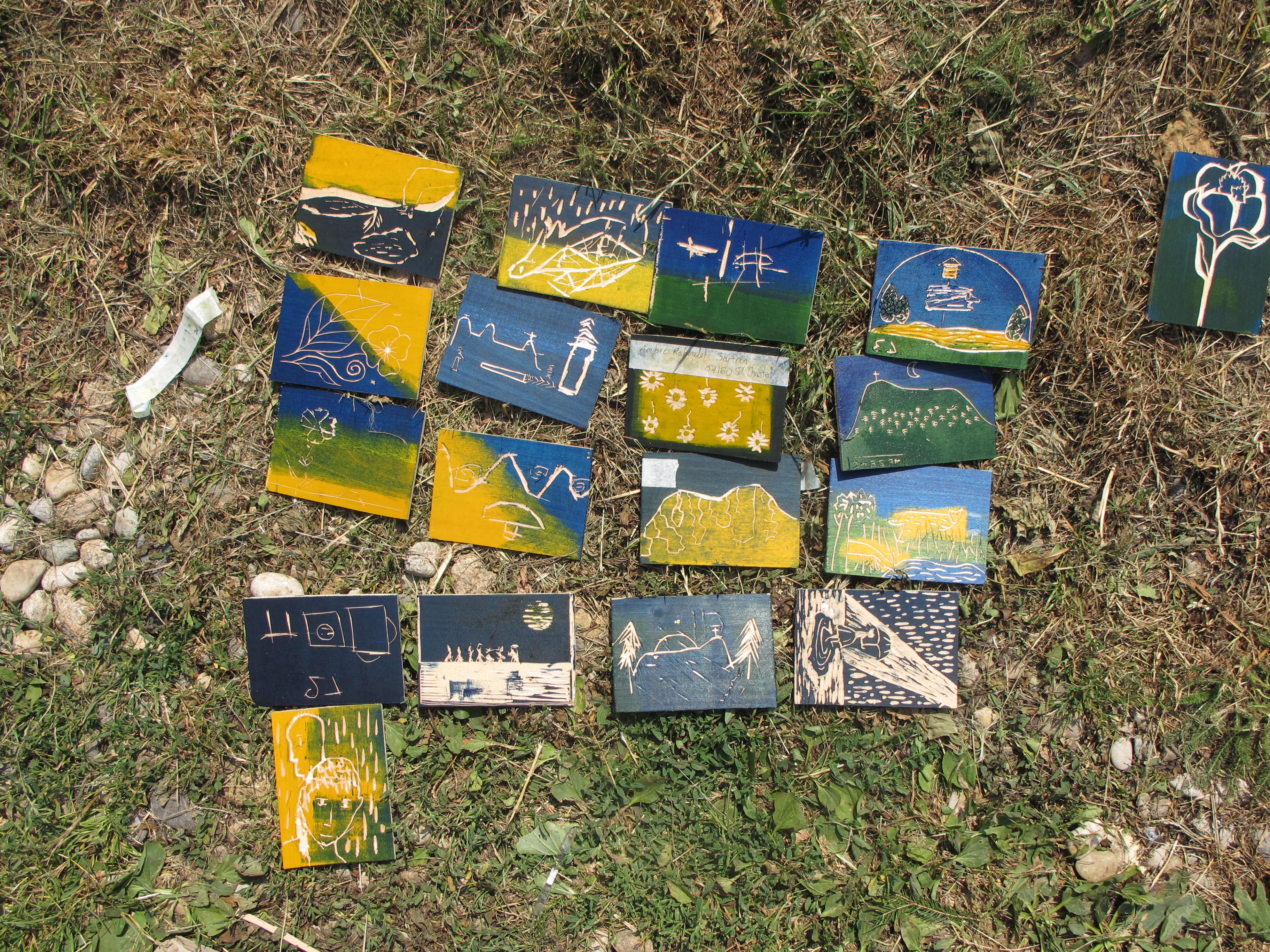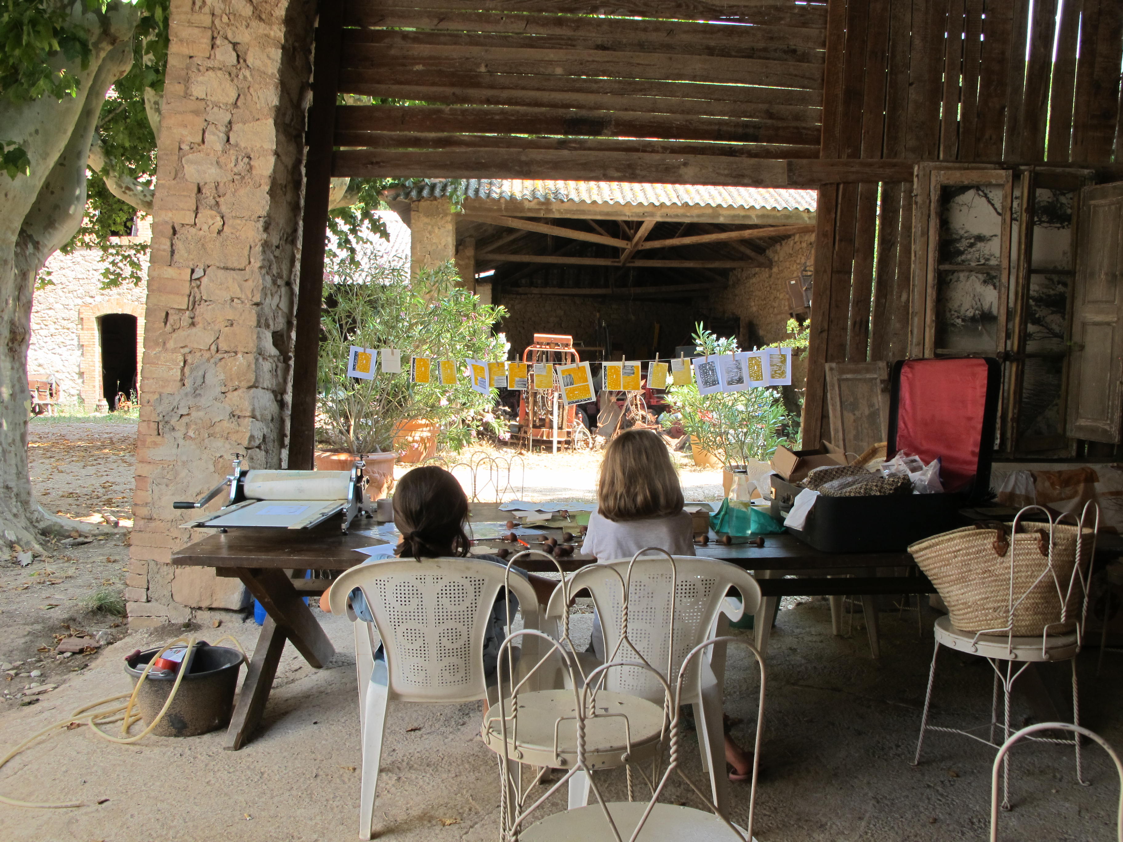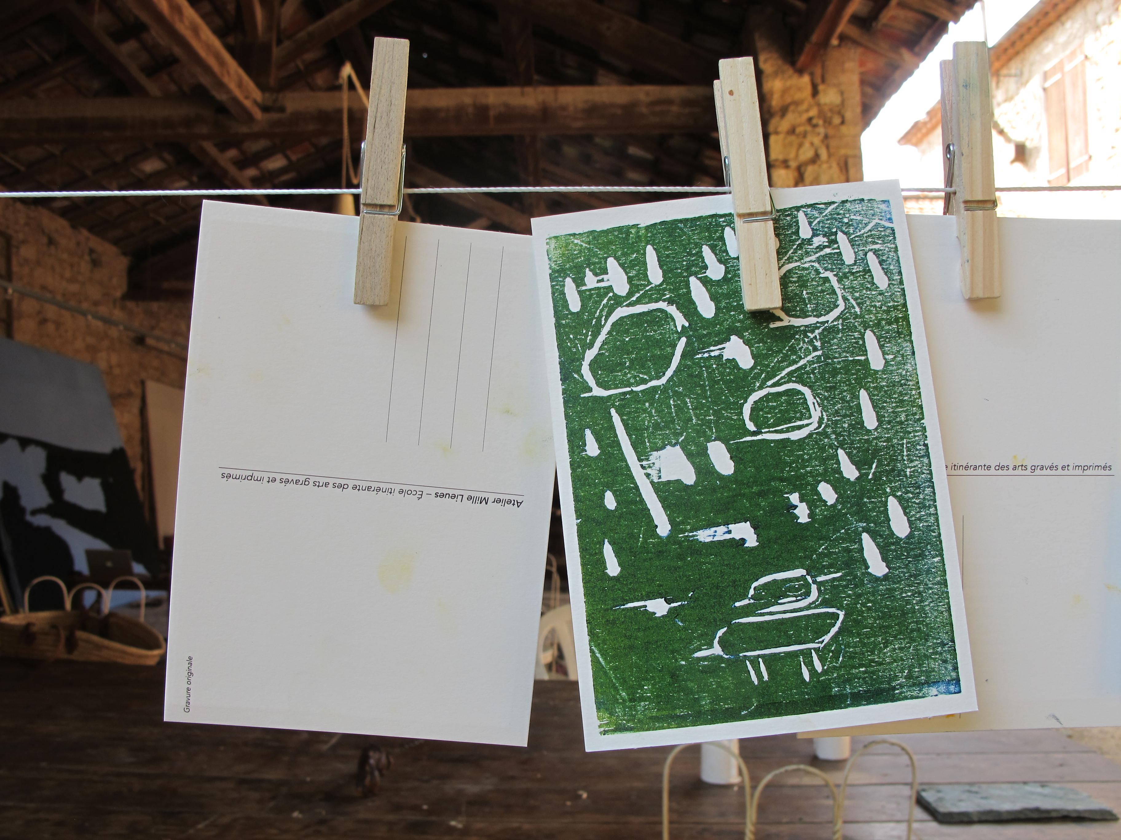 L’Atelier Milles Lieues au pied de la montagne Sainte Victoire, sphinx de provence, au centre aéré de Rousset – juillet 2019 – réalisations de cartes postales en gravure sur bois.