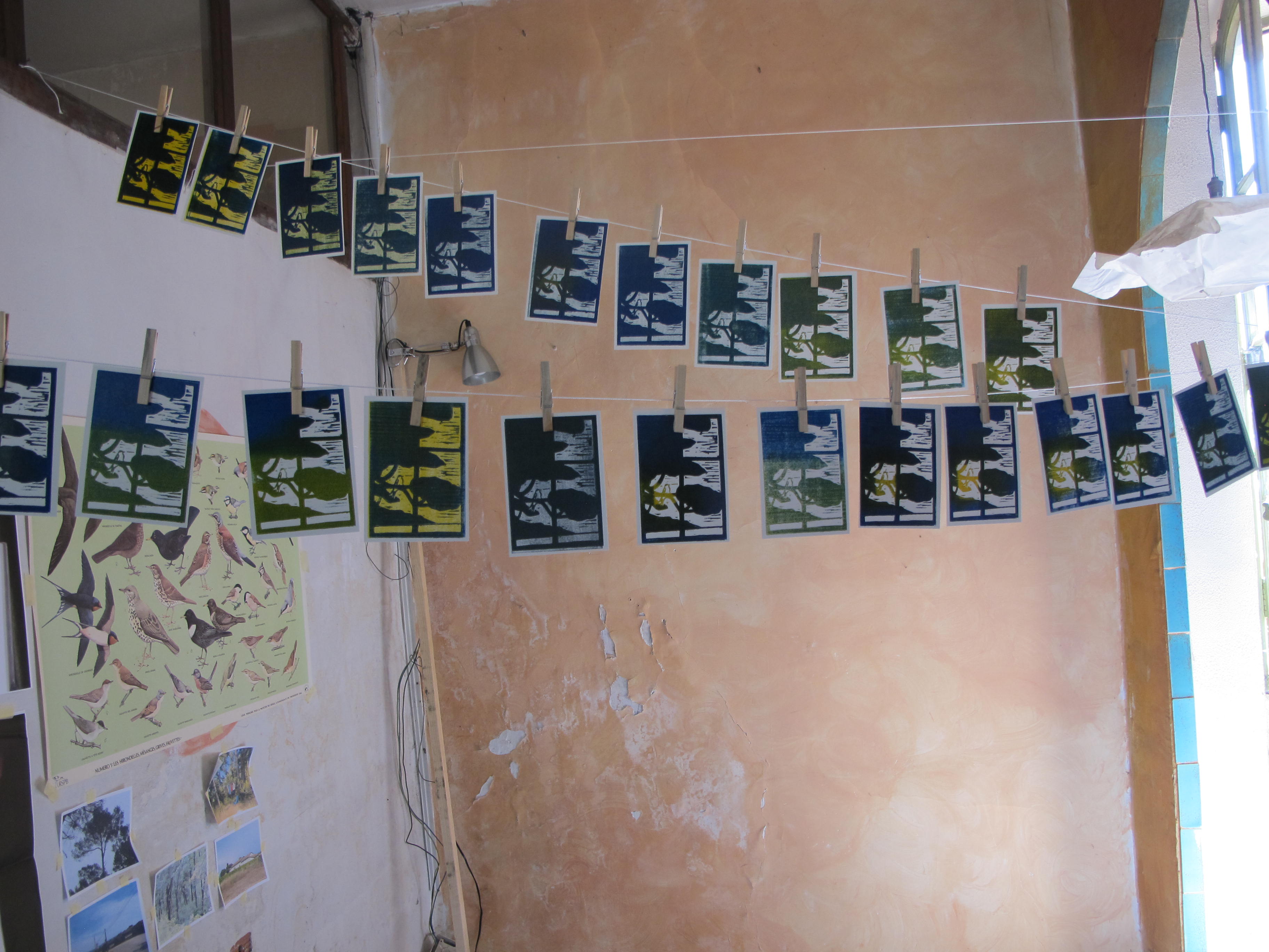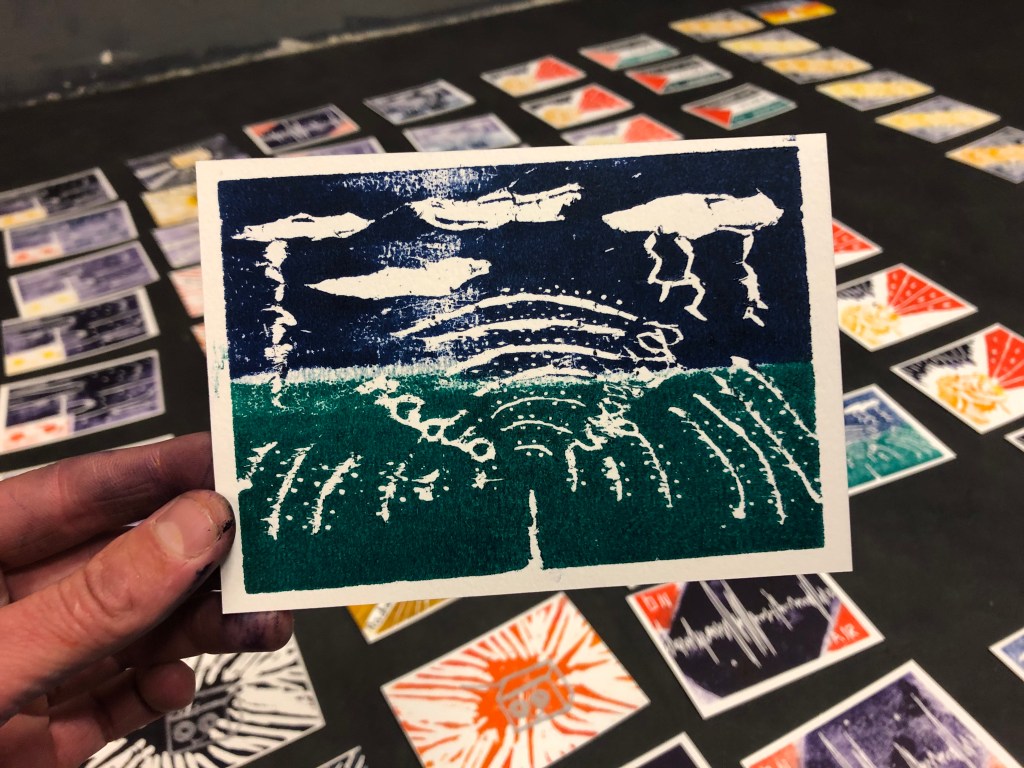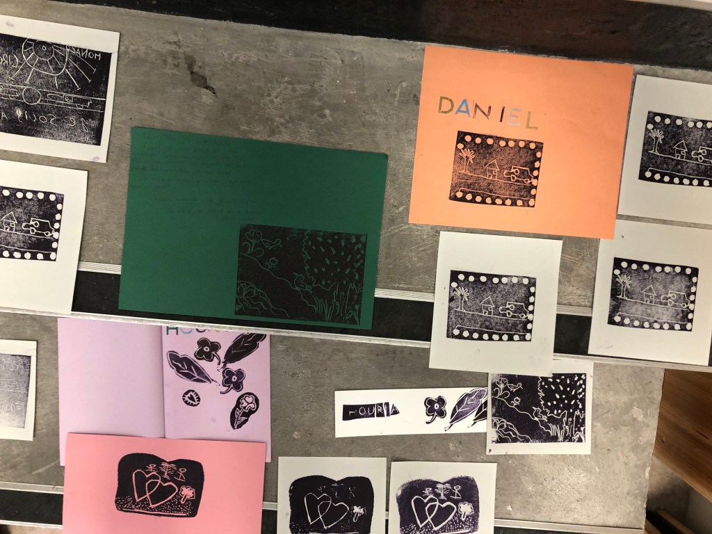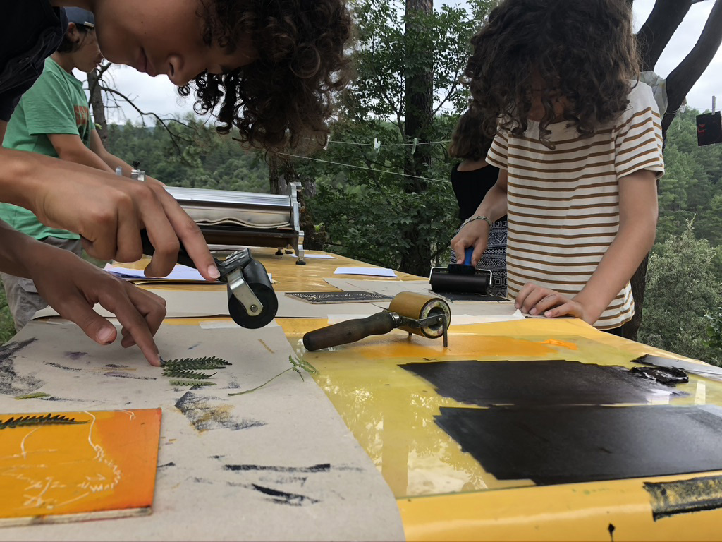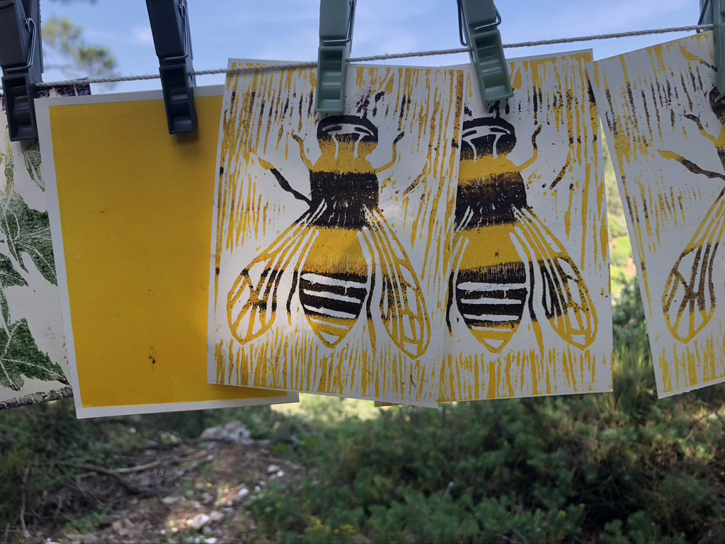 L’Atelier Milles Lieues au pied de la montagne Sainte Victoire, sphinx de provence, au centre aéré de Rousset – juillet 2019 – réalisations de cartes postales en gravure sur bois.