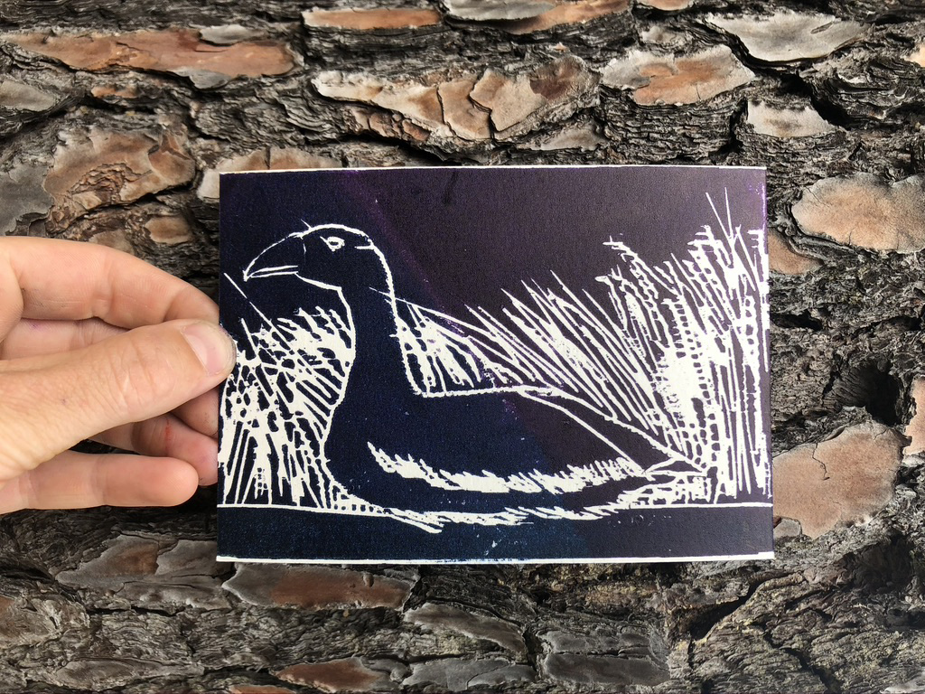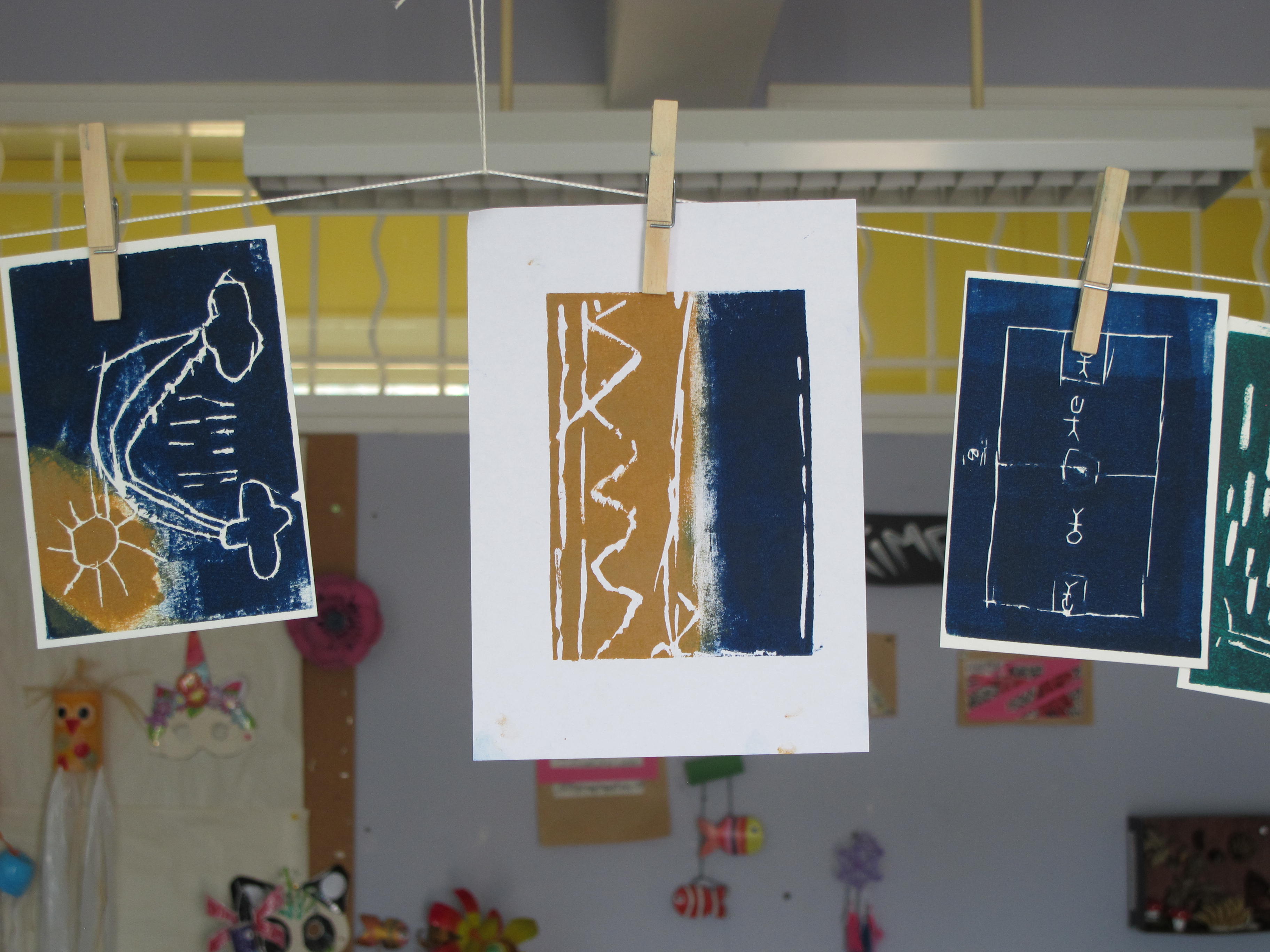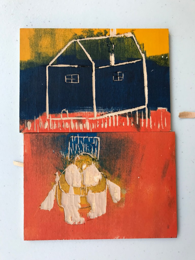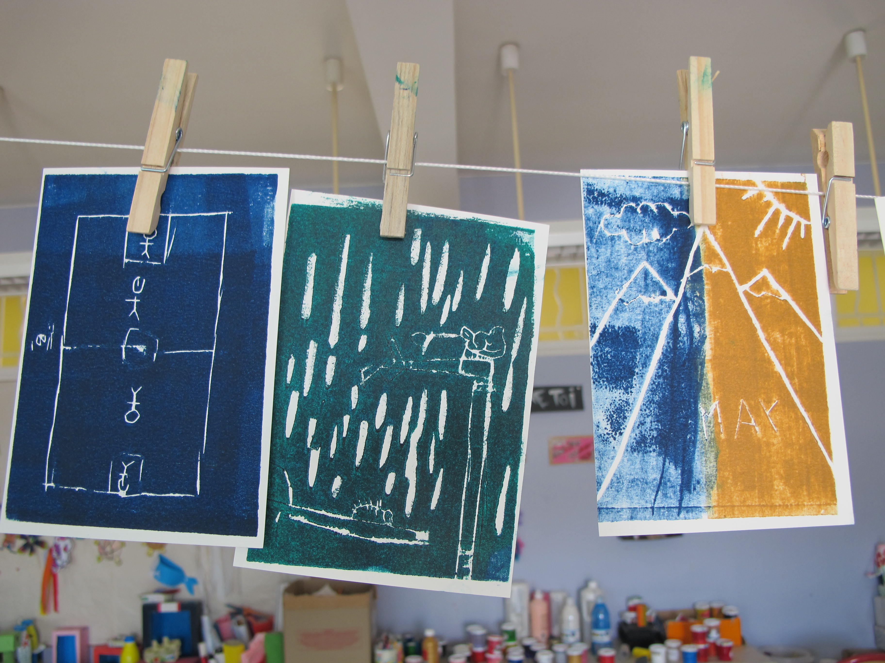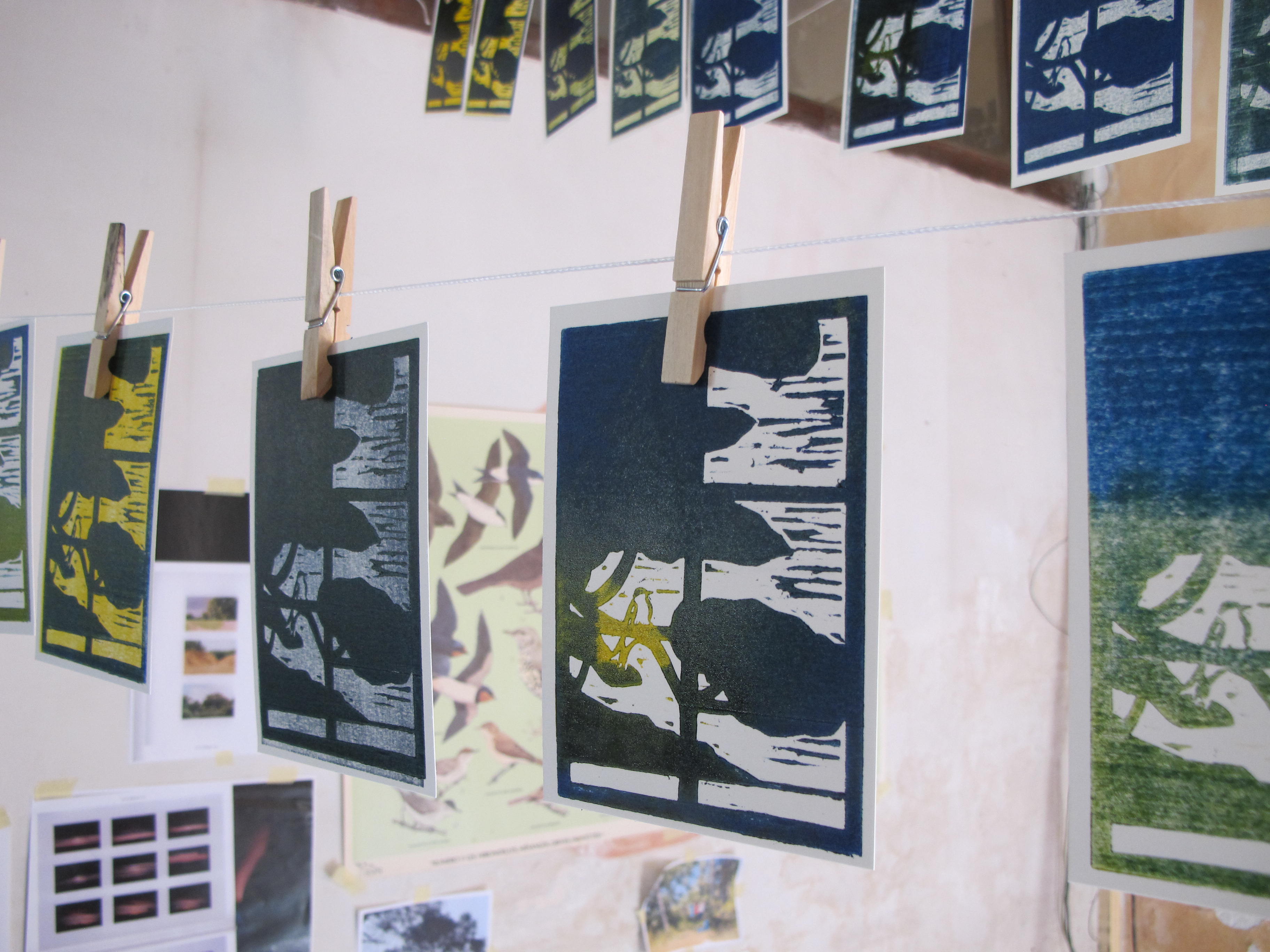 L’Atelier Milles Lieues au pied de la montagne Sainte Victoire, sphinx de provence, au centre aéré de Rousset – juillet 2019 – réalisations de cartes postales en gravure sur bois.