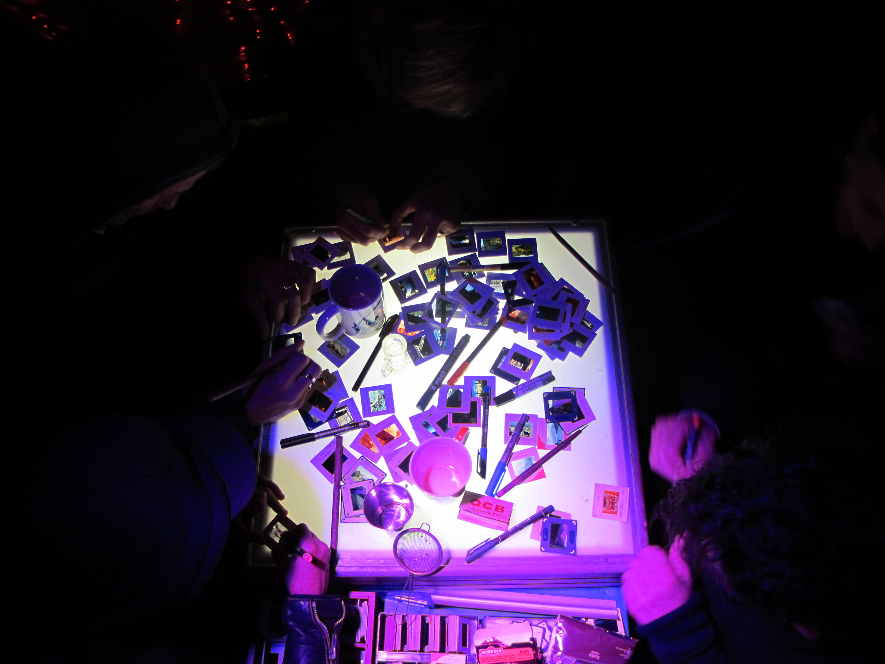gravure sur diapo : une bonne occasion de ré-inventer le monde du bout de la rue sur un morceau de pellicule et de le voir projeter!