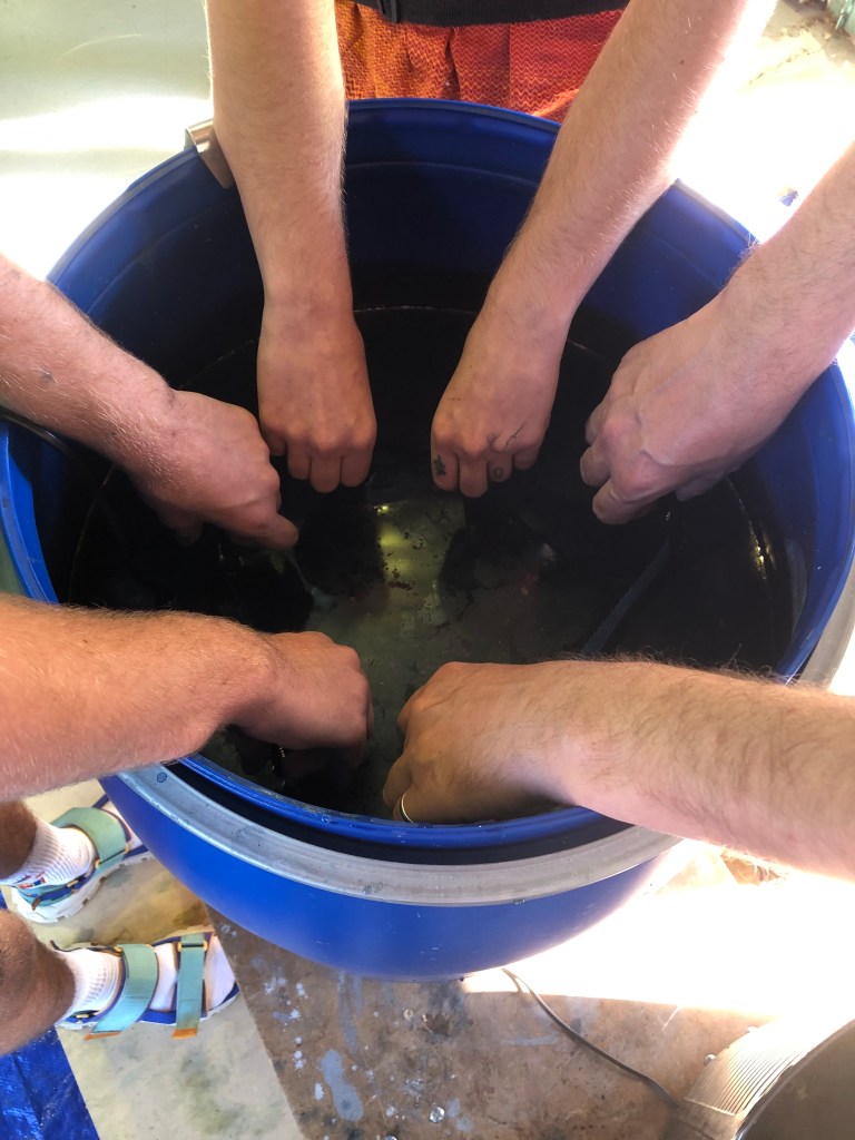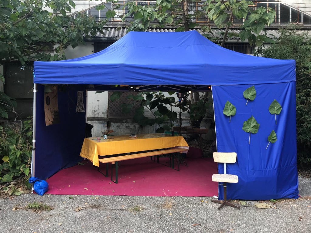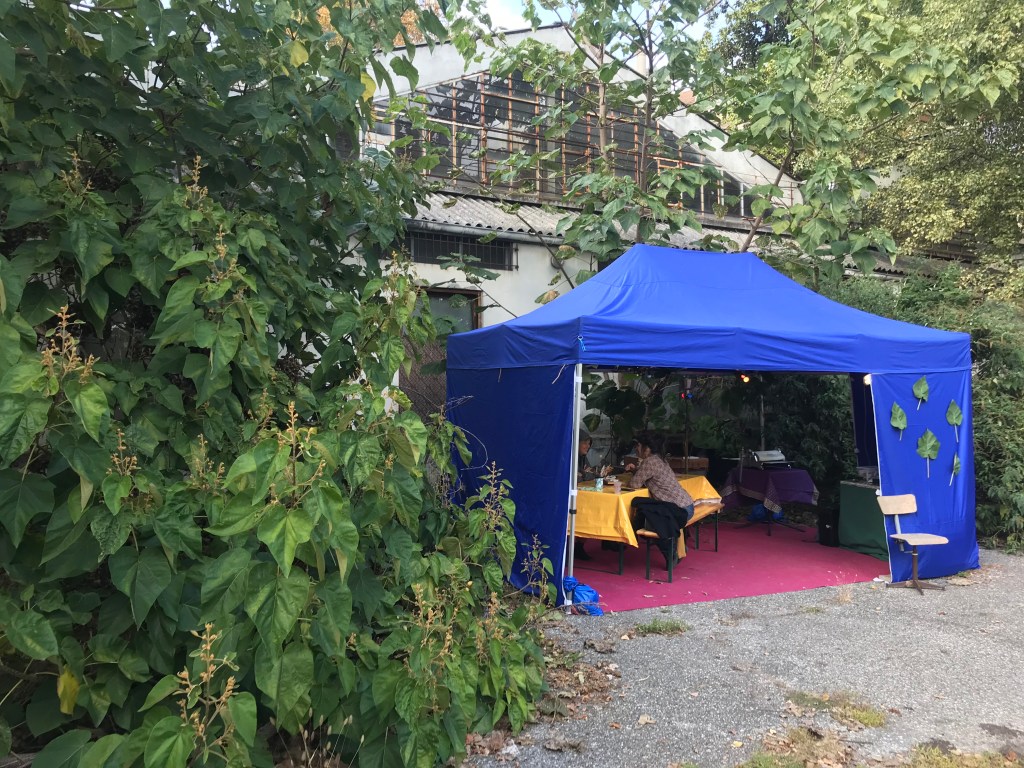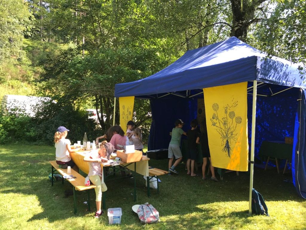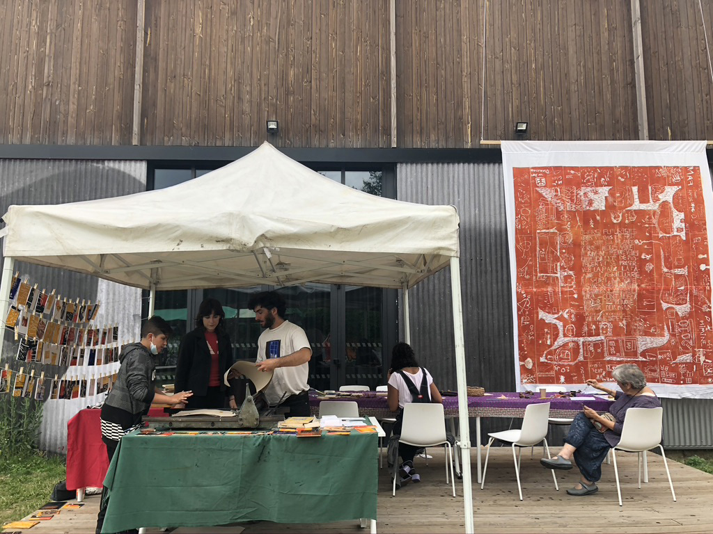Dès le 18 juillet 2023 et pendant un mois, un laboratoire de teinture et d’impression végétale a été installé dans la Lumbricina au sein du CIAPV. Cet espace d’atelier s’est ouvert à de multiples temps de rencontres et de co-création avec différents groupes de personnes, permettant la réalisation de 2 tentures teintes, imprimées et cousues.