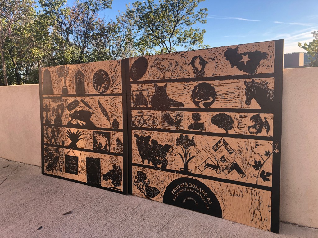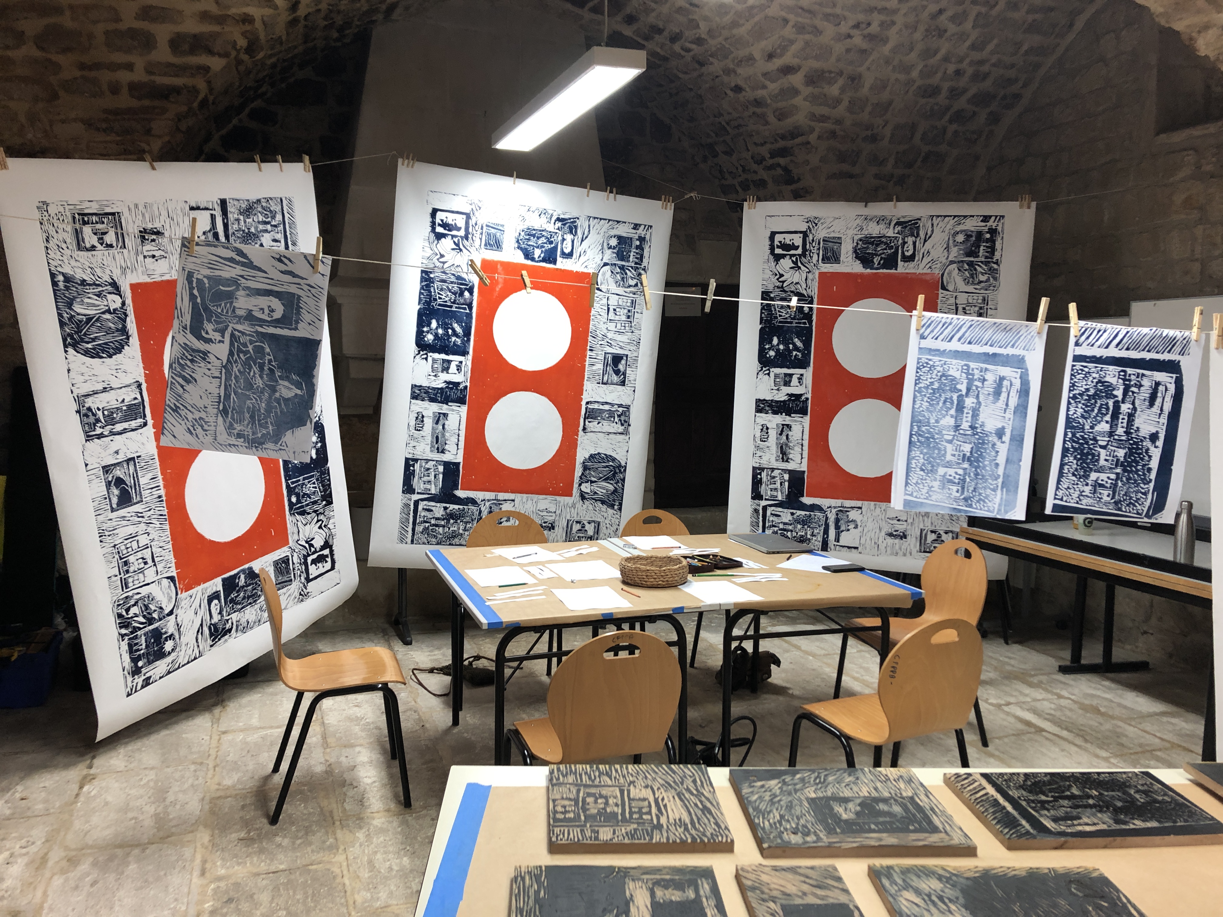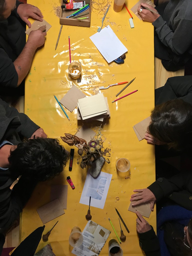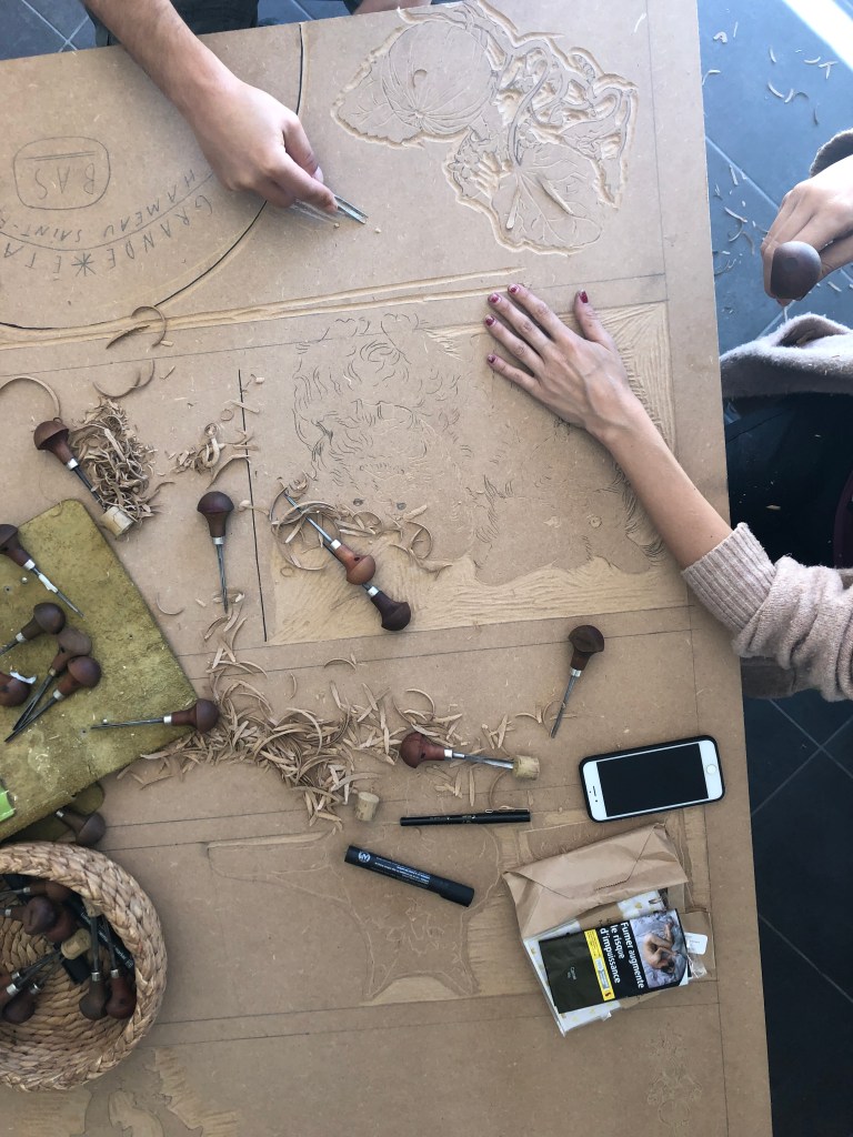 Du 21 octobre au 4 novembre 2022, l’Atelier a fait escale au couvent des cordeliers : les outils déployés sous les voûtes de pierres, une grande matrice de bois gravée au fur et à mesure des rencontres avec les habitant·es et adhérent·es du centre social de la Cordelière.
