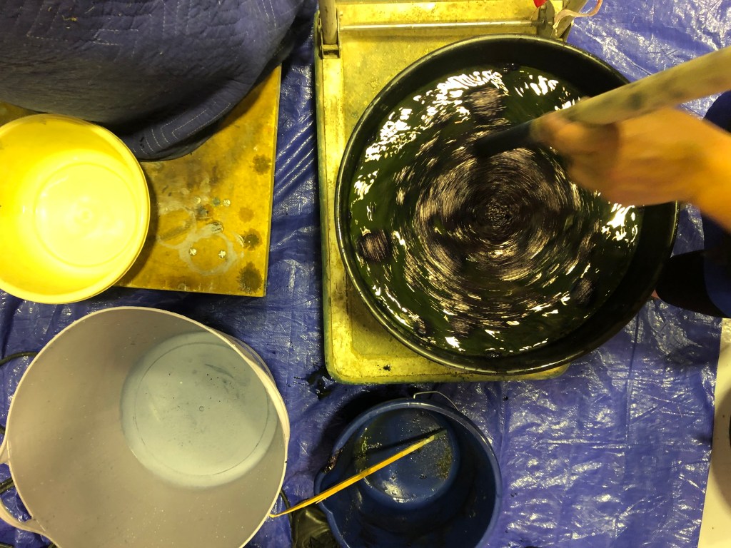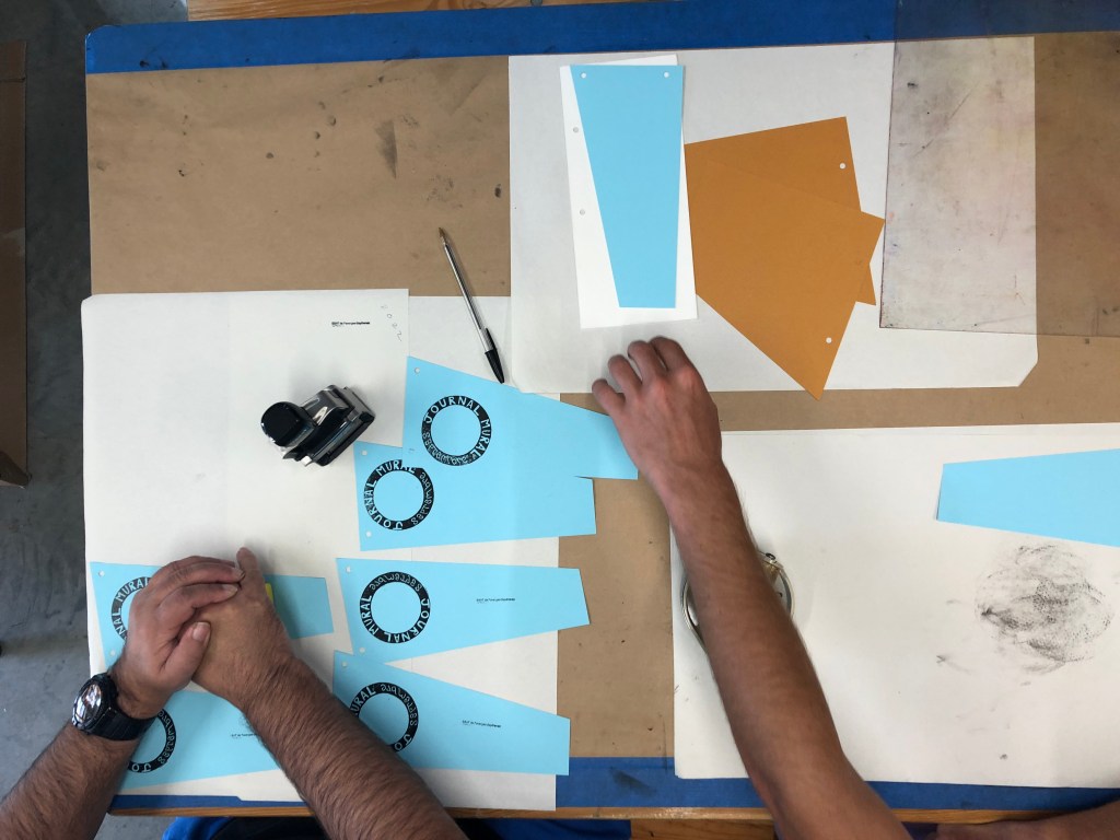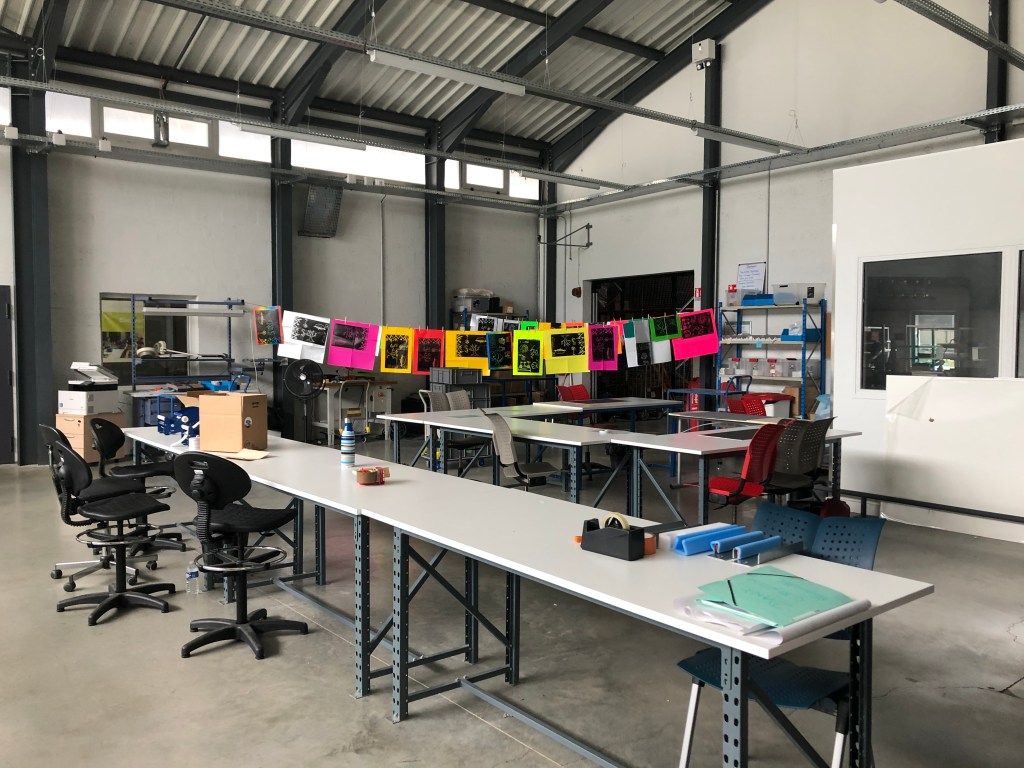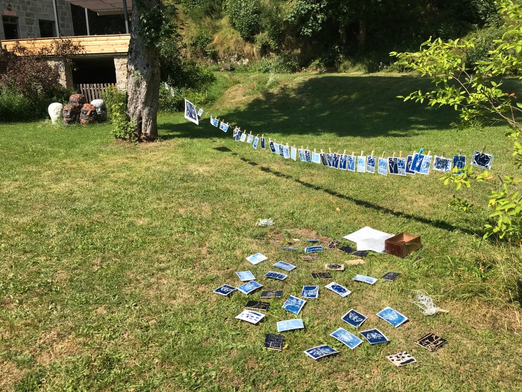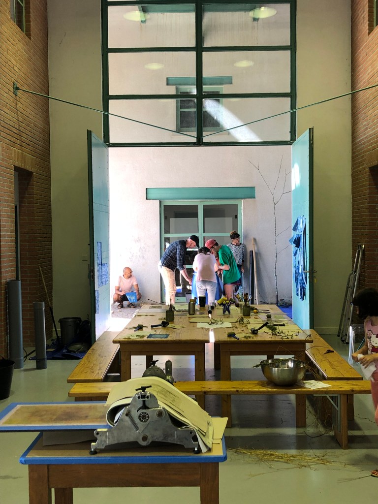 Au fil des semaines, l’espace s’est successivement transformé en atelier de teinture autour d’une cuve d’indigo, en laboratoire d’impression à l’argile et aux encres végétales, en atelier typographique et monotypes, en labo photo expérimental d’anthotypes, puis en espace de couture-assemblage avant d’accueillir un temps de restitution collective.