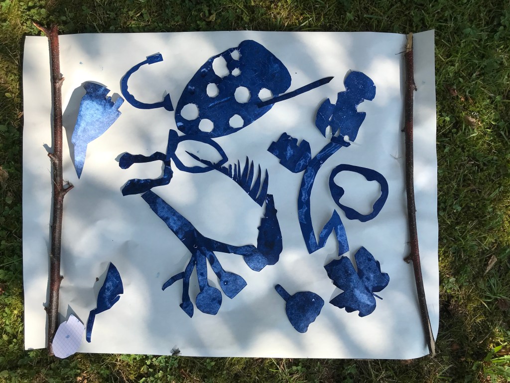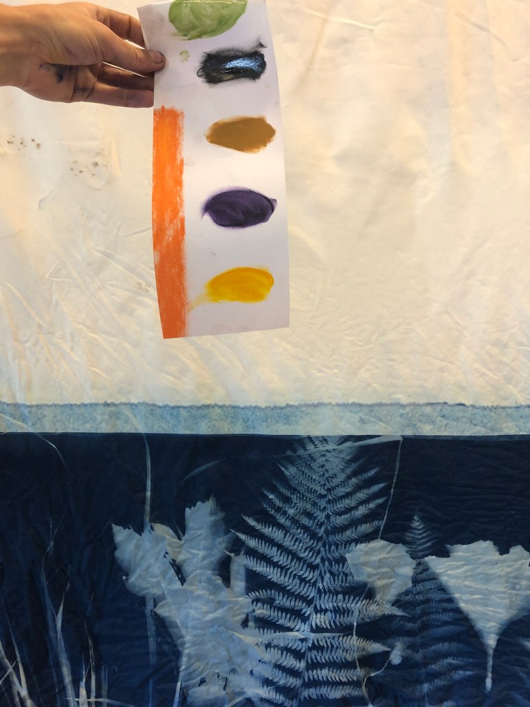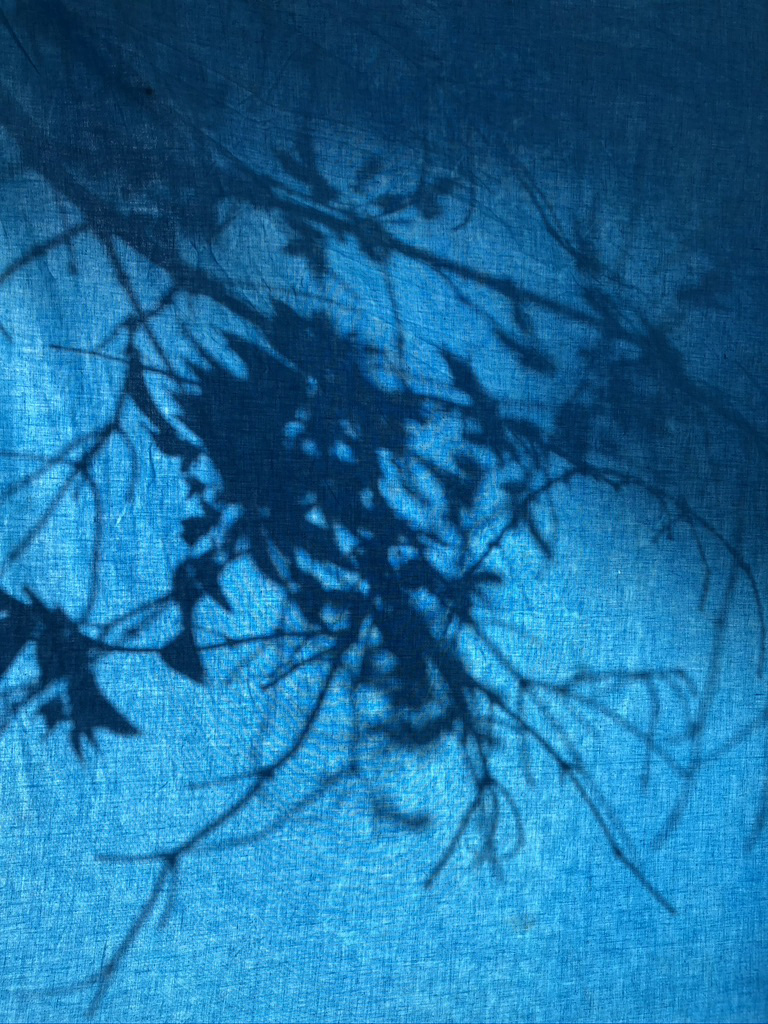 SOUS LES FOUGÈRES - teinture à l’indigo avec réserves à l’argile – empreintes de fougères de l’île, teintures végétales (avocat, tanaisie, sumac des corroyeur, galles de chêne, curcuma) anthotype de la ronde des insectes au jus de curcuma.
