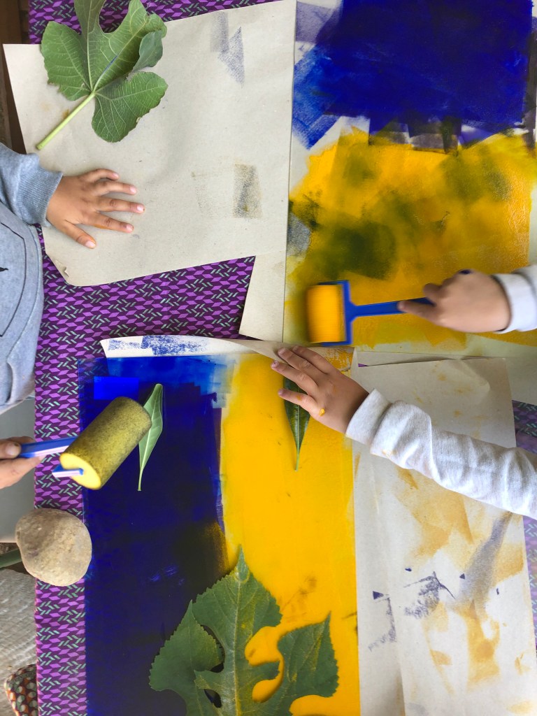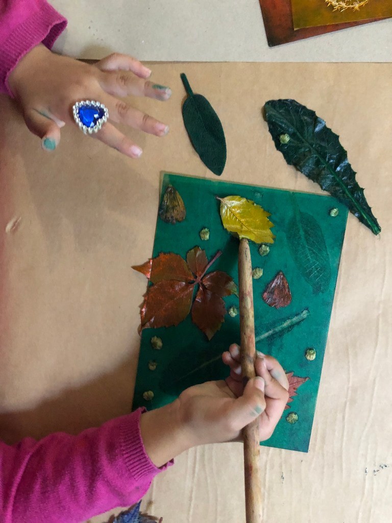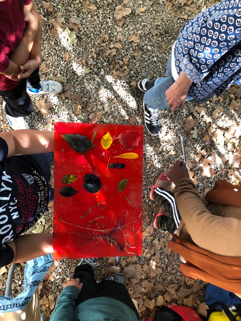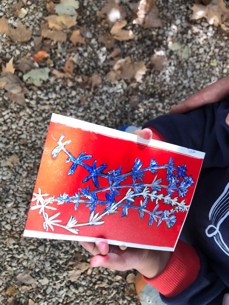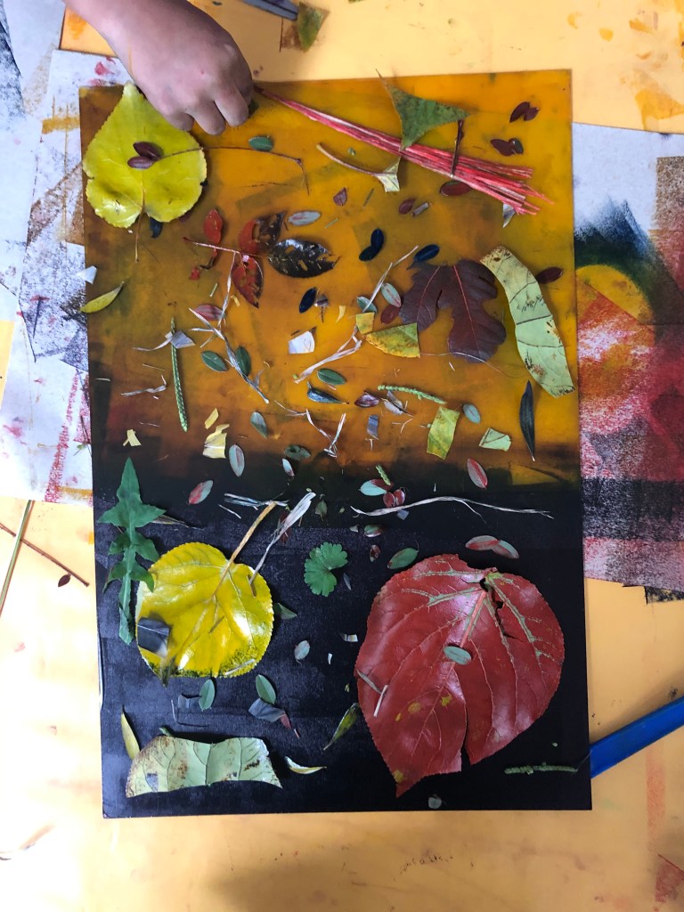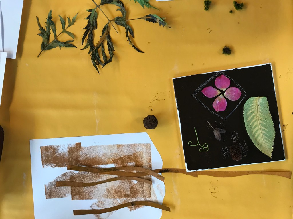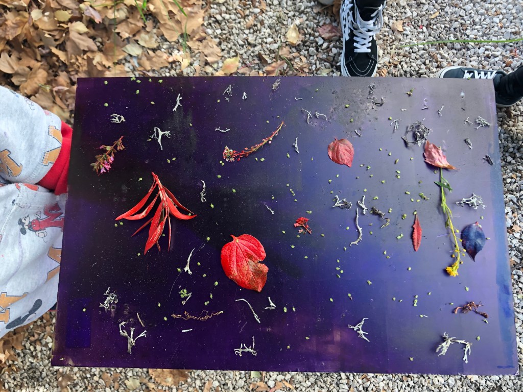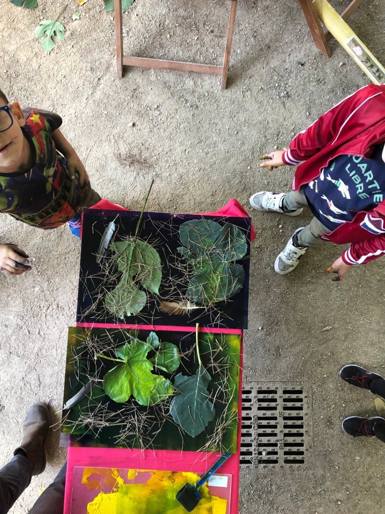 Une chouette après midi d’automne à farfouiller et récolter les empreintes des plantes, plumes et écorces glanées dans le jardin communautaire !