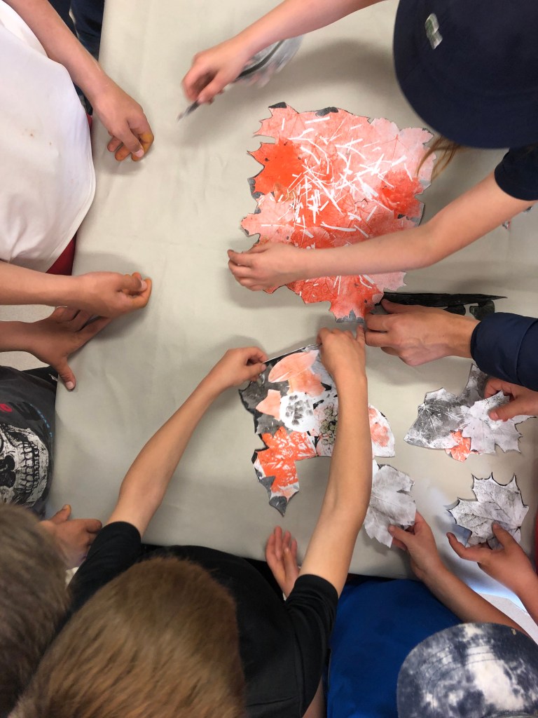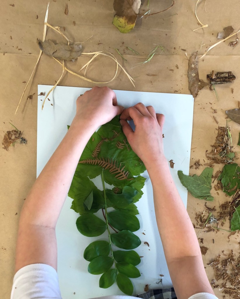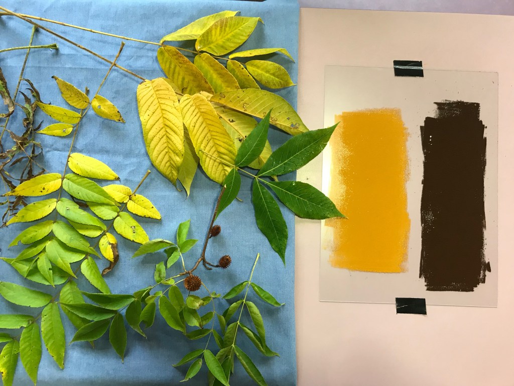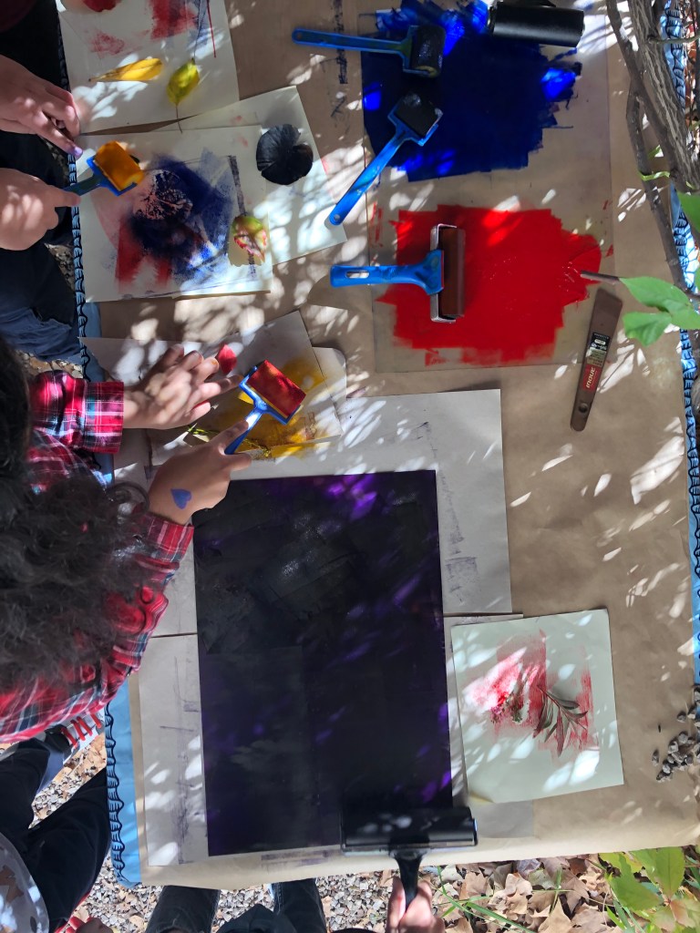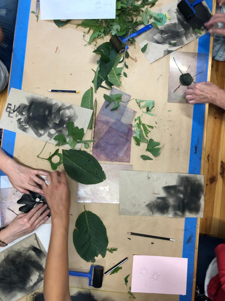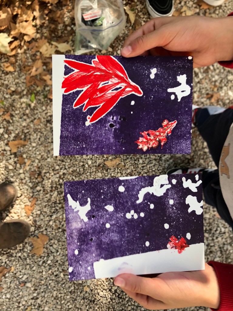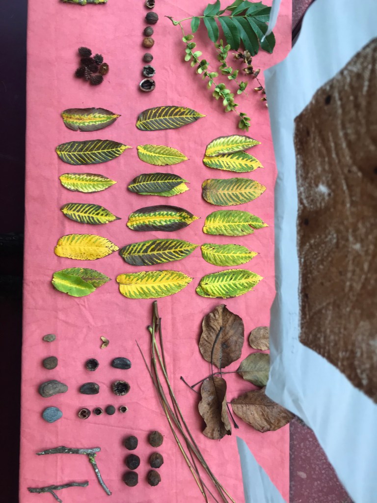 Une chouette après midi d’automne à farfouiller et récolter les empreintes des plantes, plumes et écorces glanées dans le jardin communautaire !