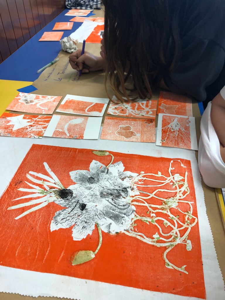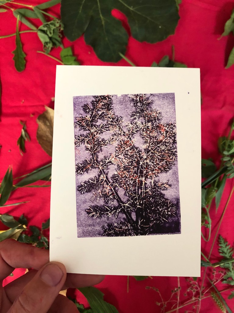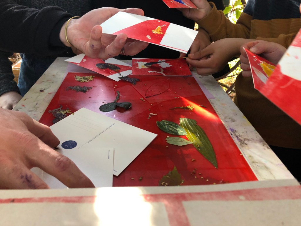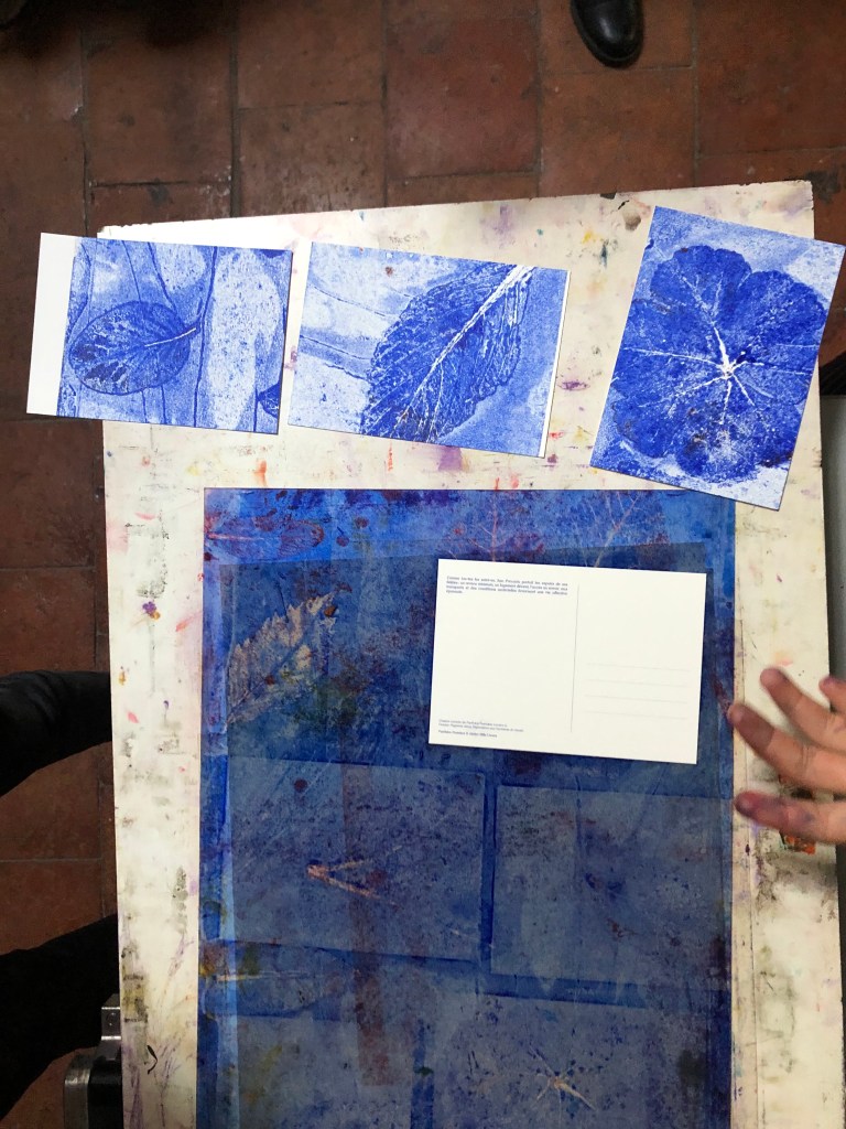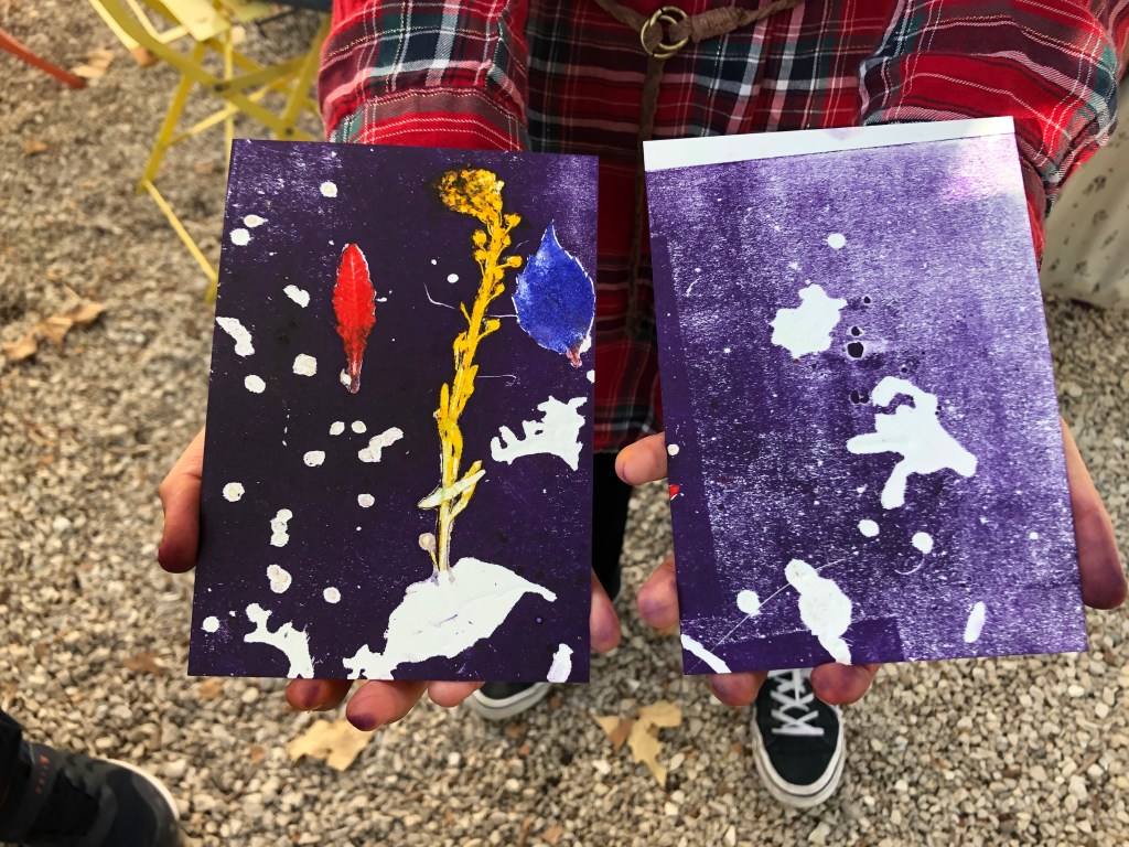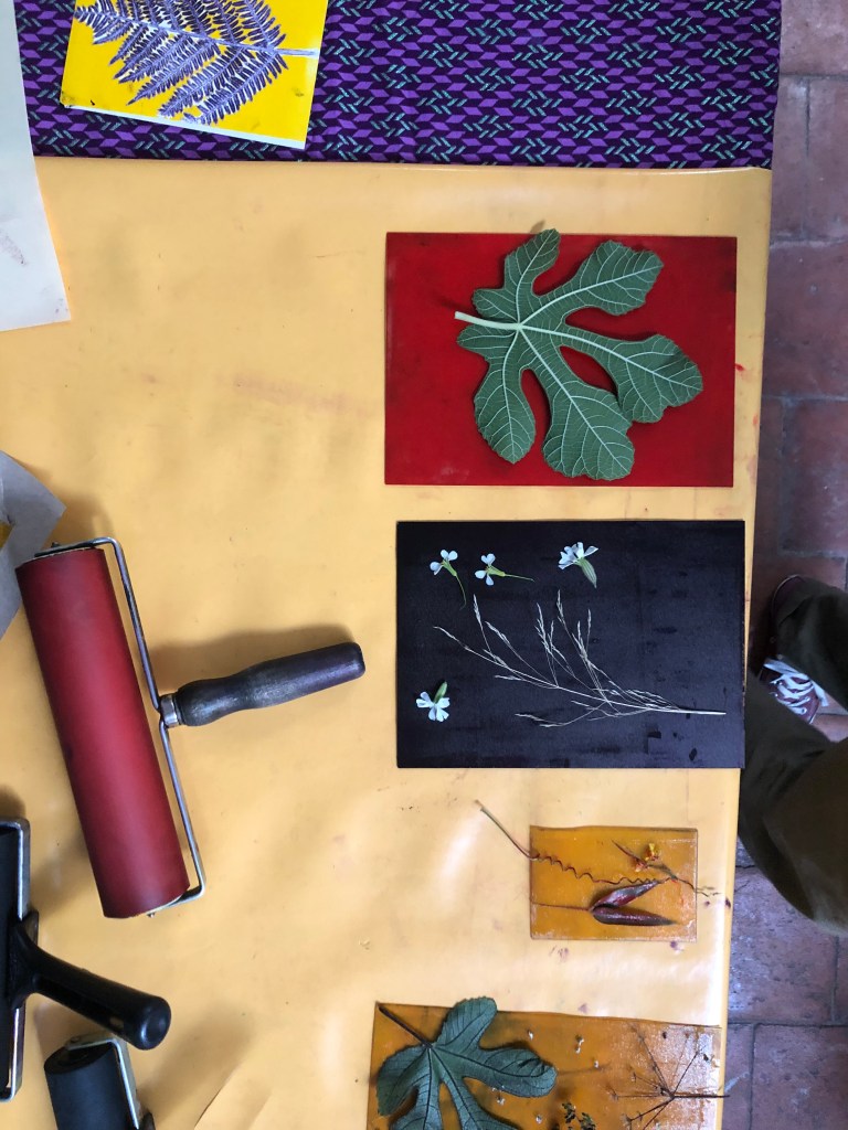Récoltes et monotypes avec les adhérent.es de Mots à mots. Feu flammes l’automne, du soleil dans le grand jardin du couvent Levat à Marseille, des cartes postales et des grands tirages-empreintes de nos récoltes!