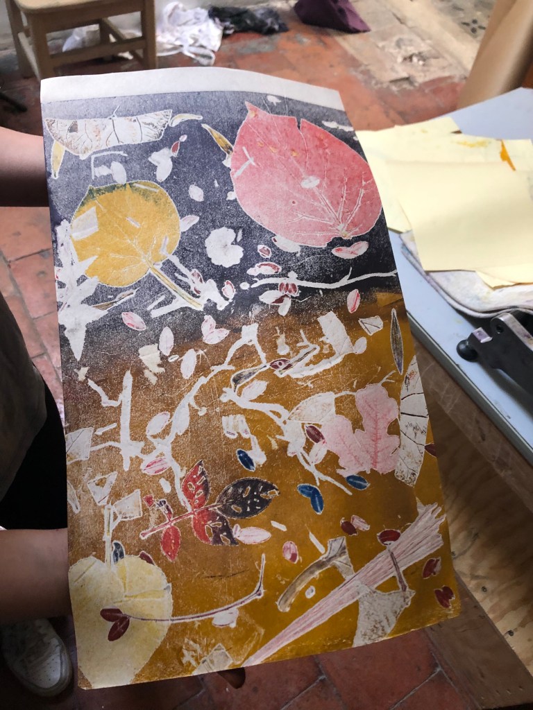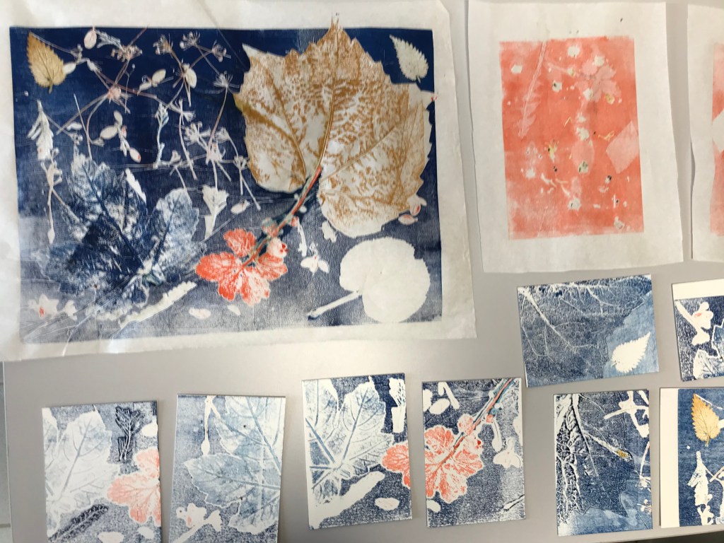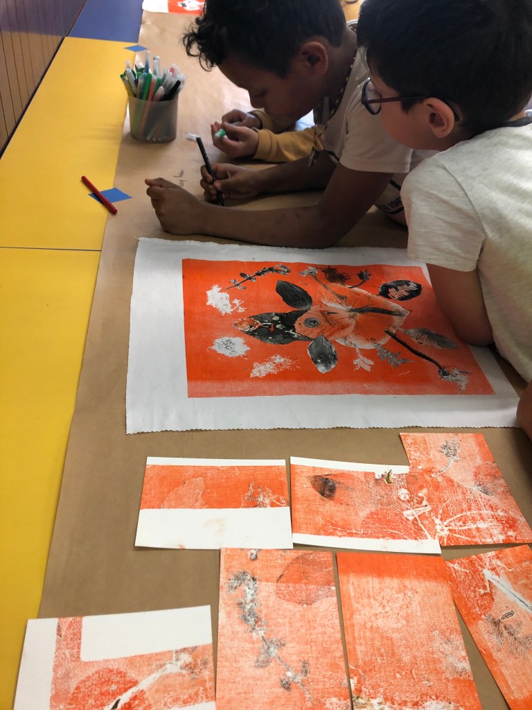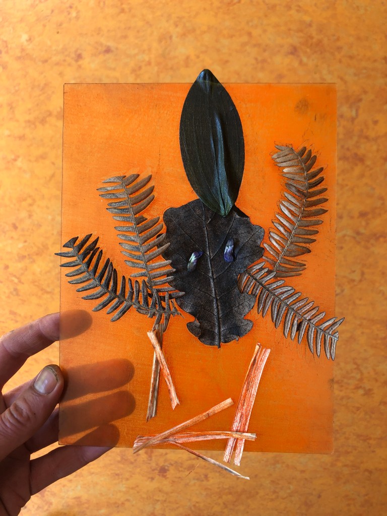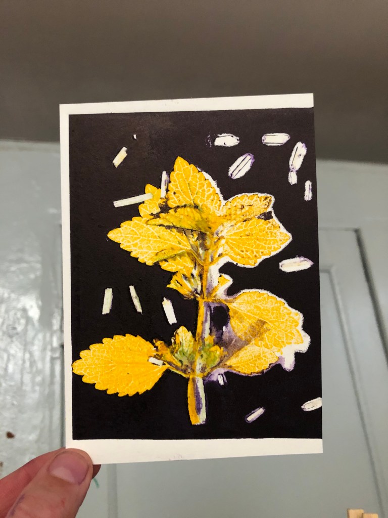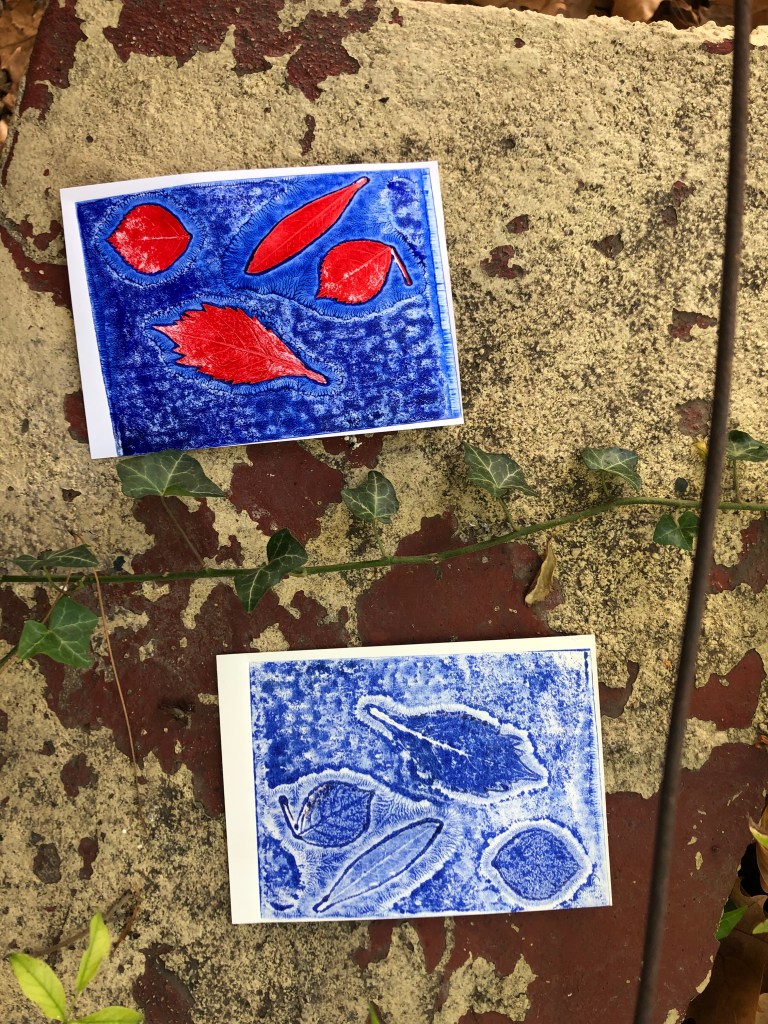 Récoltes et monotypes avec les adhérent.es de Mots à mots. Feu flammes l’automne, du soleil dans le grand jardin du couvent Levat à Marseille, des cartes postales et des grands tirages-empreintes de nos récoltes!