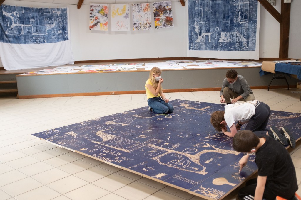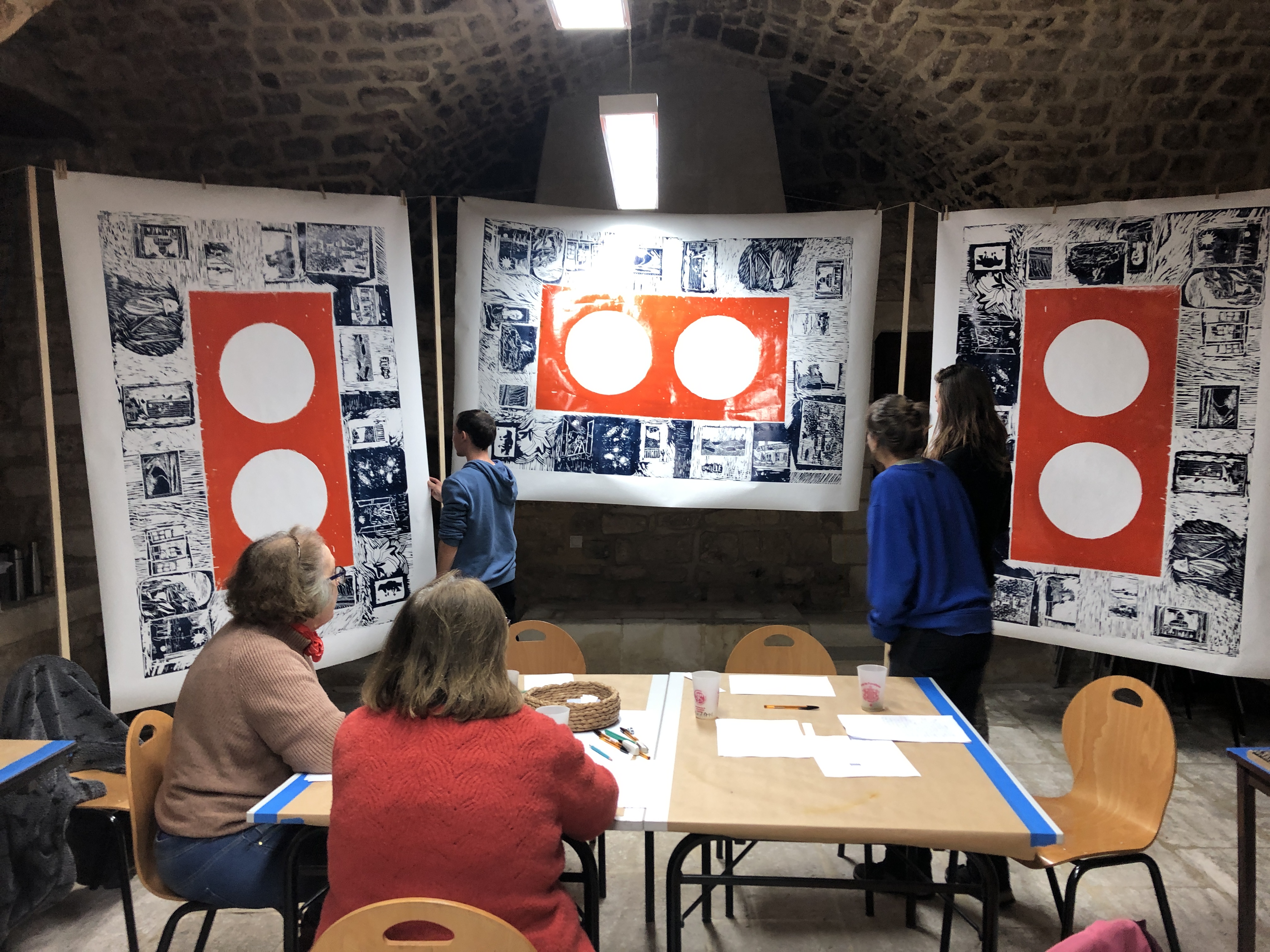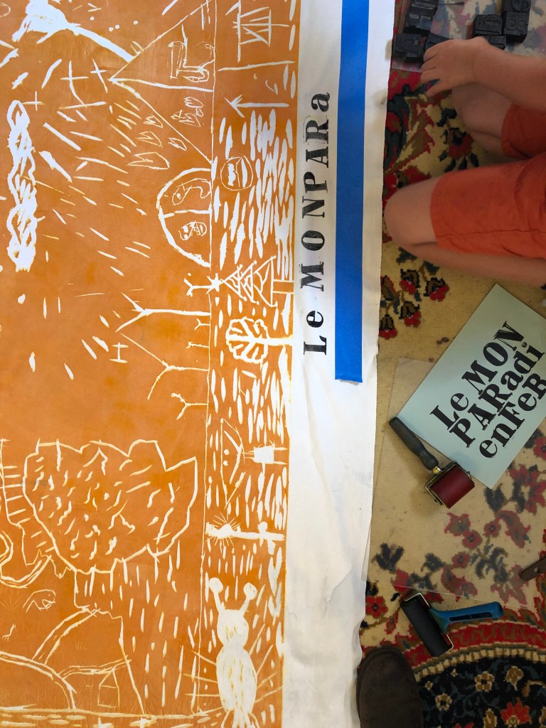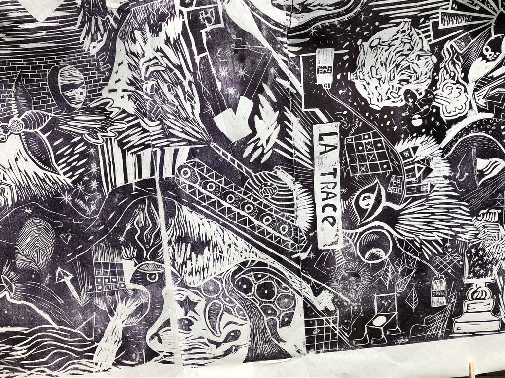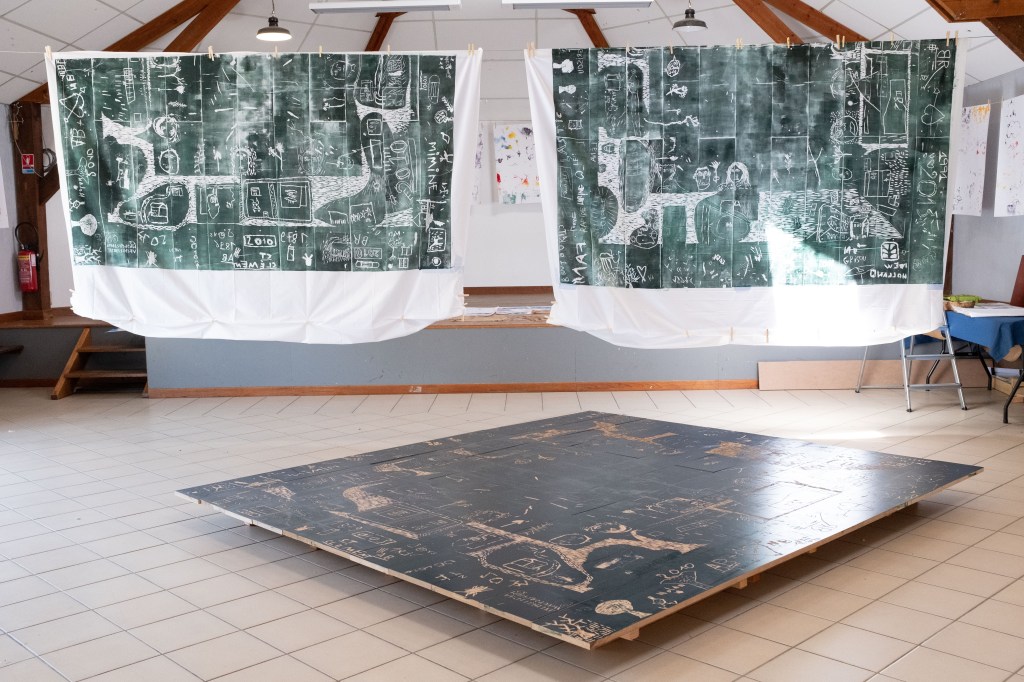 Réalisation collective d’une grande gravure sur bois dans le cadre de TRANSAT, le festival d’été des résidences d’artistes piloté par les Ateliers Medicis et avec le soutien du Ministère de la Culture.