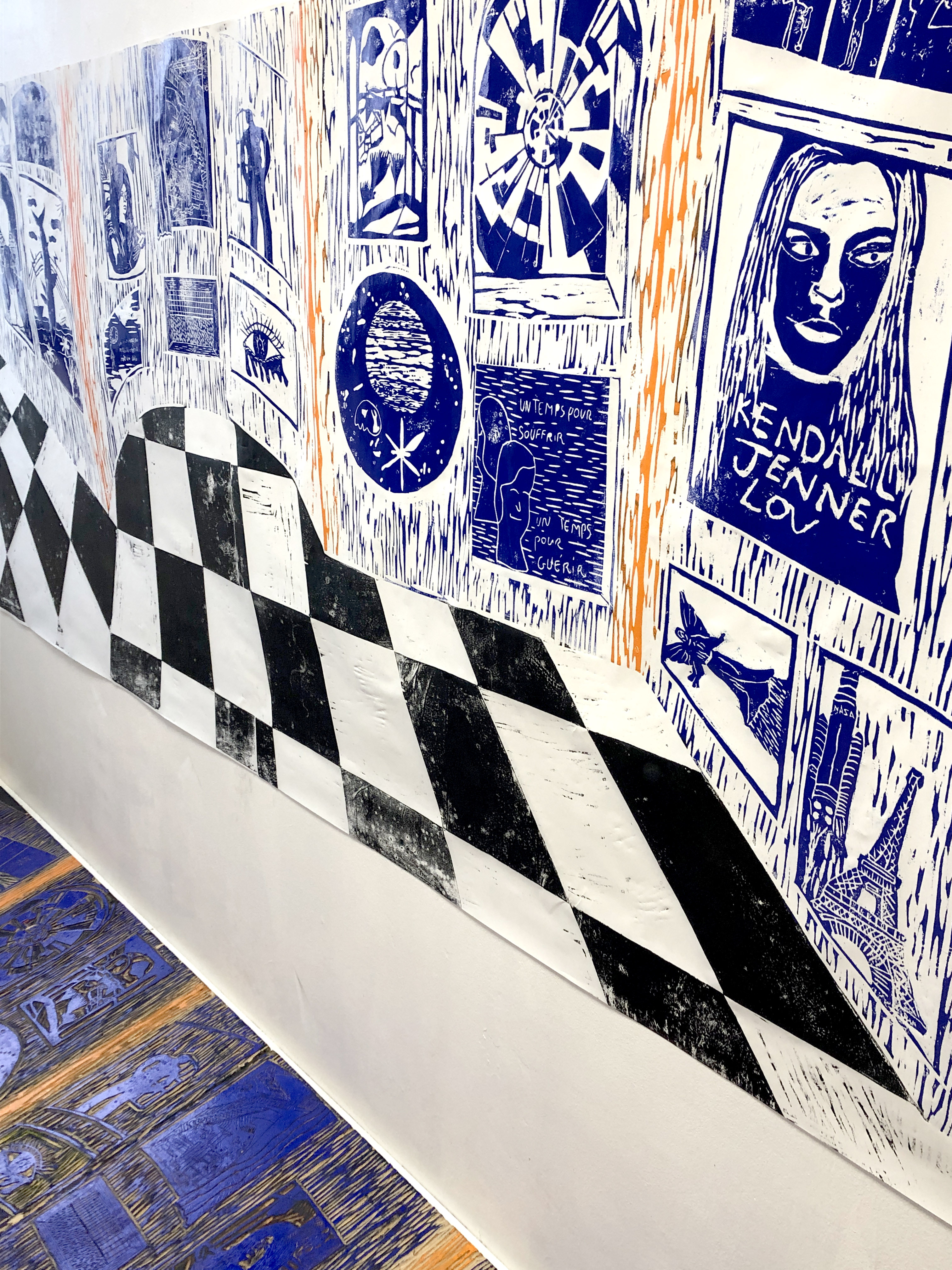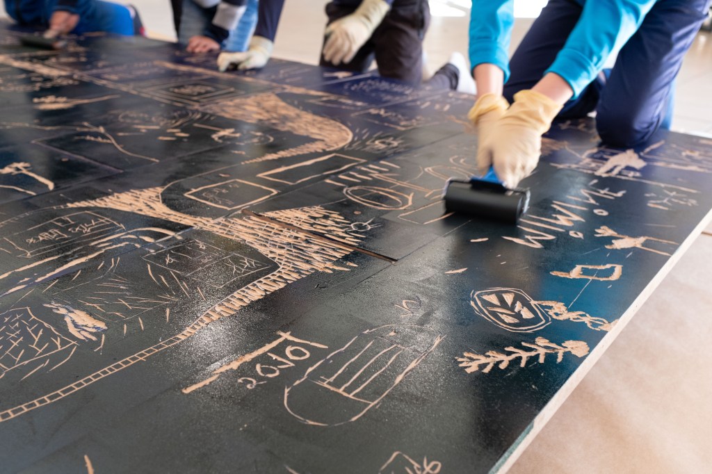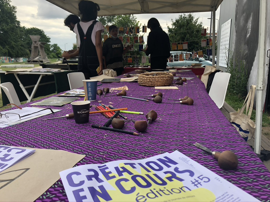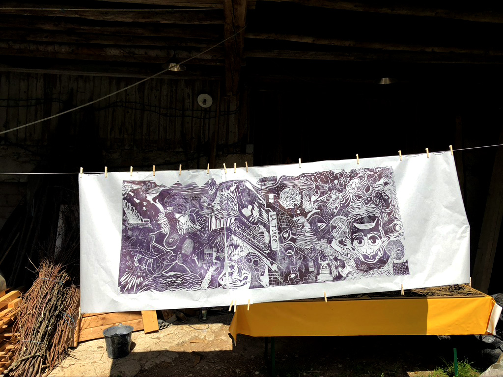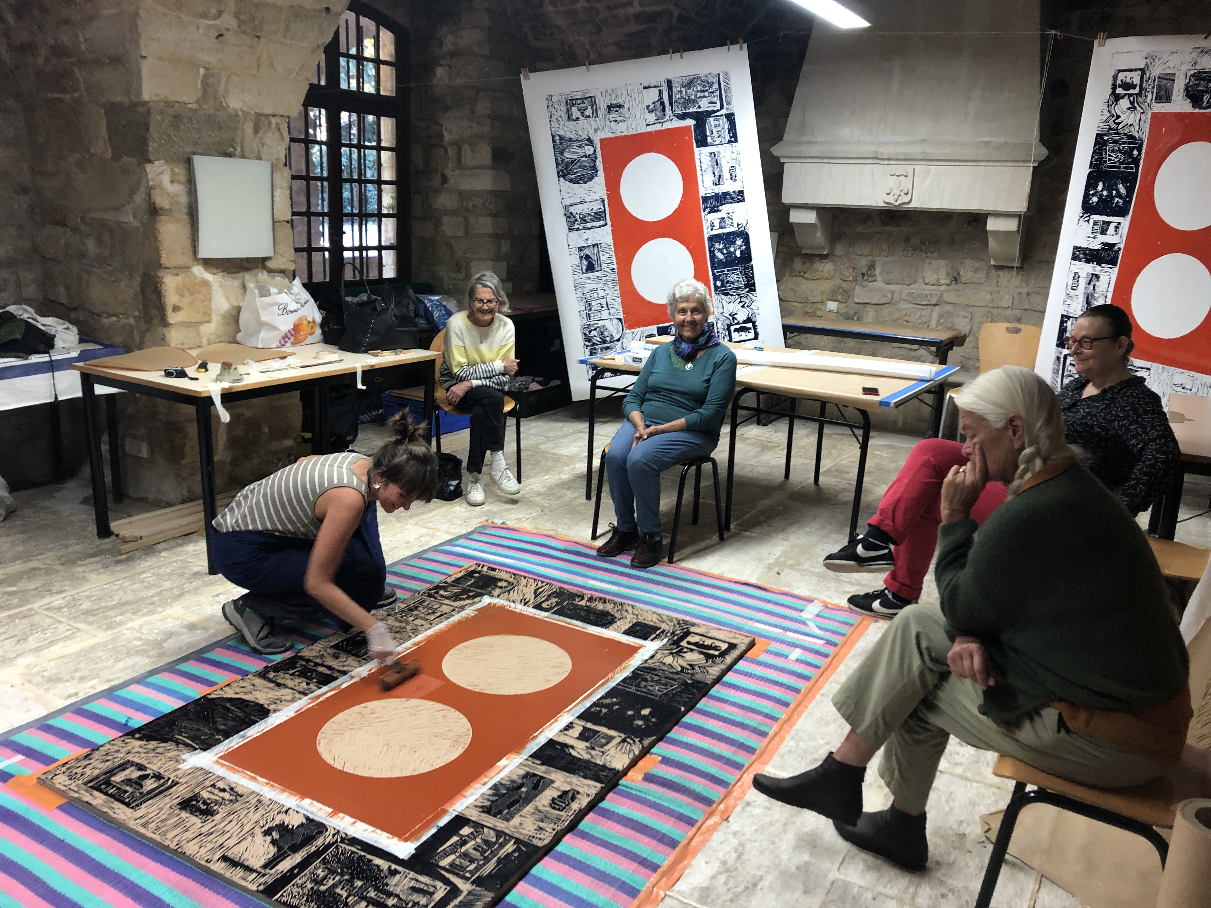 Réalisation collective d’une grande gravure sur bois dans le cadre de TRANSAT, le festival d’été des résidences d’artistes piloté par les Ateliers Medicis et avec le soutien du Ministère de la Culture.