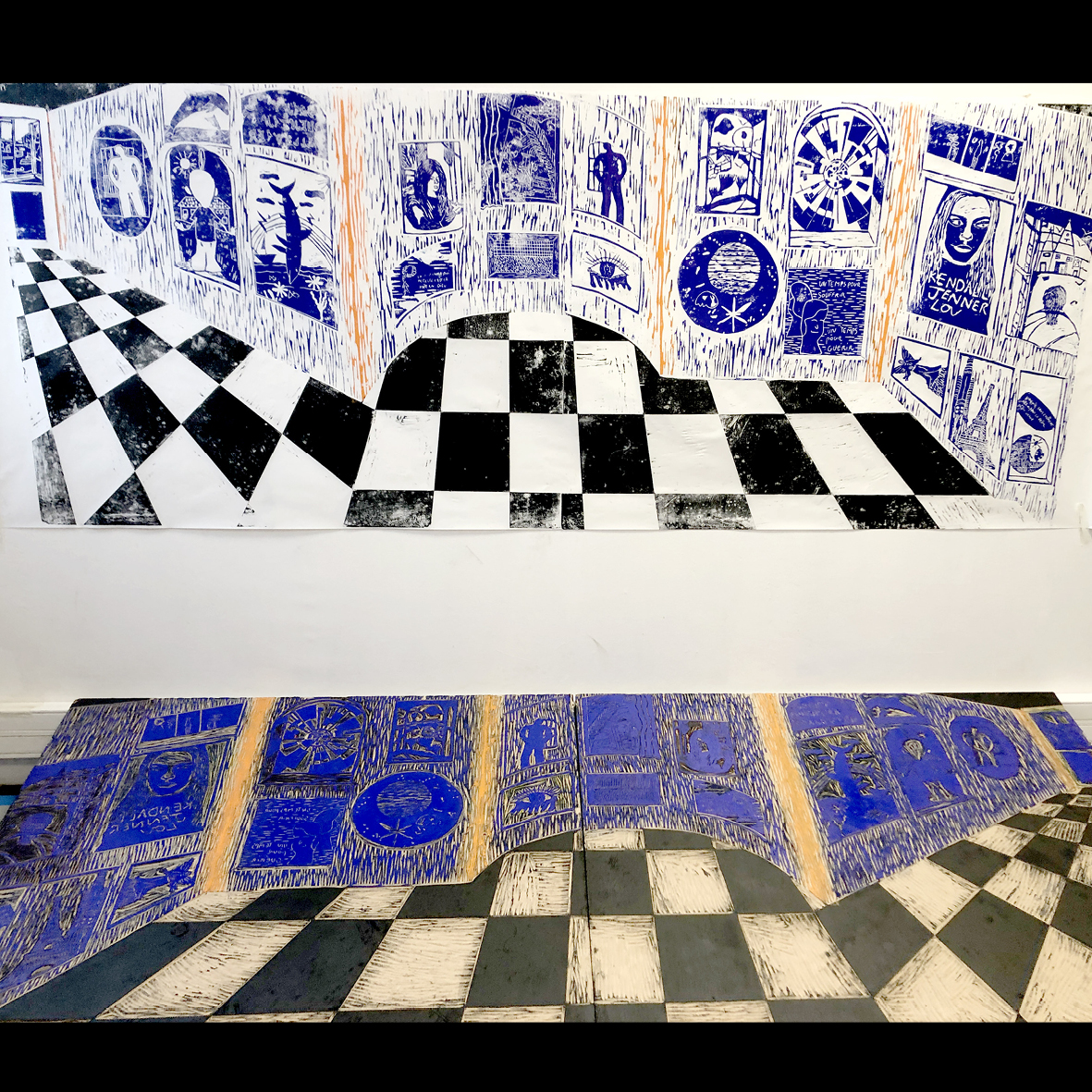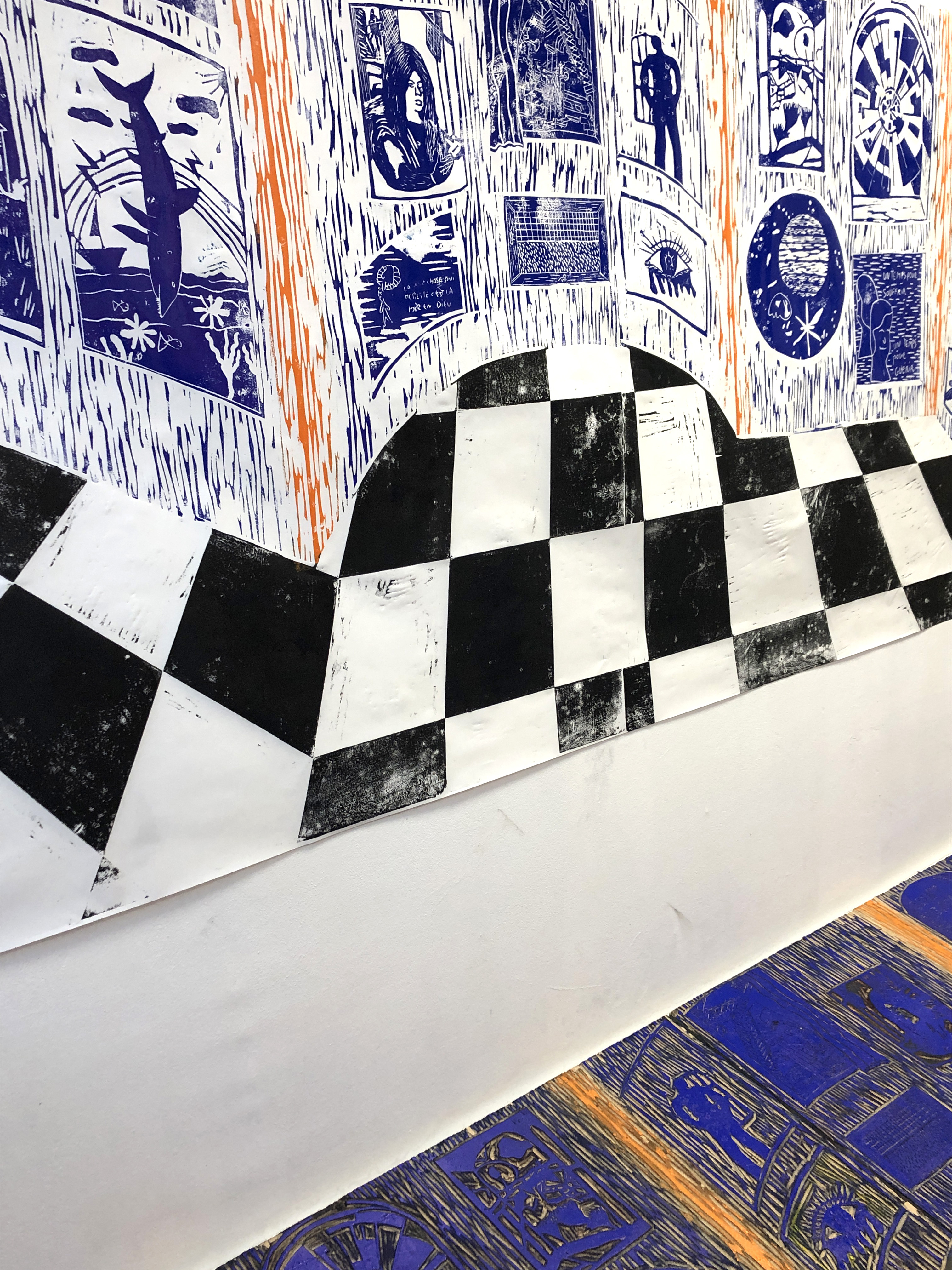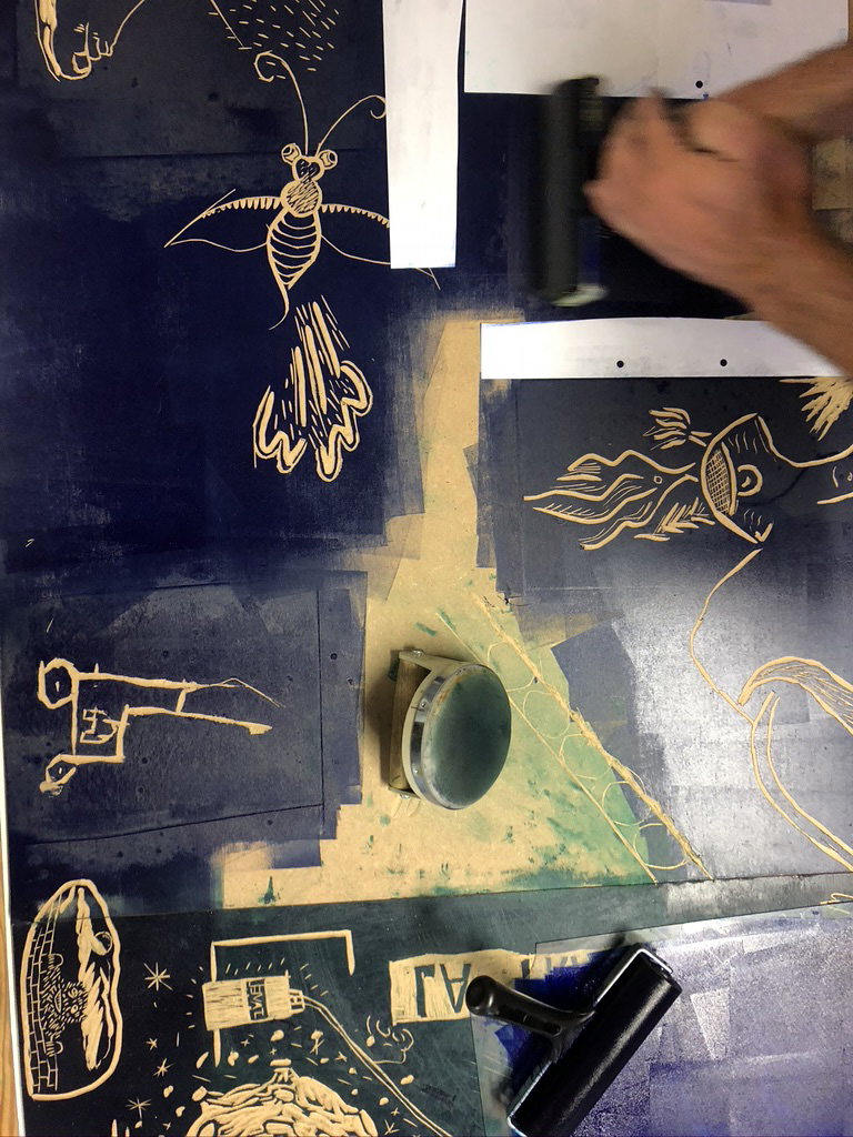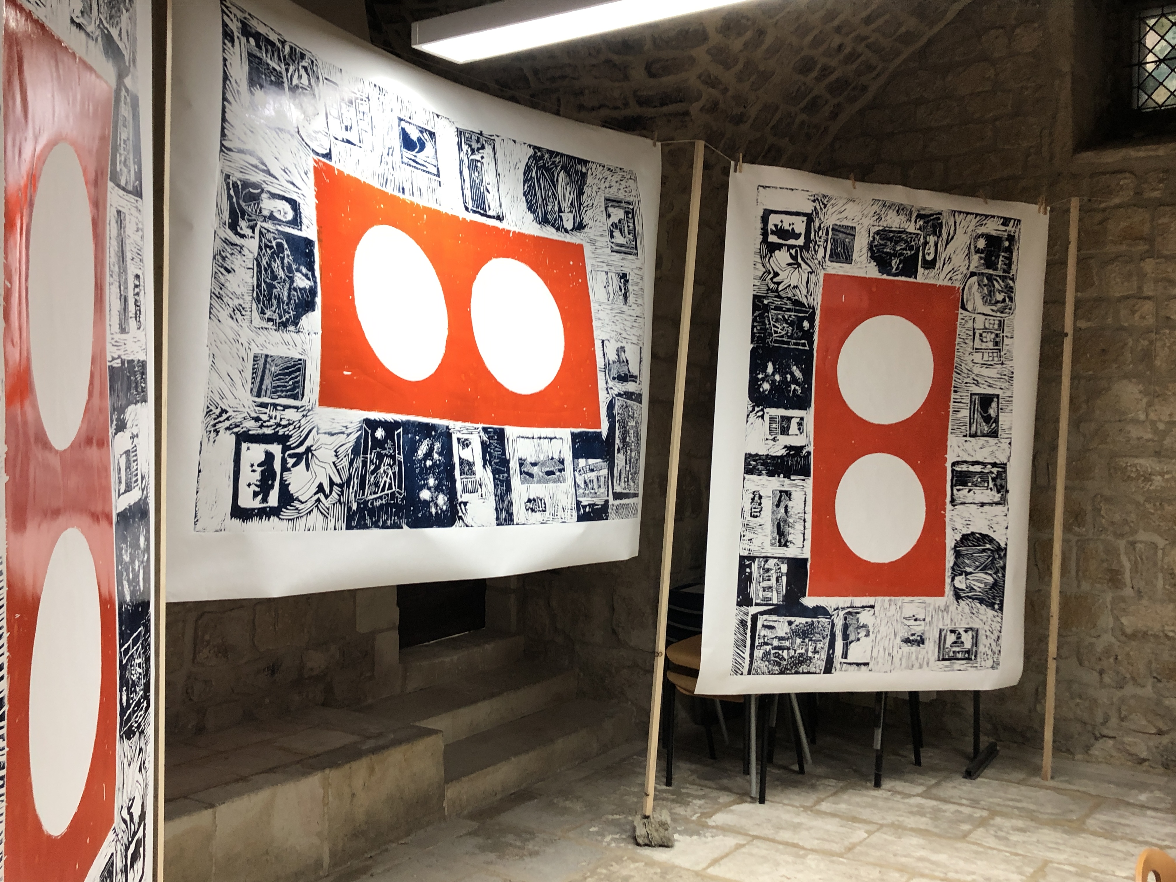 Réalisation collective d’une grande gravure sur bois dans le cadre de TRANSAT, le festival d’été des résidences d’artistes piloté par les Ateliers Medicis et avec le soutien du Ministère de la Culture.