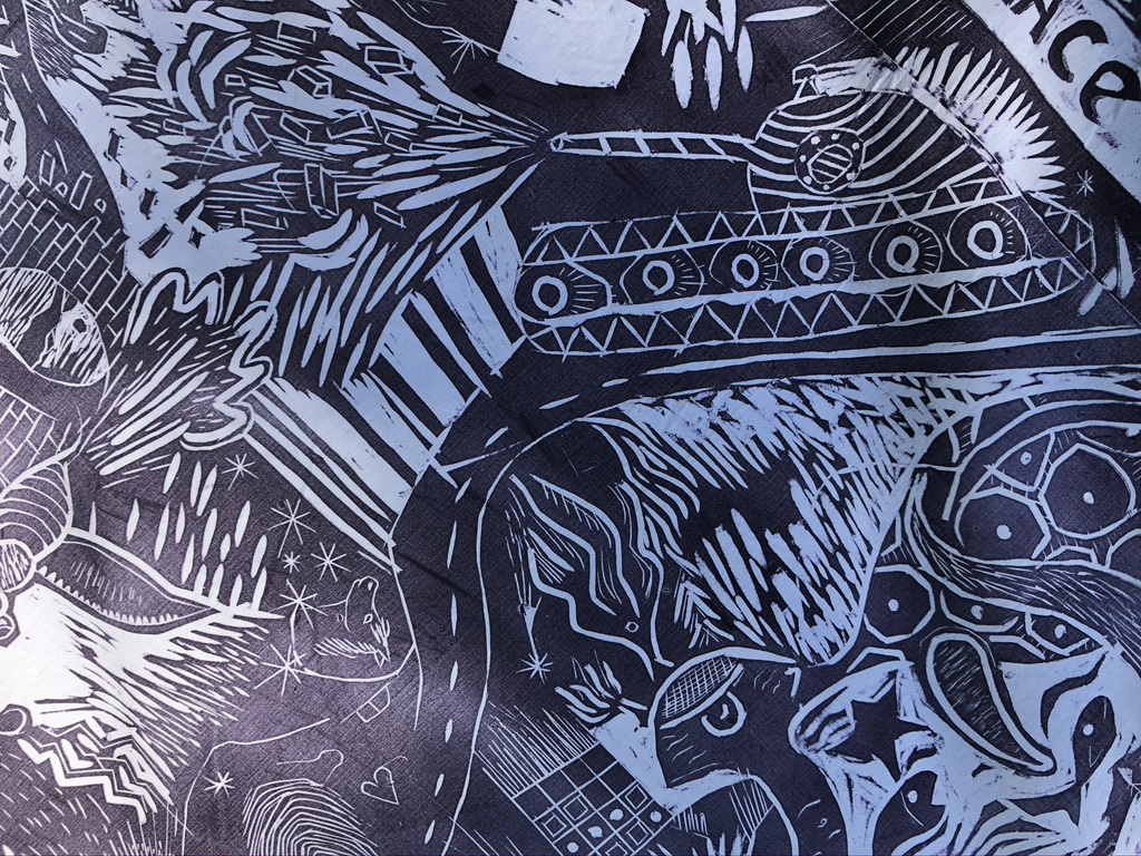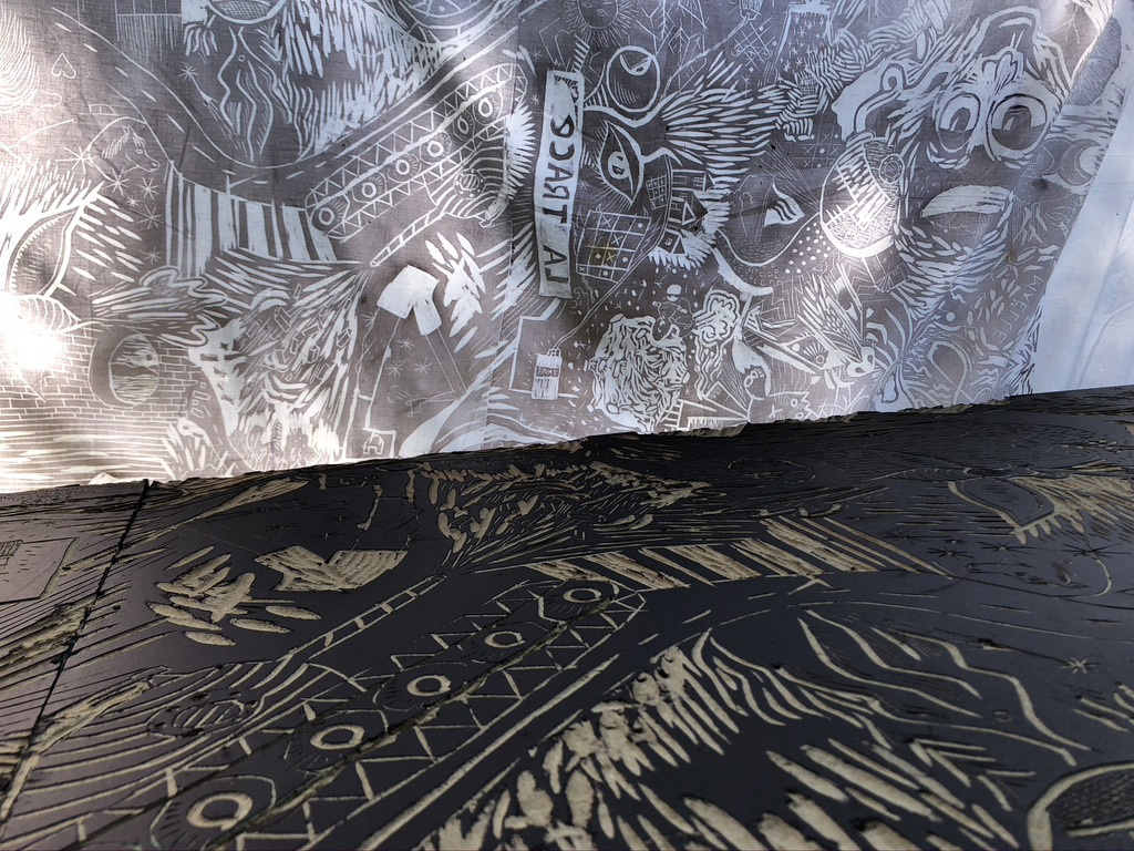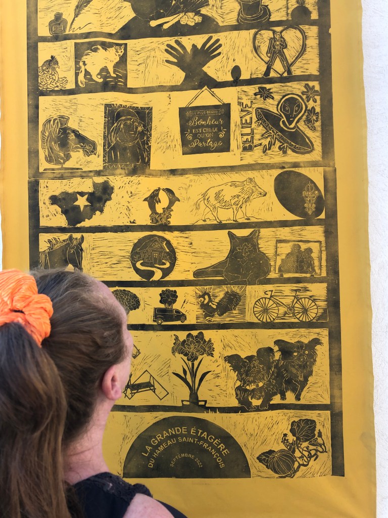 En septembre dernier, l’Atelier Mille Lieues a fait escale un mois durant à Draguignan, au sein du hameau solidaire Saint François. Les rencontres furent chouettes et les copeaux nombreux : au fil du temps les habitant·es étaient invité·es à venir déposer et graver un objet ou une image importantes pour elleux sur la grande matrice de bois. L’ensemble de cette collection fut gravée puis imprimée sur de grands formats de textiles.