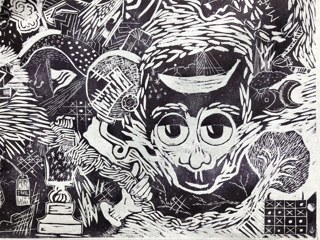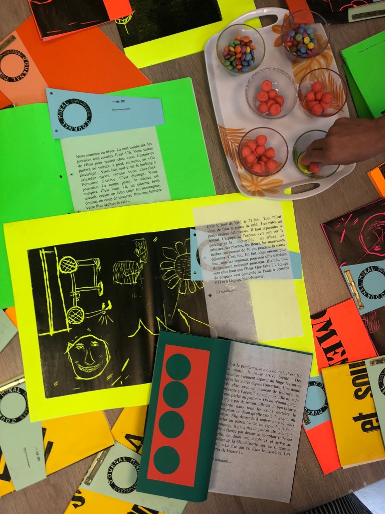 Nous avons aussi ouvert les valises, attrapé les gouges et déballé les encres début octobre pour fabriquer des tampons et accompagner en images les textes issus des ateliers d’écriture des adhérent·es de l’association !