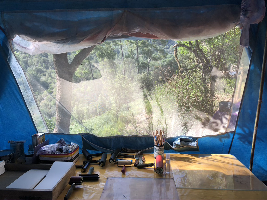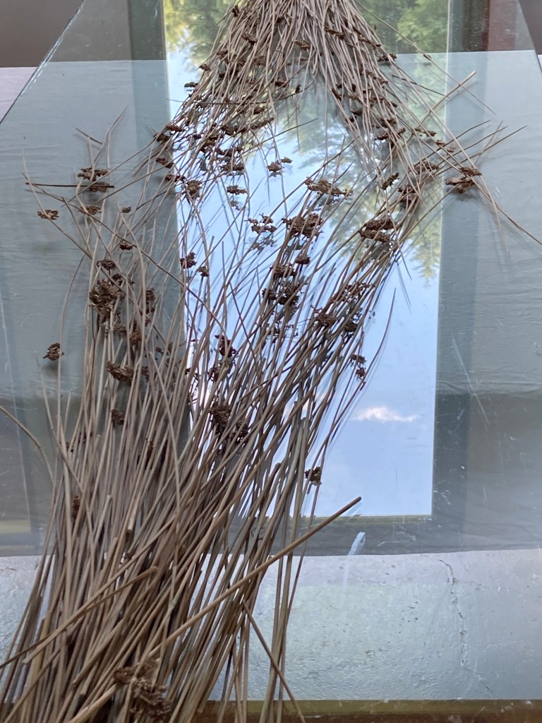 La contiguïté entre l’espace d’atelier et l’environnement extérieur foisonnant de l’île nous a permis d’opérer un certain nombre d’allers-retours, ballades-récoltes et temps d’observations propices à nourrir nos gestes et nos interrogations.