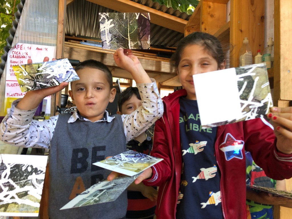 Chouette moment de partages et de rencontres, nous avons accroché le plancher gravé avec les enfants à Vieillespesse sur le temps long de notre résidence, installé l’atelier de cartes postales en gravure sur bois pour cette belle journée de clôture.
