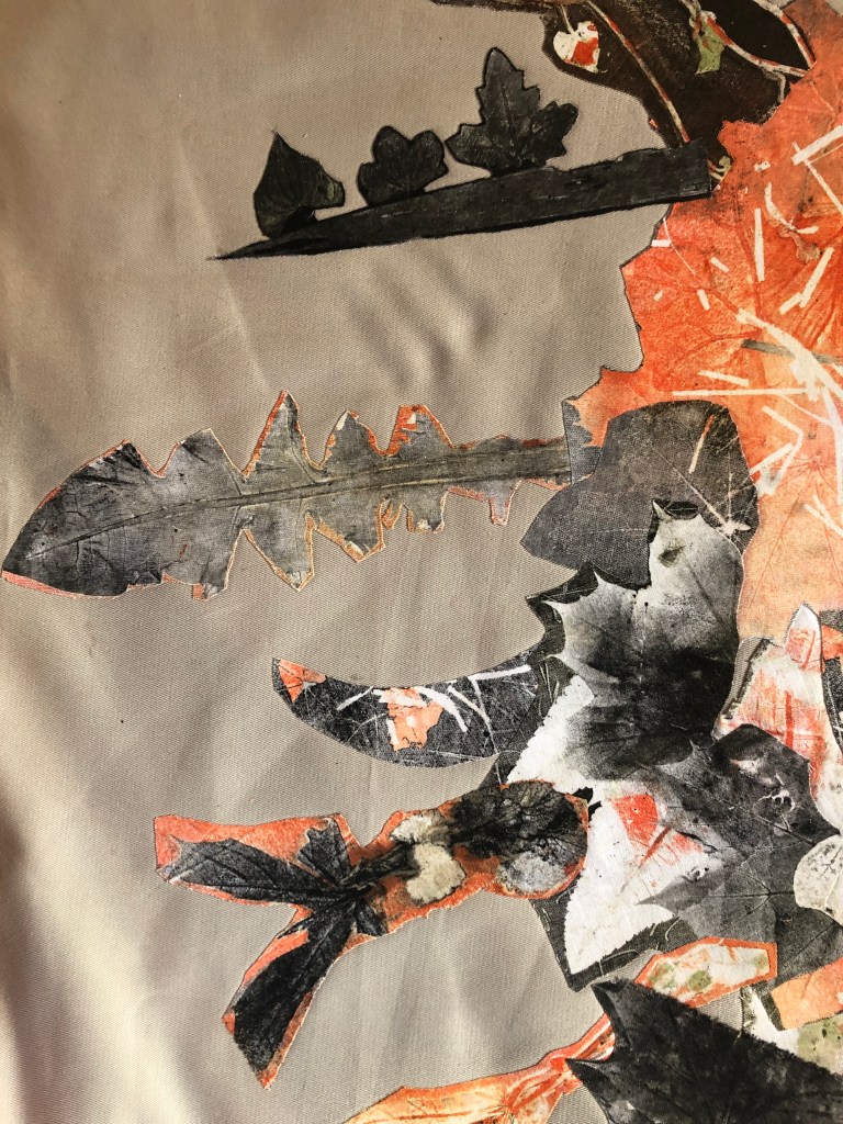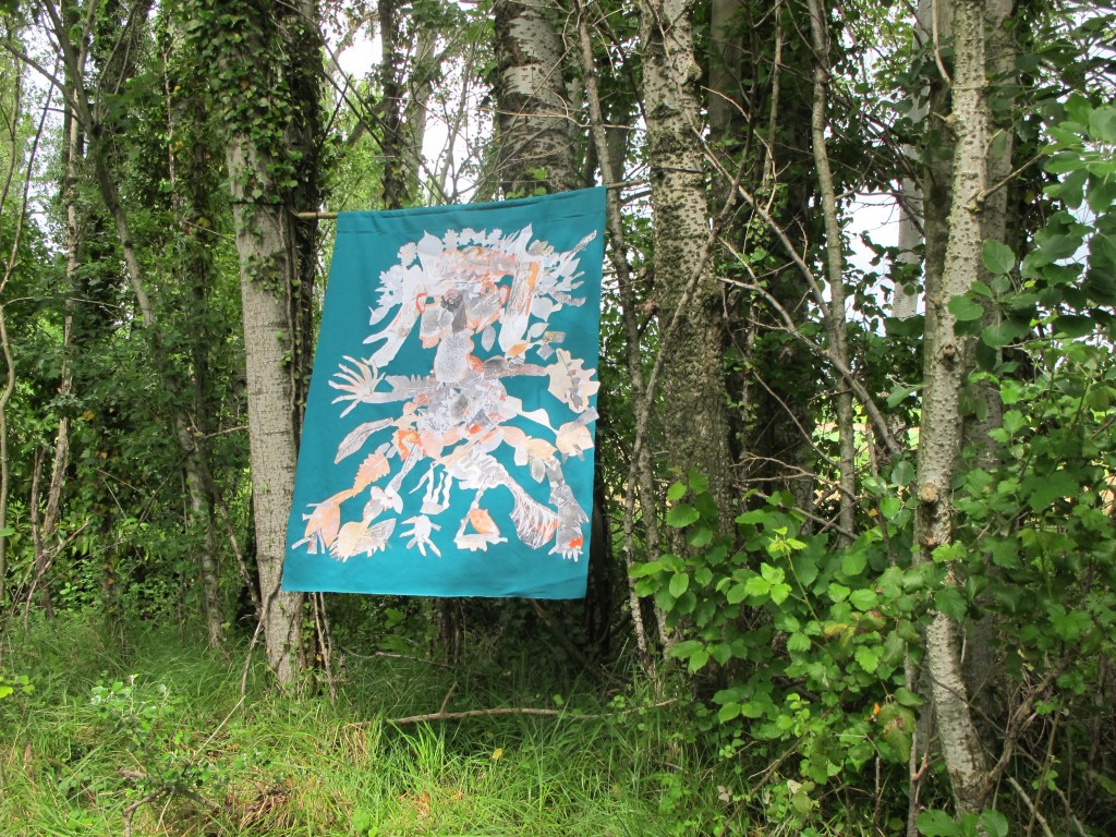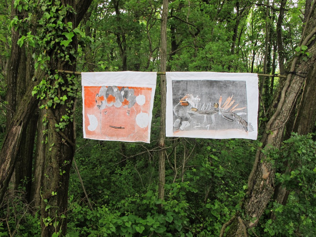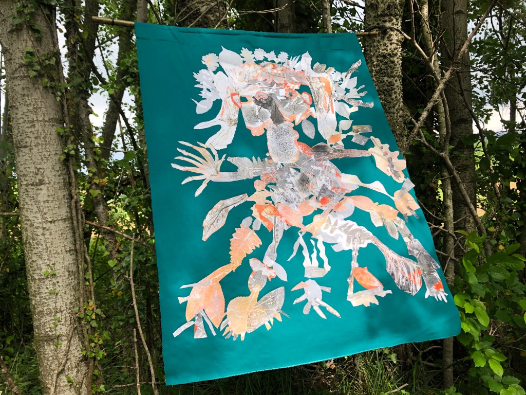 À LA LISIÈRE – teinture à l’indigo avec réserves à l’argile, empreintes des différentes strates de végétaux constituant la lisière environnante. teintures végétales (noix de galle de chêne, avocat, sumac des corroyeurs). Anthotype au jus de curcuma, l’insecte au manteau est directement inspiré du thème pictural de la vierge au manteau exprimant la bienveillance et l’intervention protectrice en faveur des humbles et des faibles.