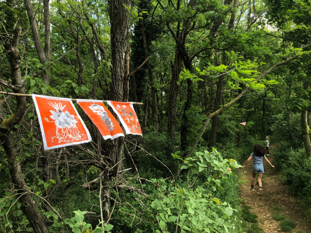Installation des estampes réalisées avec les enfants des centres de loisirs de Jaillans et Chatuzange le long du sentier pour la grande fête du samedi 7 mai à Charpey!