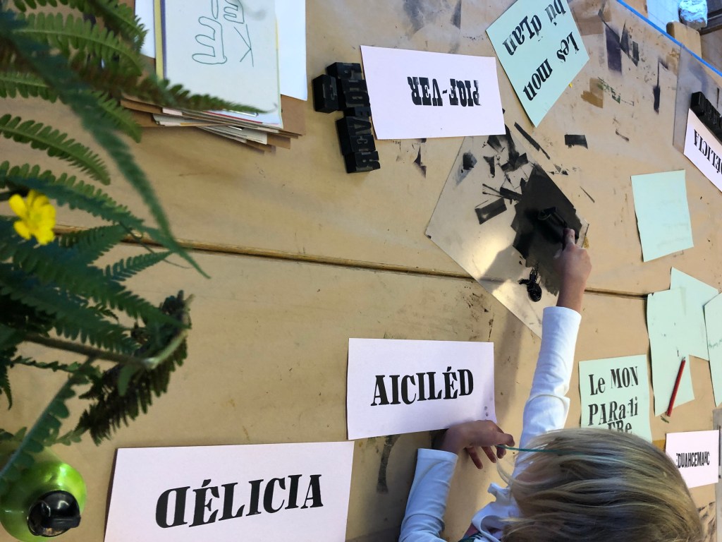 L’école primaire de Saint Hugues de Chartreuse se situe à une vingtaine de minutes à pied de l’Étable, où durant l’été 2017 je présentais un travail mené sur 2 mois de résidence. Les classes ont emprunté le sentier par les bois depuis l’école pour rejoindre l’exposition où j’allais leur présenter mon travail en résonance avec les paysages chartroussins qu’ils et elles habitent également. Sur le chemin retour chacun·e a effectué une récolte de formes, de lignes et de contours de paysage qui allait permettre dans un second temps la réalisation de monotypes sur carrelage dans