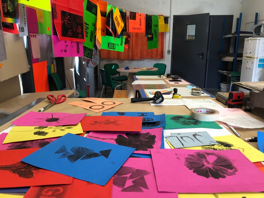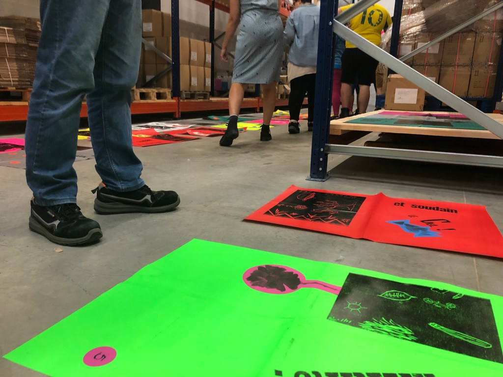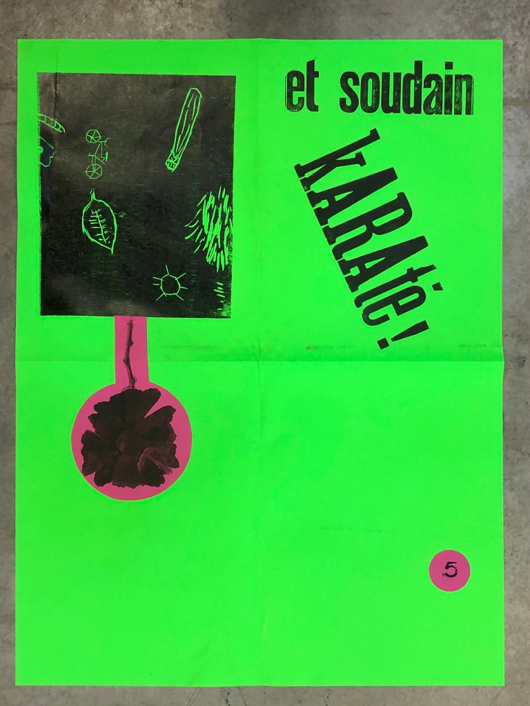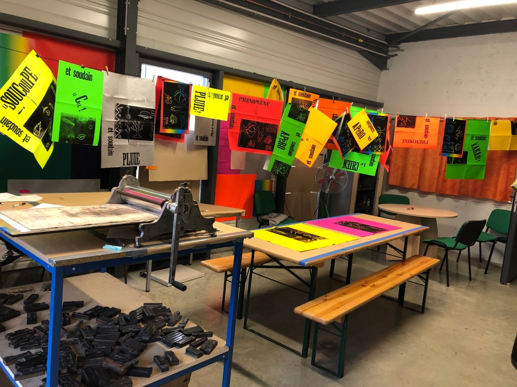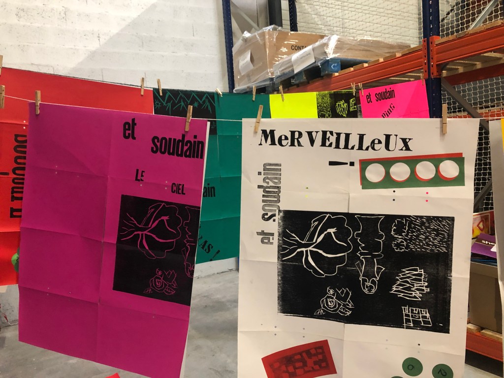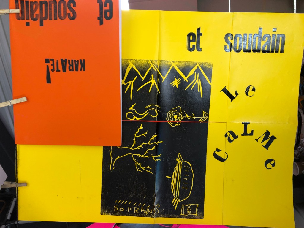 Du 29 août au 5 septembre dernier avec Julia Burtin Zortea nous avons déballé les outils, sorti les encres et décapuchonné les bic dans le local espace vert de l’ESAT de Faverges. Nous avons rencontré les travailleur·euses de cet endroit et fabriqué avec elleux dans les temps interstices de grands posters qui se plient et se feuillettent : gravure sur bois lancé de dés, histoires saugrenues à l’ESAT quand soudain…, monotypes à piocher et chaine de production tamponnée. Une première rencontre chouettement intense, probablement une continuité plus fouillée qui s’annonce, où l’on découvrira peut-être quelles prises de karaté sauvera l’atelier blanchisserie du hold-up !