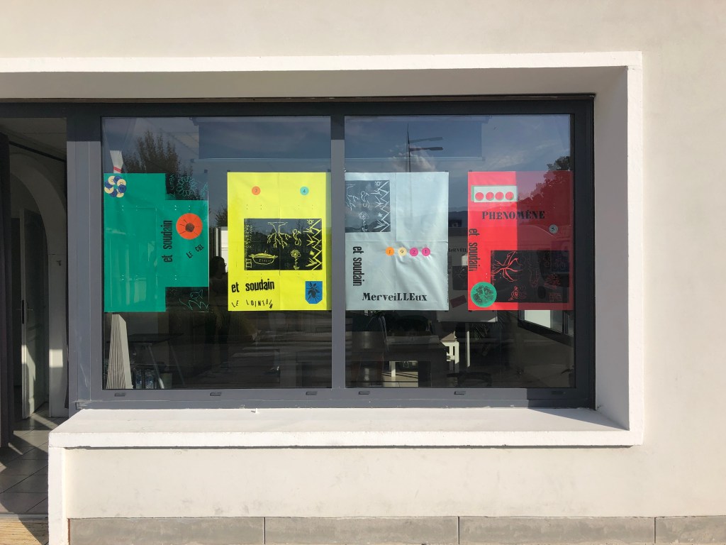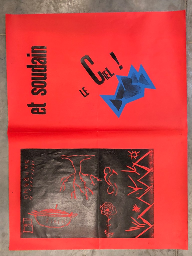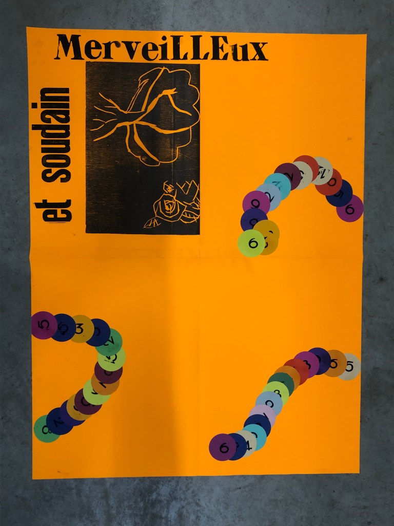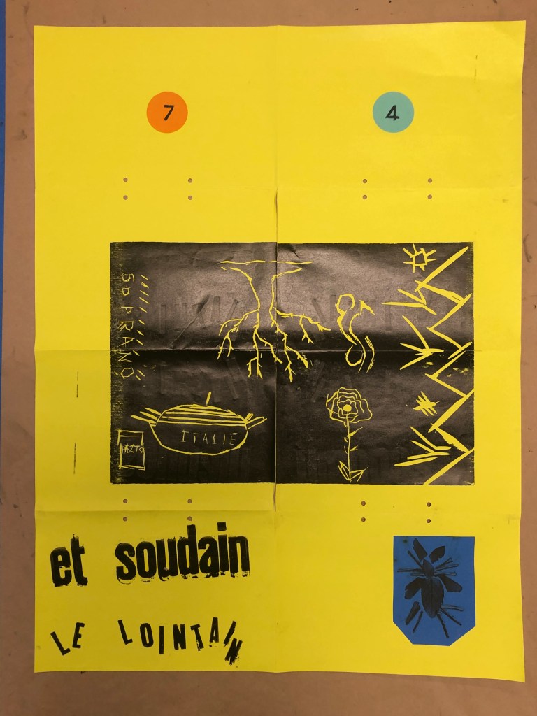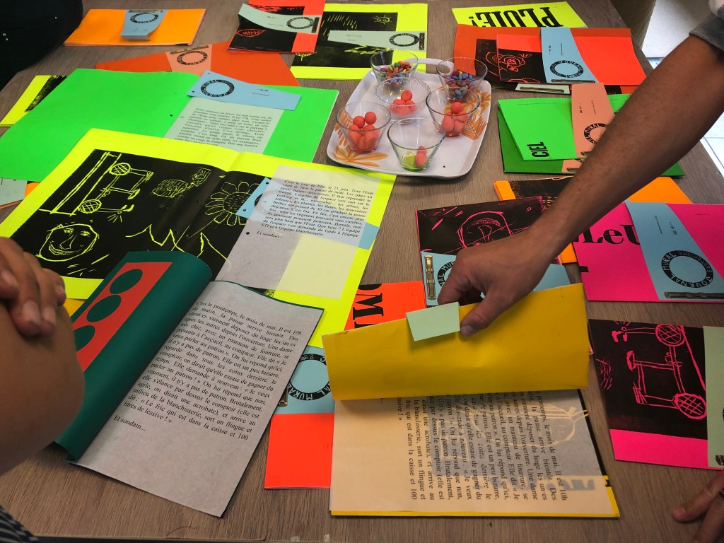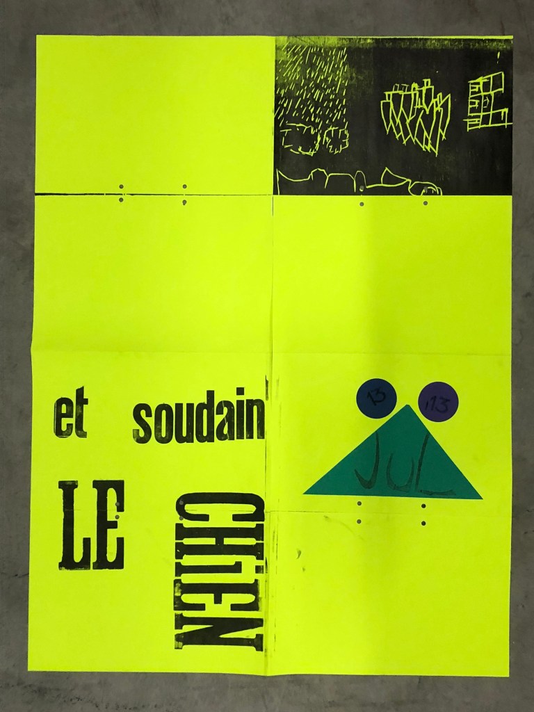 Du 29 août au 5 septembre dernier avec Julia Burtin Zortea nous avons déballé les outils, sorti les encres et décapuchonné les bic dans le local espace vert de l’ESAT de Faverges. Nous avons rencontré les travailleur·euses de cet endroit et fabriqué avec elleux dans les temps interstices de grands posters qui se plient et se feuillettent : gravure sur bois lancé de dés, histoires saugrenues à l’ESAT quand soudain…, monotypes à piocher et chaine de production tamponnée. Une première rencontre chouettement intense, probablement une continuité plus fouillée qui s’annonce, où l’on découvrira peut-être quelles prises de karaté sauvera l’atelier blanchisserie du hold-up !