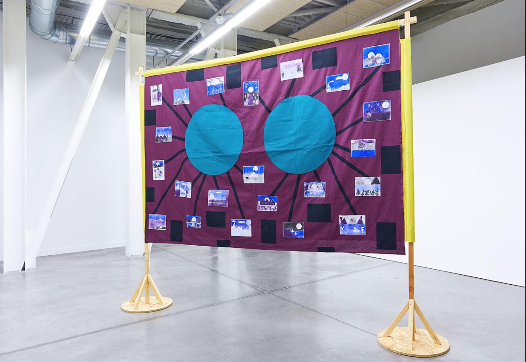 Cette structure de bois soutient une grande tenture en textile réalisée à l’issue du projet d’ateliers artistiques « Itinéraires » mené simultanément avec 3 groupes de personnes détenues sur 3 sites (CD de Salon de Provence, MA Aix-Luynes, SAS Aix-Luynes) du 17 avril au 27 avril 2023, sur une invitation du Frac Sud.