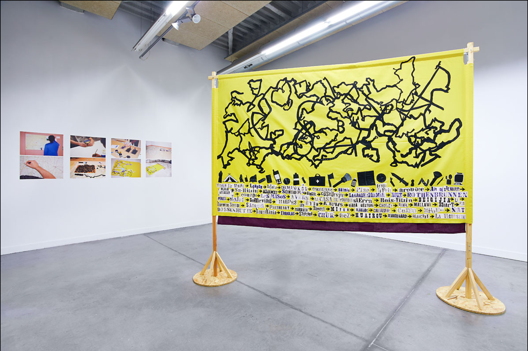 Les cartes postales imprimées en monotype et les cartes géographiques annotées ont été récupérées par les participants. Le reste de la matière fabriquée au fil des séances d’ateliers a été agencée sur textile par Diane Etienne à l’issue des interventions.