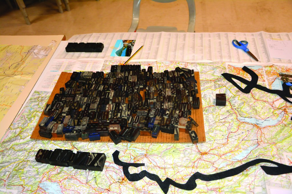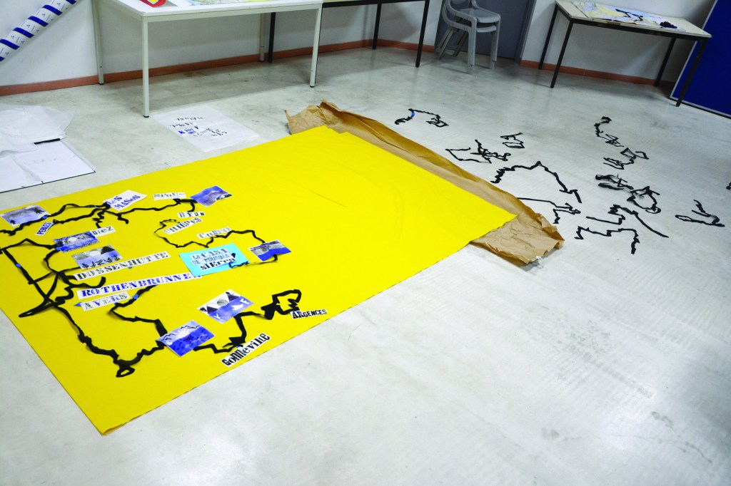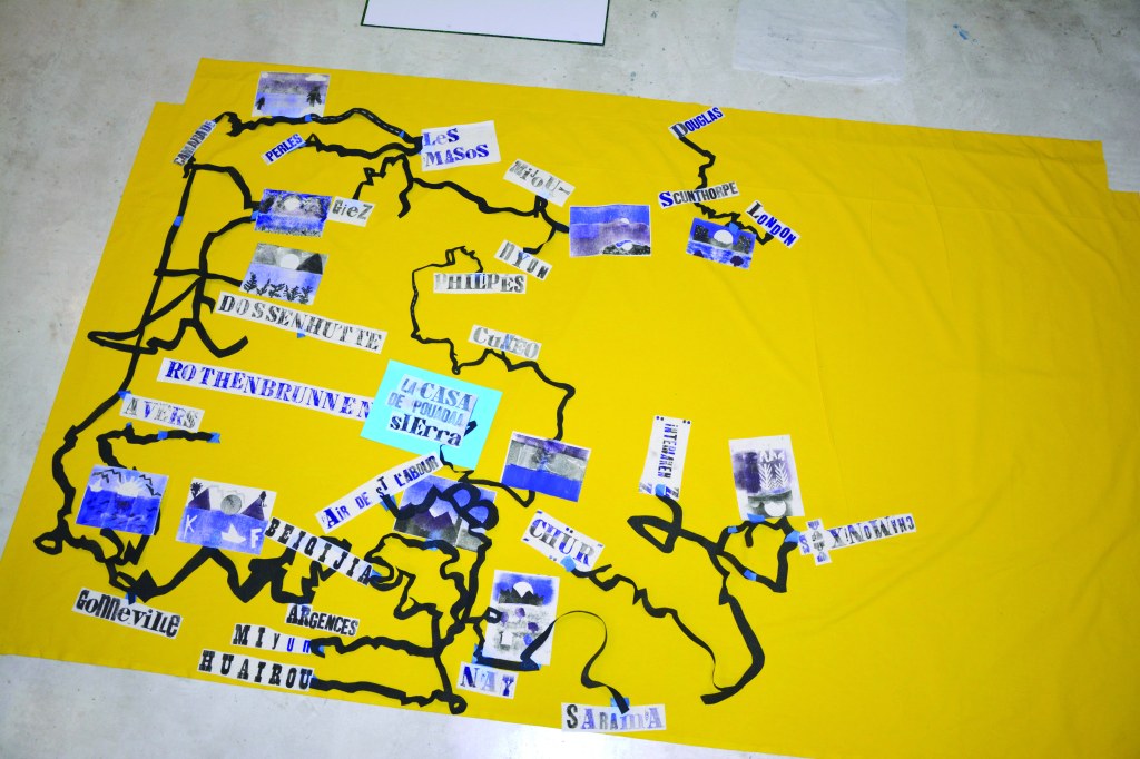 Les cartes postales imprimées en monotype et les cartes géographiques annotées ont été récupérées par les participants. Le reste de la matière fabriquée au fil des séances d’ateliers a été agencée sur textile par Diane Etienne à l’issue des interventions.