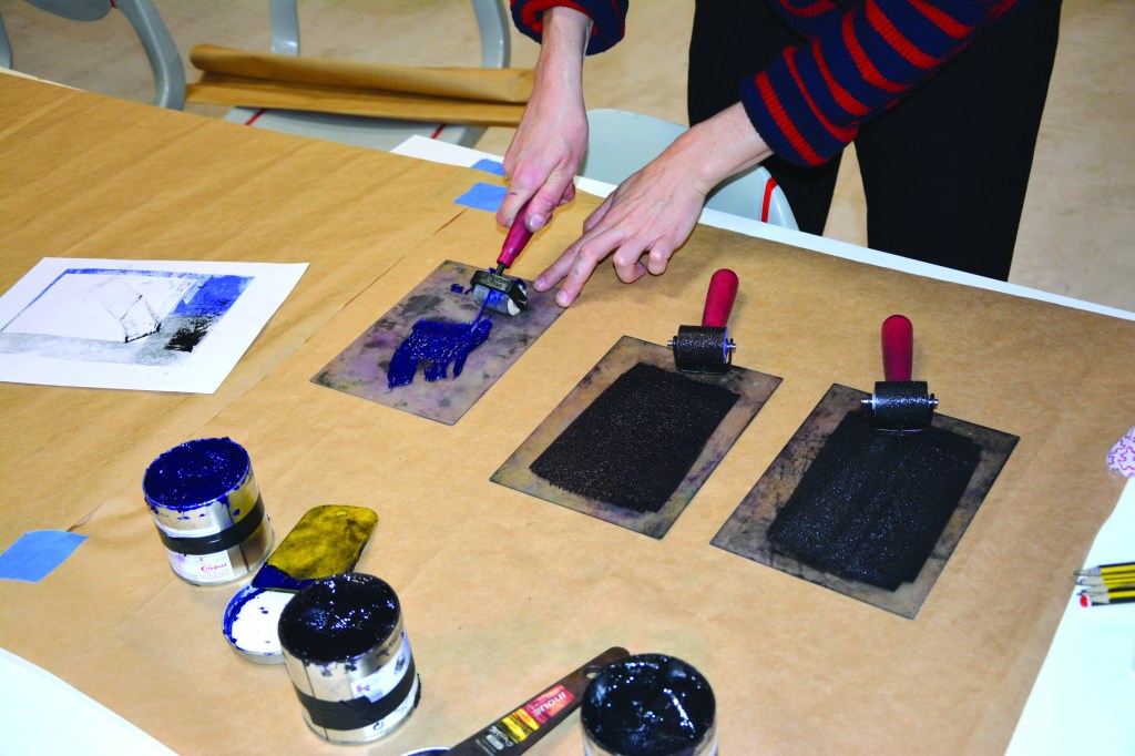 La grande gravure collective, une fois gravée, – ribambelle marionnettes d’ombres plancher couronne et grimaces – fut ensuite encrée et imprimée en deux grands kakémonos de cotons pour se joindre à l’ambiance festive. La plaque ensuite découpée, nous avons réalisé des tirages à emporter grâce à la presse à épreuve typographique !
