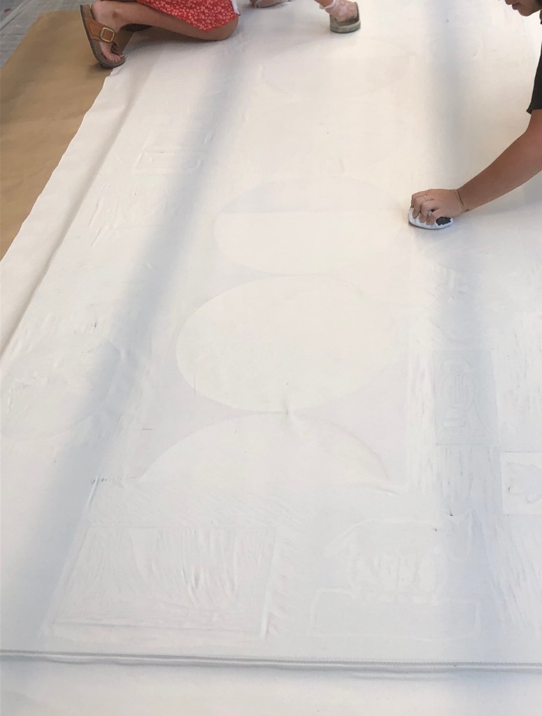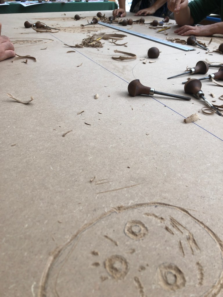 Août 2024 – Escale dans la cour du vieux temple : iconothèque déployée, les gouges en majesté et la grande matrice de bois qui sera gravée au fil de l’atelier sur la semaine du festival.