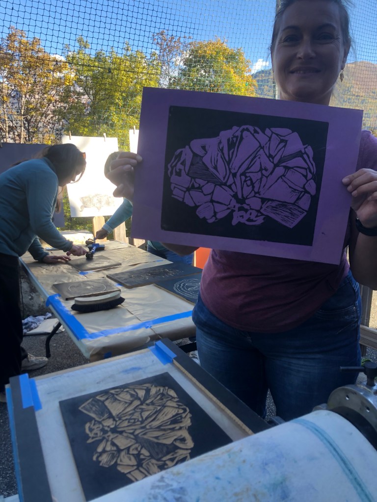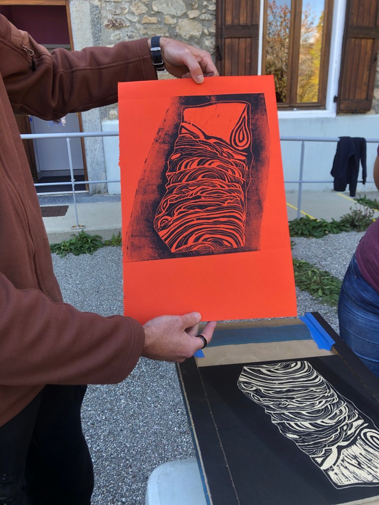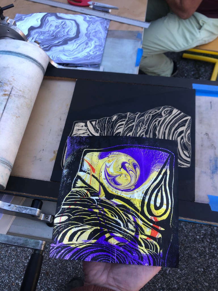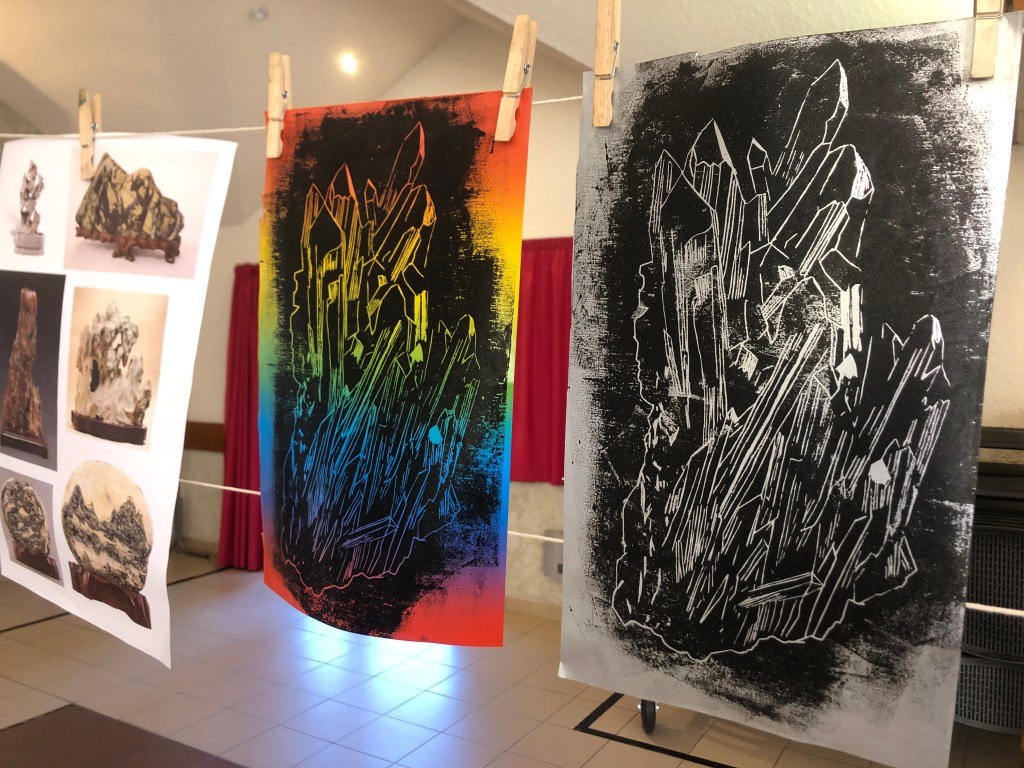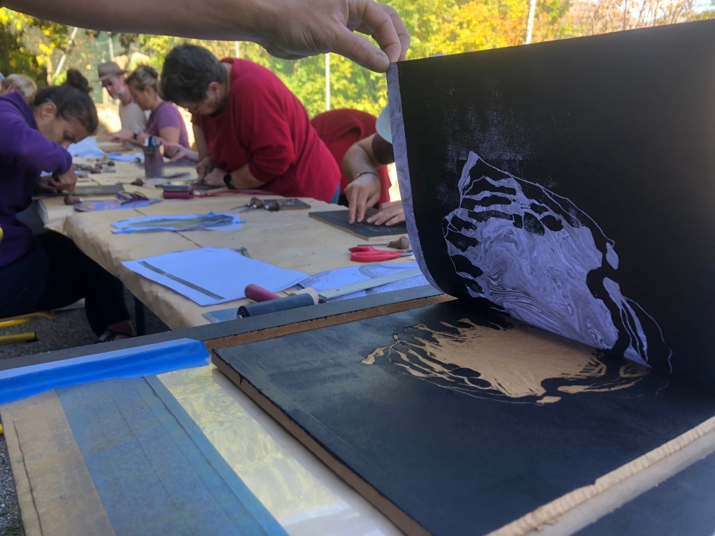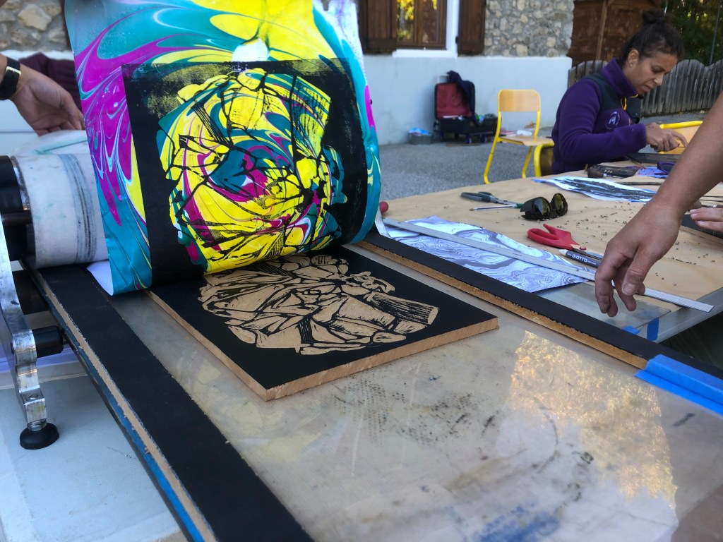 Chaque atelier a abordé une technique d’image imprimée différente (gravure sur bois, gravure pointe sèche, marbrure, suminagashi, collagraphie/monotype).